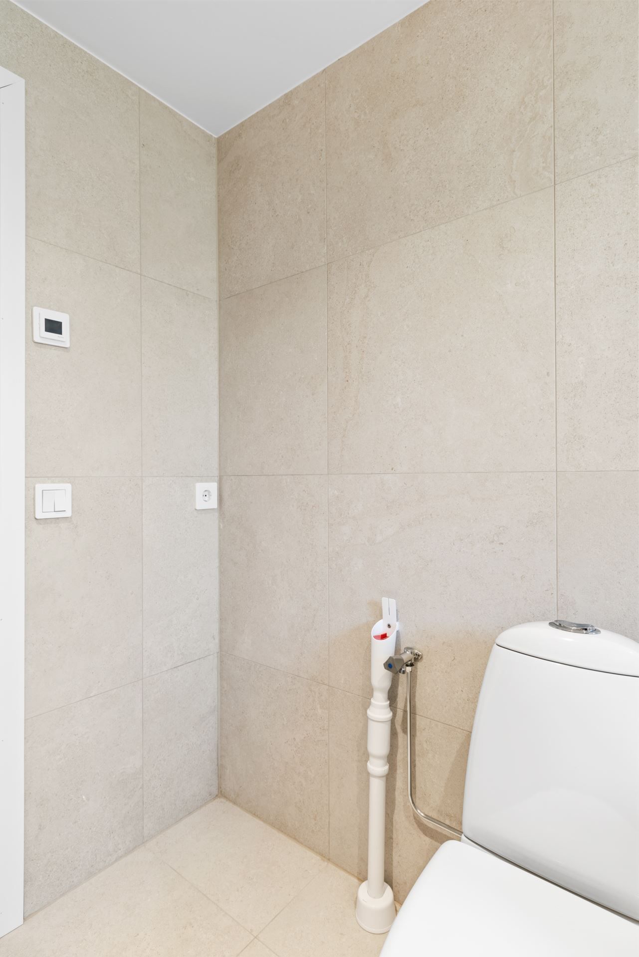Badrummet är utfört i beiga, sobra toner med kakel som skapar en varm och exklusiv känsla. Utrustningen är ny och genomtänkt med toalett, dusch och handfat i stilren design. För den som önskar finns dessutom möjlighet att installera tvättmaskin – en uppskattad bekvämlighet som ger extra flexibilitet i vardagen.
