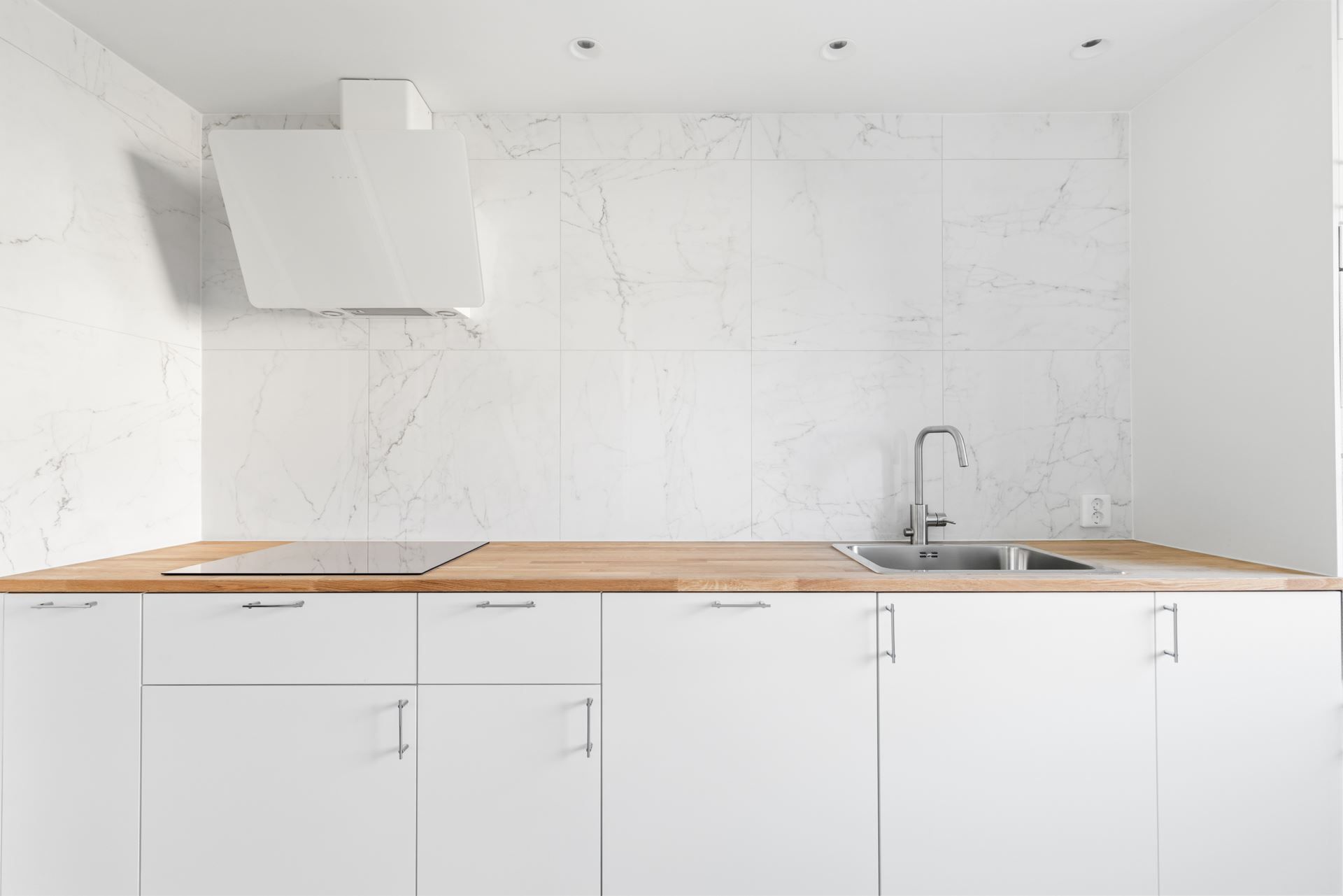Köket är smakfullt utformat med rena linjer och generösa arbetsytor. Här kombineras funktion och design på ett sätt som gör rummet lika självklart för vardagens måltider som för sociala middagar med vänner. Förvaringsmöjligheterna är goda och helhetsintrycket är modernt.