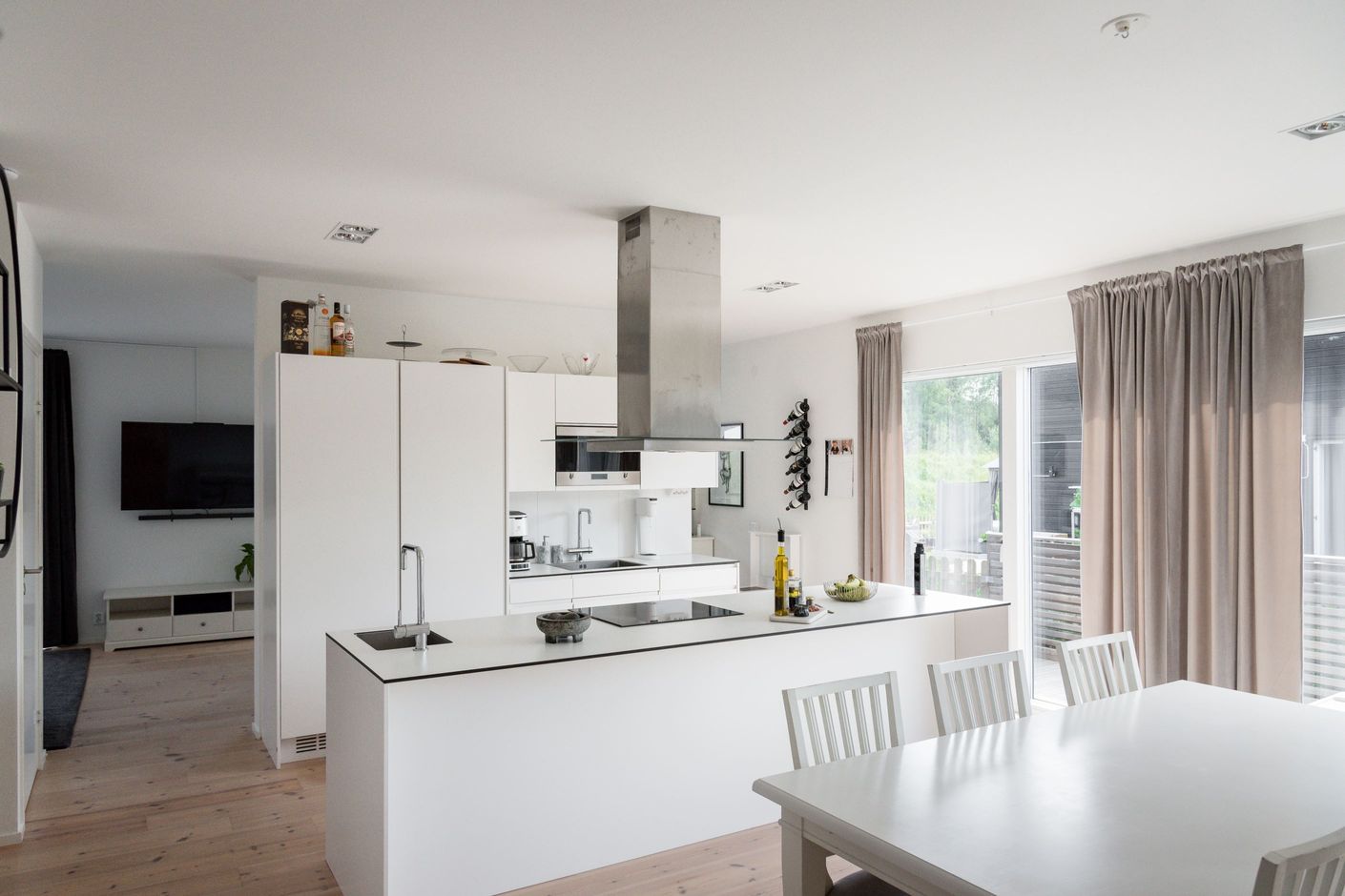Genomgående är upplevs parhuset exklusivt och är i mycket gott skick. I samtliga rum bortsett från entré och badrum ligger vackra massiva ljuslaserade trägolv, stort kök med rejäl köksö och påkostade vitvaror (SMEG). Stort vardagsrum med generösa fönster med utgång till till den stora altanen och plana gräsmattan.