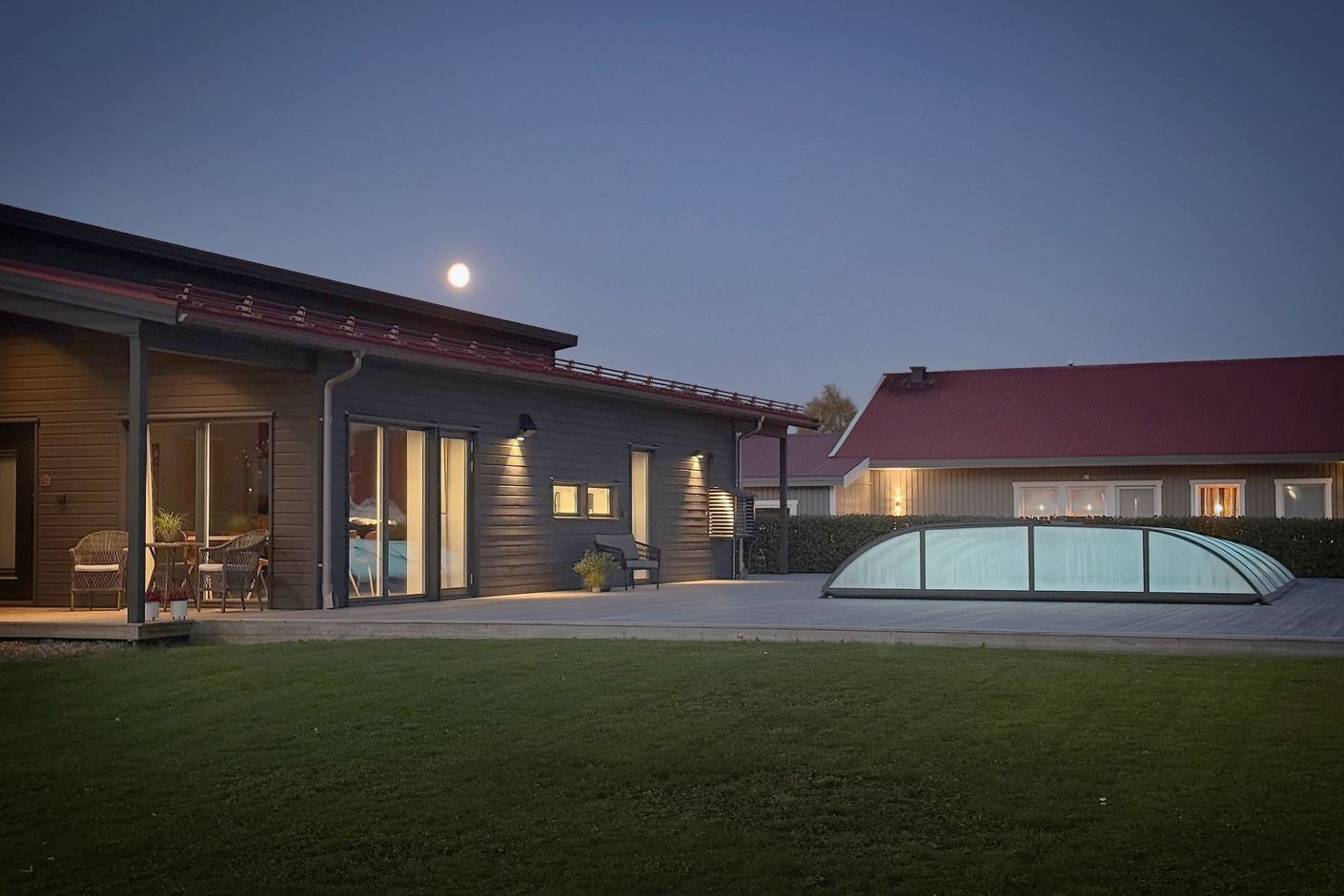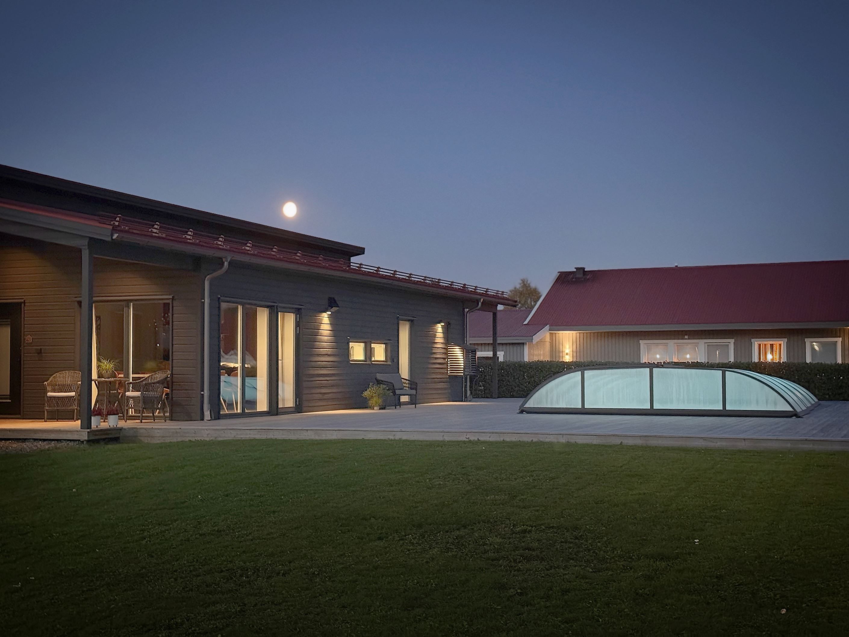 Här erbjuds ett stilrent boende med hög kvalitet i både materialval och utförande. Genomtänkt arkitektur som möjliggör uthyrningsdel eller kontor/mottagning med egen ingång. Boytan om 138 m² kompletteras med 64 m² biarea, inklusive ett inbyggt garage med extra bred och hög port från Crawford. Det är även förberett för elbilsanslutning.