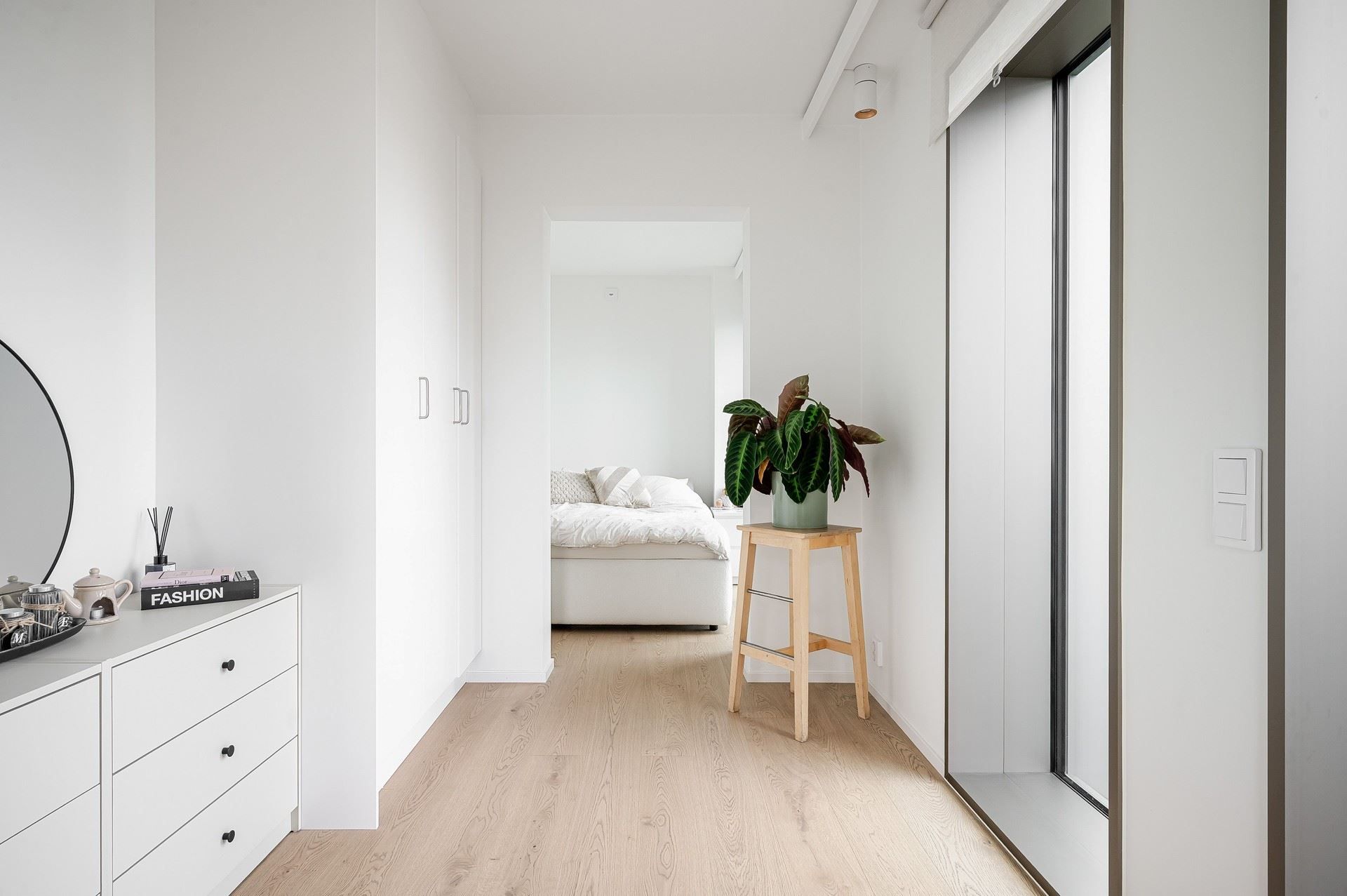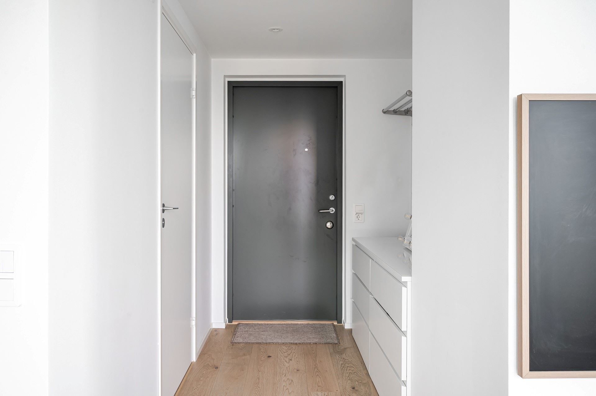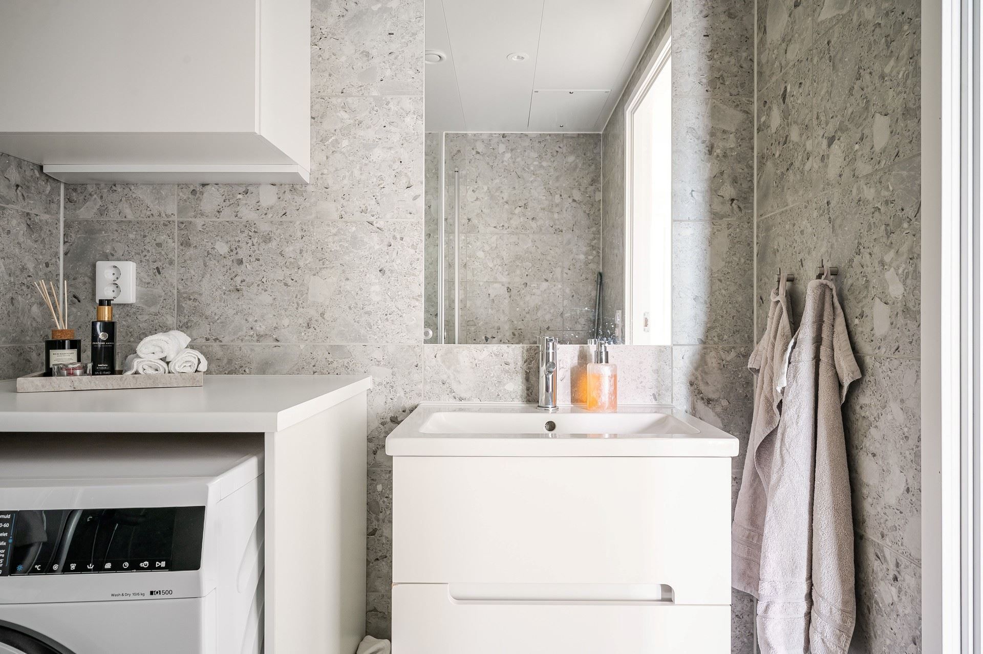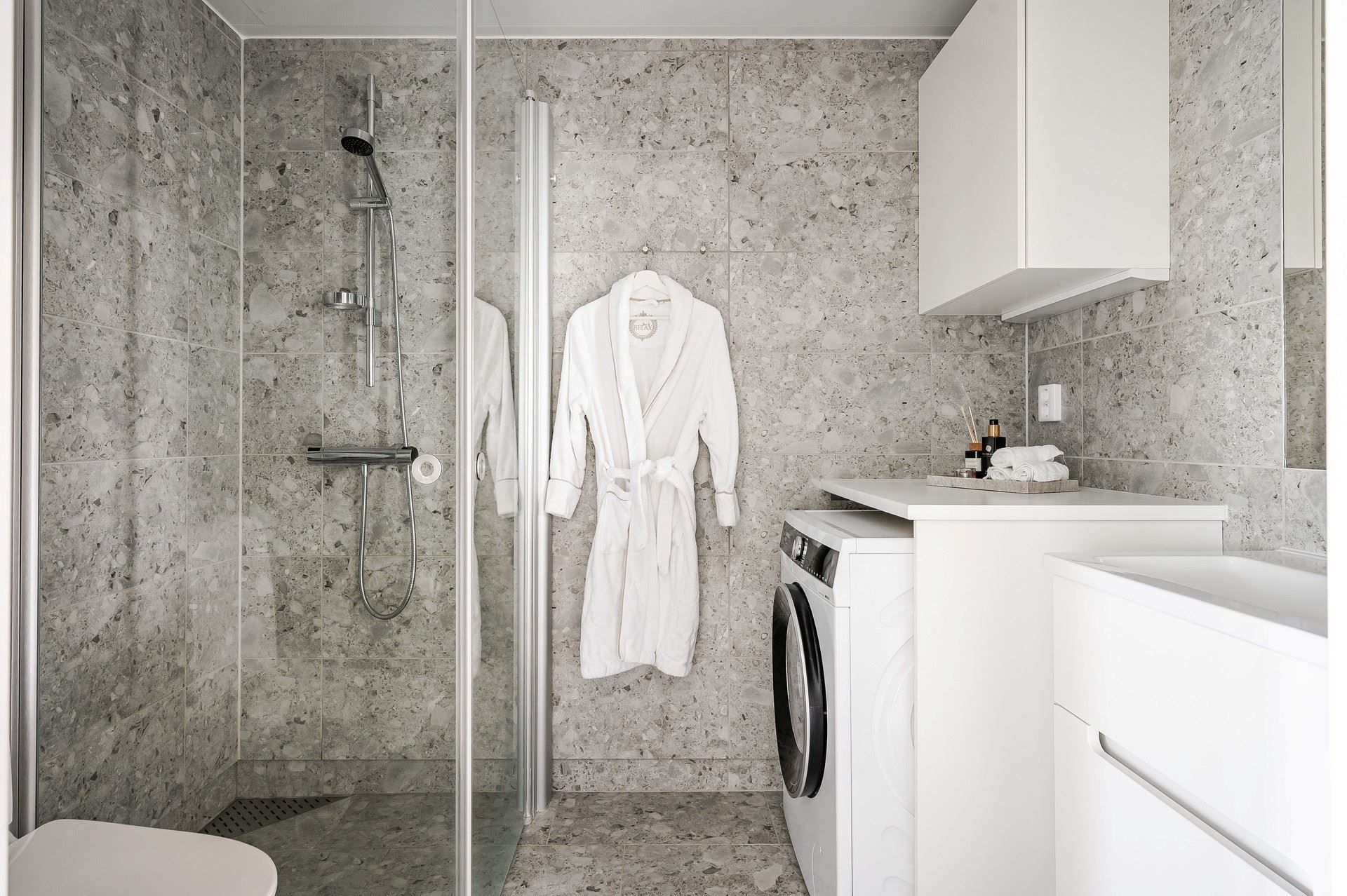 Bostaden har vitmålade väggar, gråpigmenterat ekgolv och köksmöbler från Vedum i sandbeige kulör med en rostfri bänkskiva med integrerad diskho. Badrummets väggar och golv är av grå keramiska plattor i terrazzomönster. Vitvaror från Siemens; induktionshäll, kombinationsugn med mikrovågsugn, diskmaskin, kyl med frysfack samt kombimaskin (tvättmaskin och torktumlare) i badrum. Ytterdörren är en säkerhetsdörr i stål. Bostaden har genomgående vattenburen golvvärme samt elvärme i badrum.