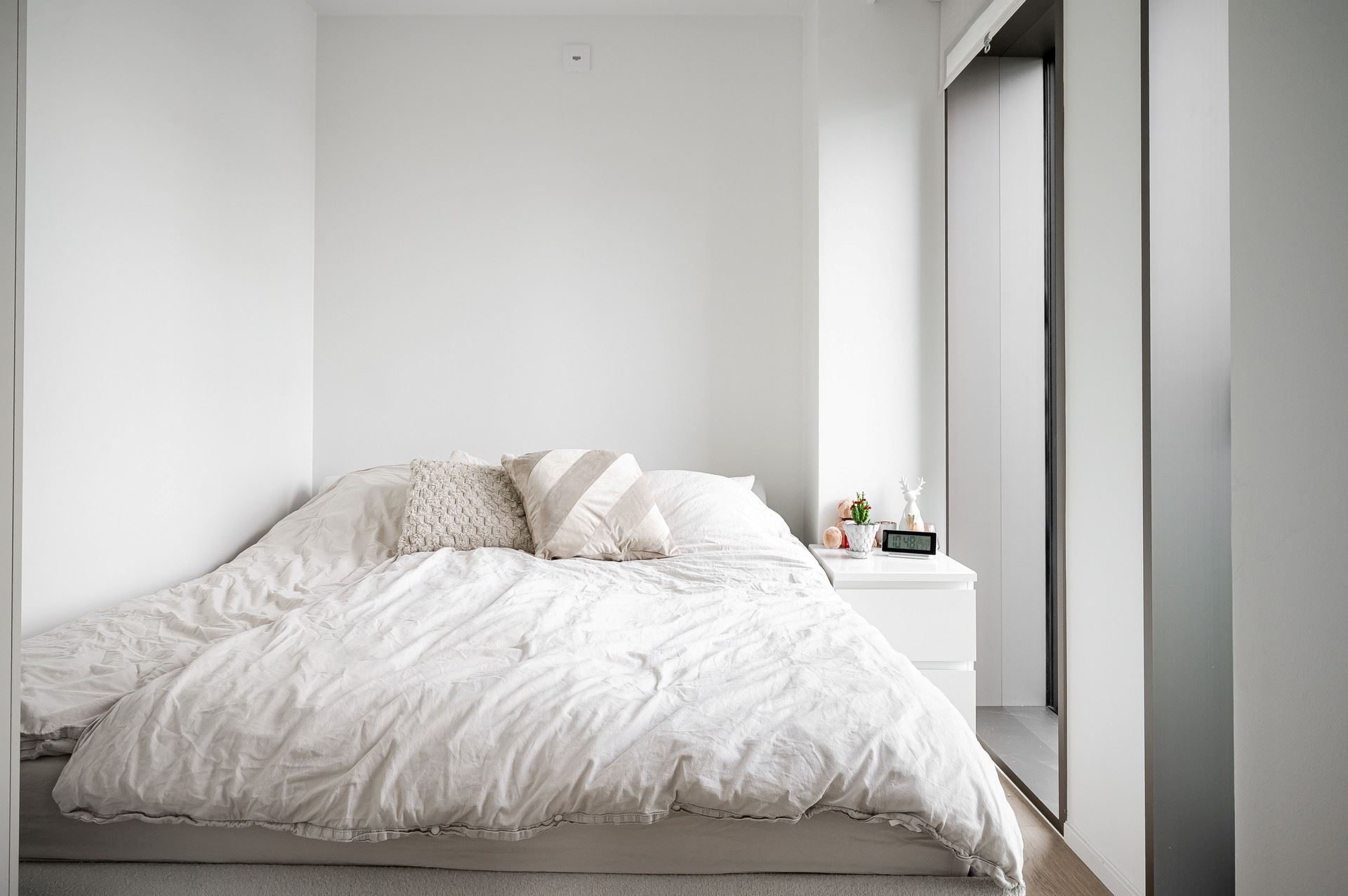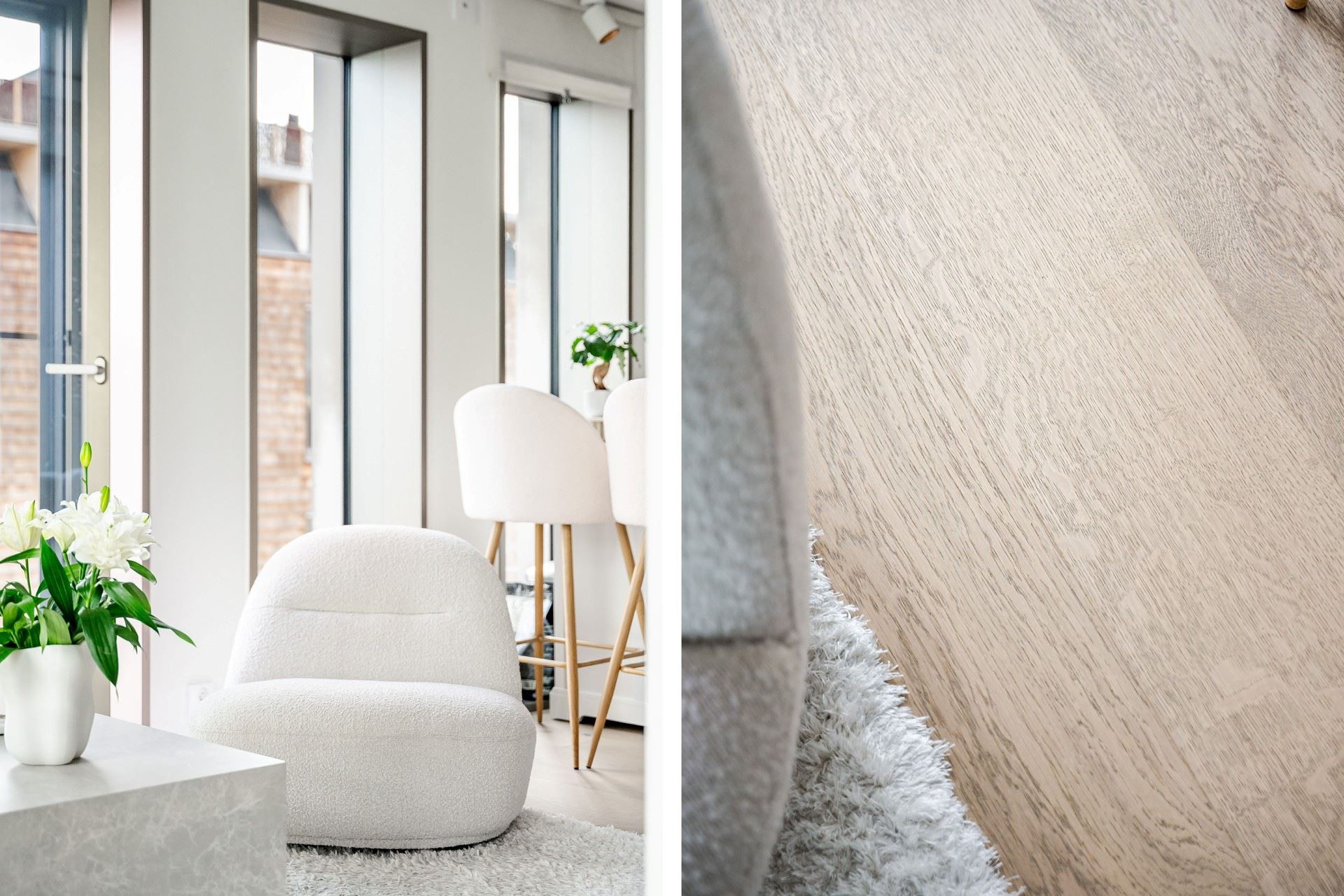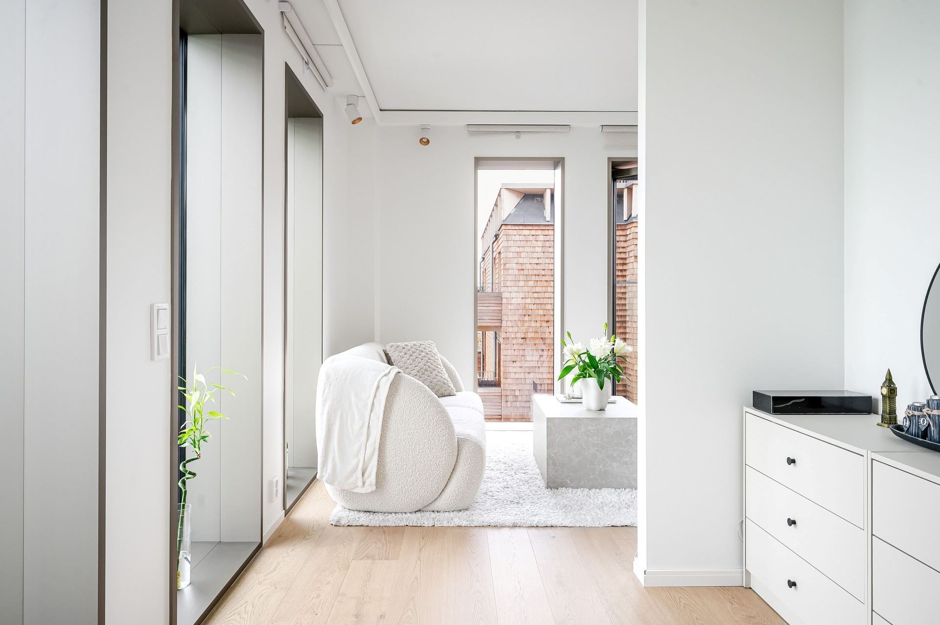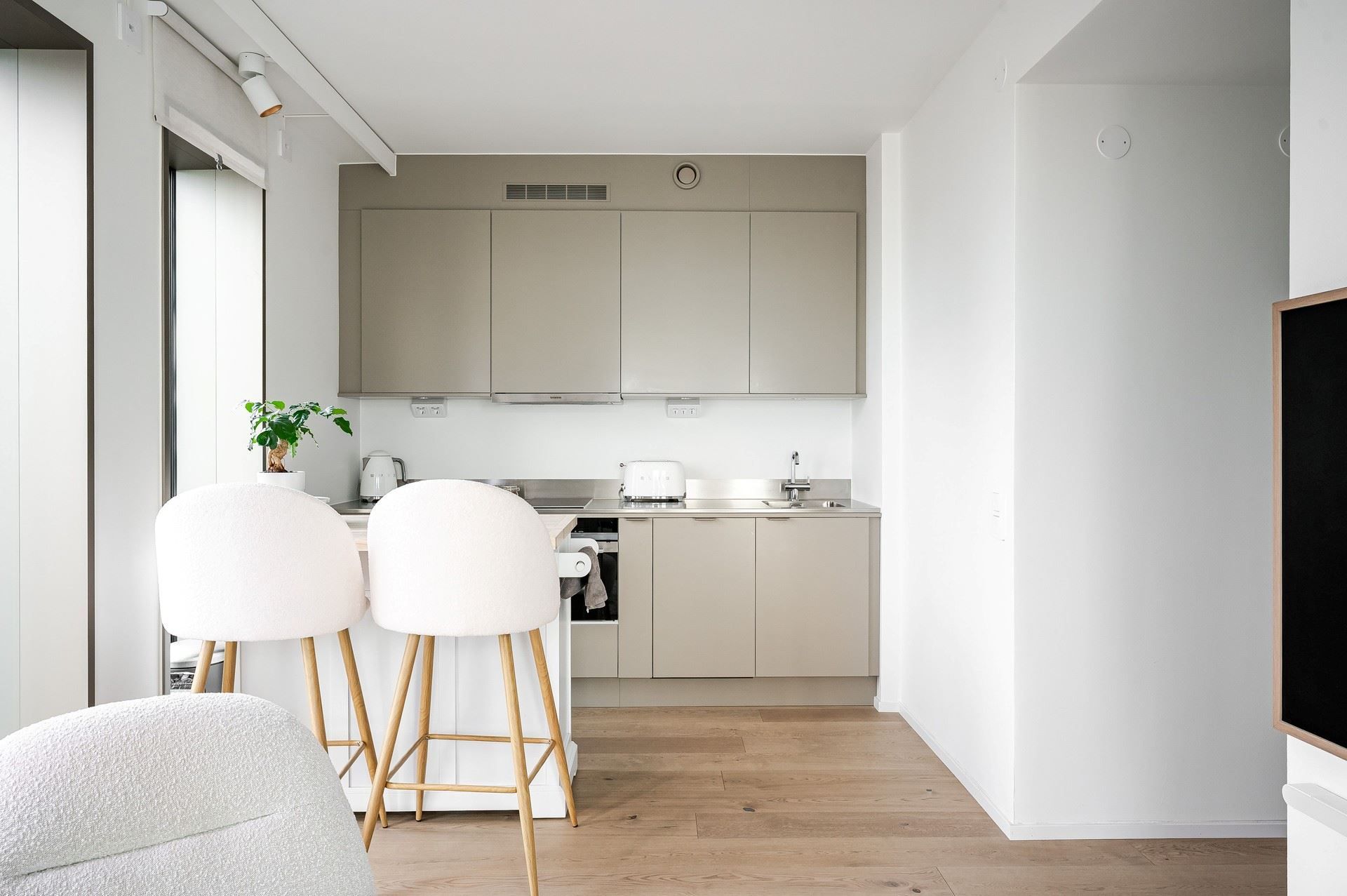 Bostaden har vitmålade väggar, gråpigmenterat ekgolv och köksmöbler från Vedum i sandbeige kulör med en rostfri bänkskiva med integrerad diskho. Badrummets väggar och golv är av grå keramiska plattor i terrazzomönster. Vitvaror från Siemens; induktionshäll, kombinationsugn med mikrovågsugn, diskmaskin, kyl med frysfack samt kombimaskin (tvättmaskin och torktumlare) i badrum. Ytterdörren är en säkerhetsdörr i stål. Bostaden har genomgående vattenburen golvvärme samt elvärme i badrum.