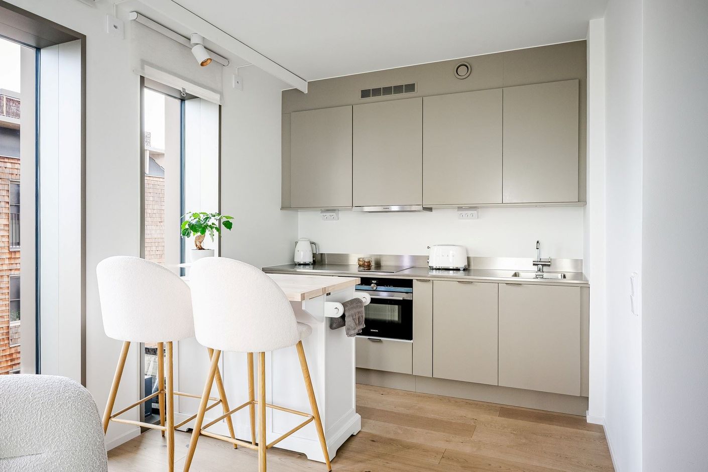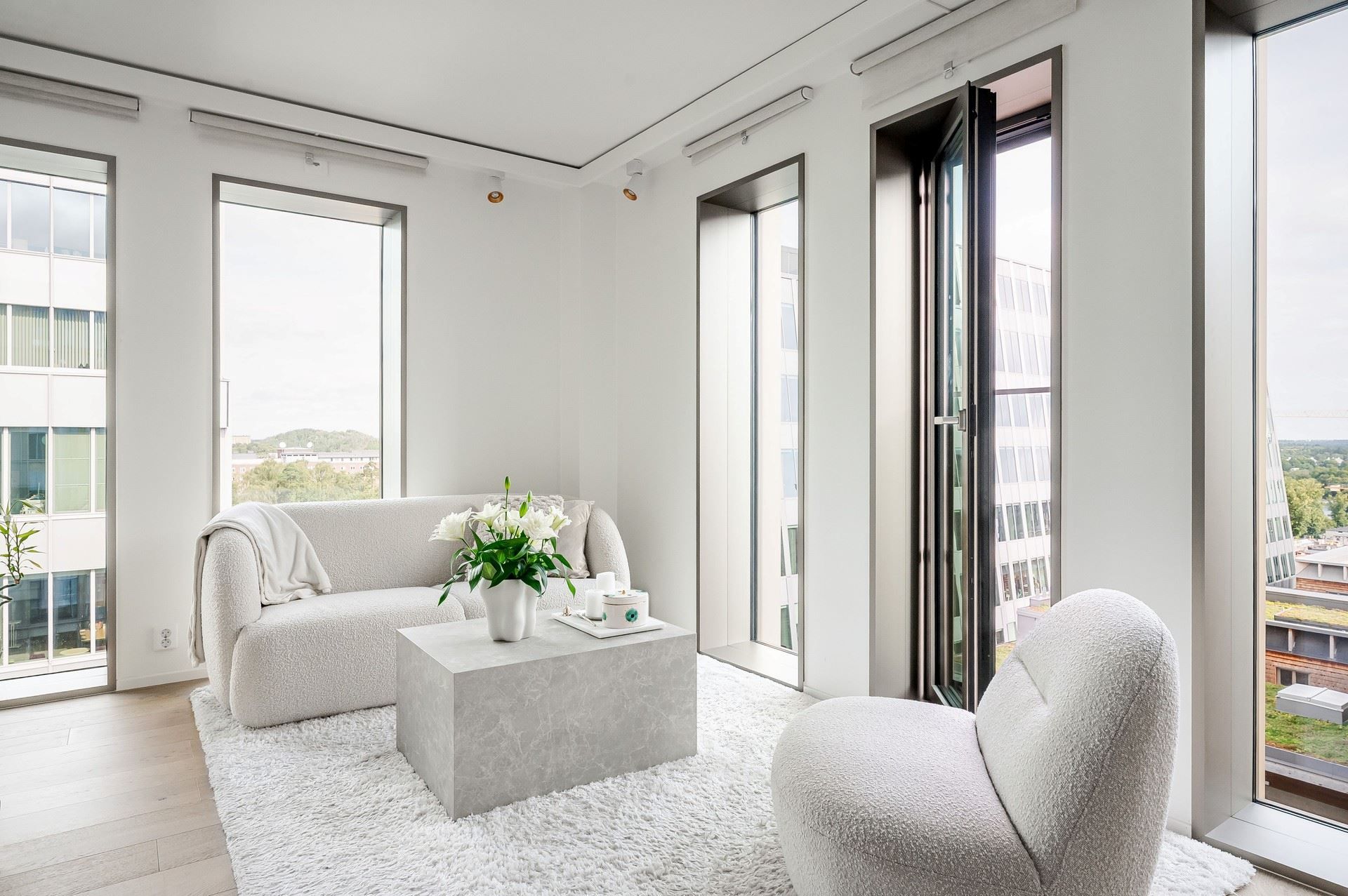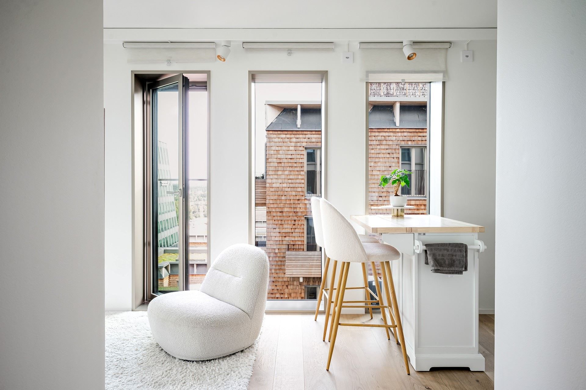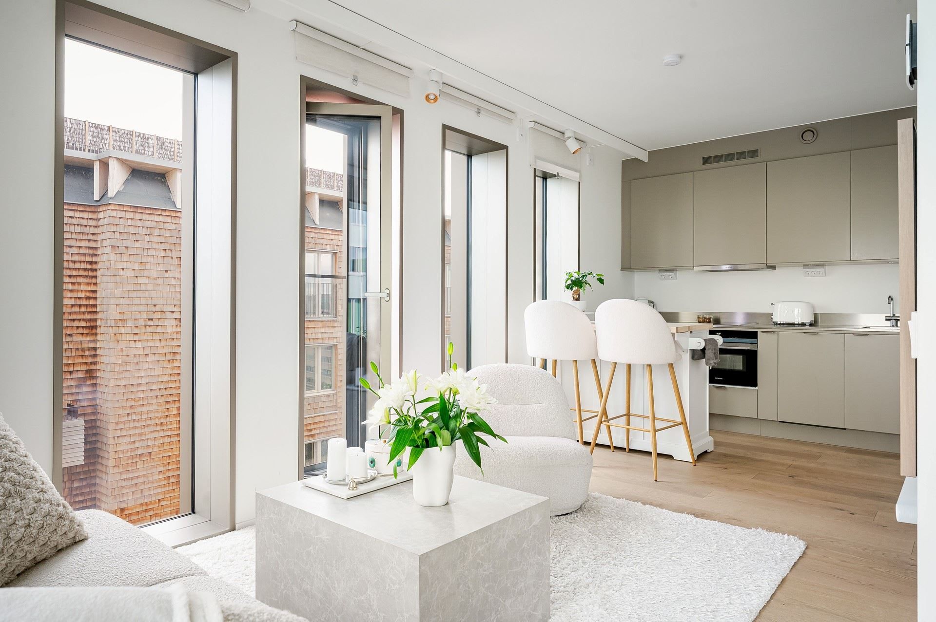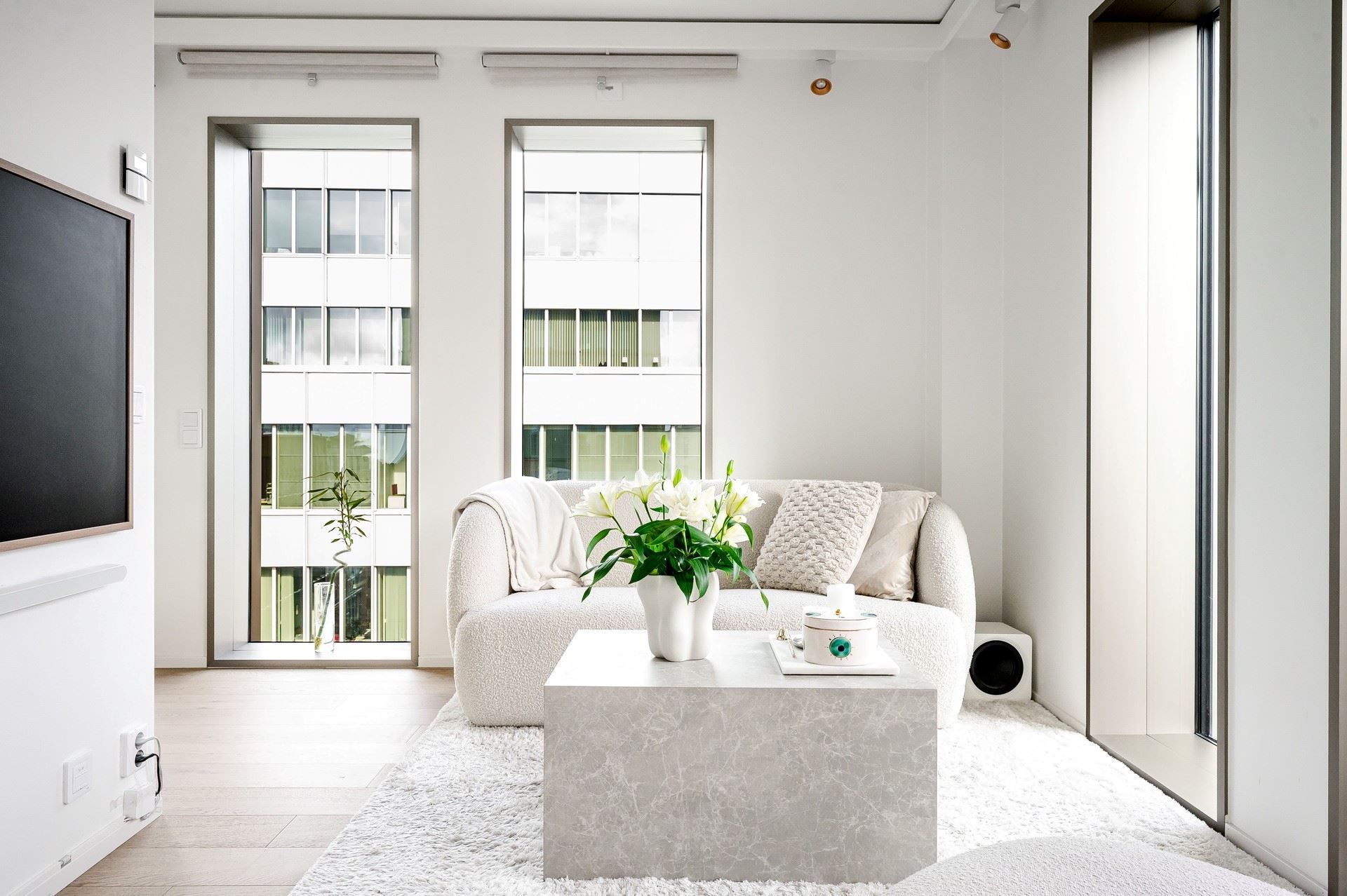 Lägenheten är stilfullt designad med påkostade materialval i kök och badrum och erbjuder hela nio fönster som löper från golv till tak, varav två med franska balkonger (i kök och sovrumsdel). Synnerligen utmärkt disponering med öppen planlösning mellan kök och vardagsrum samt ett perfekt sovrumsdel som rymmer dubbelsäng.