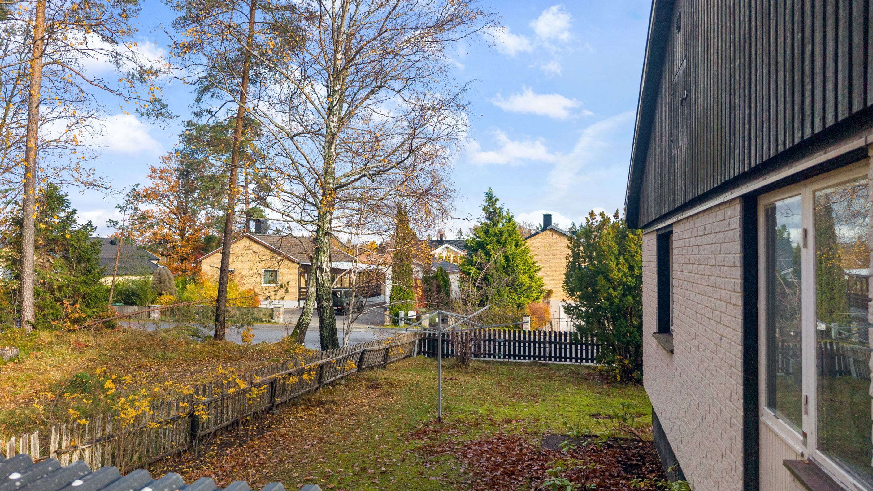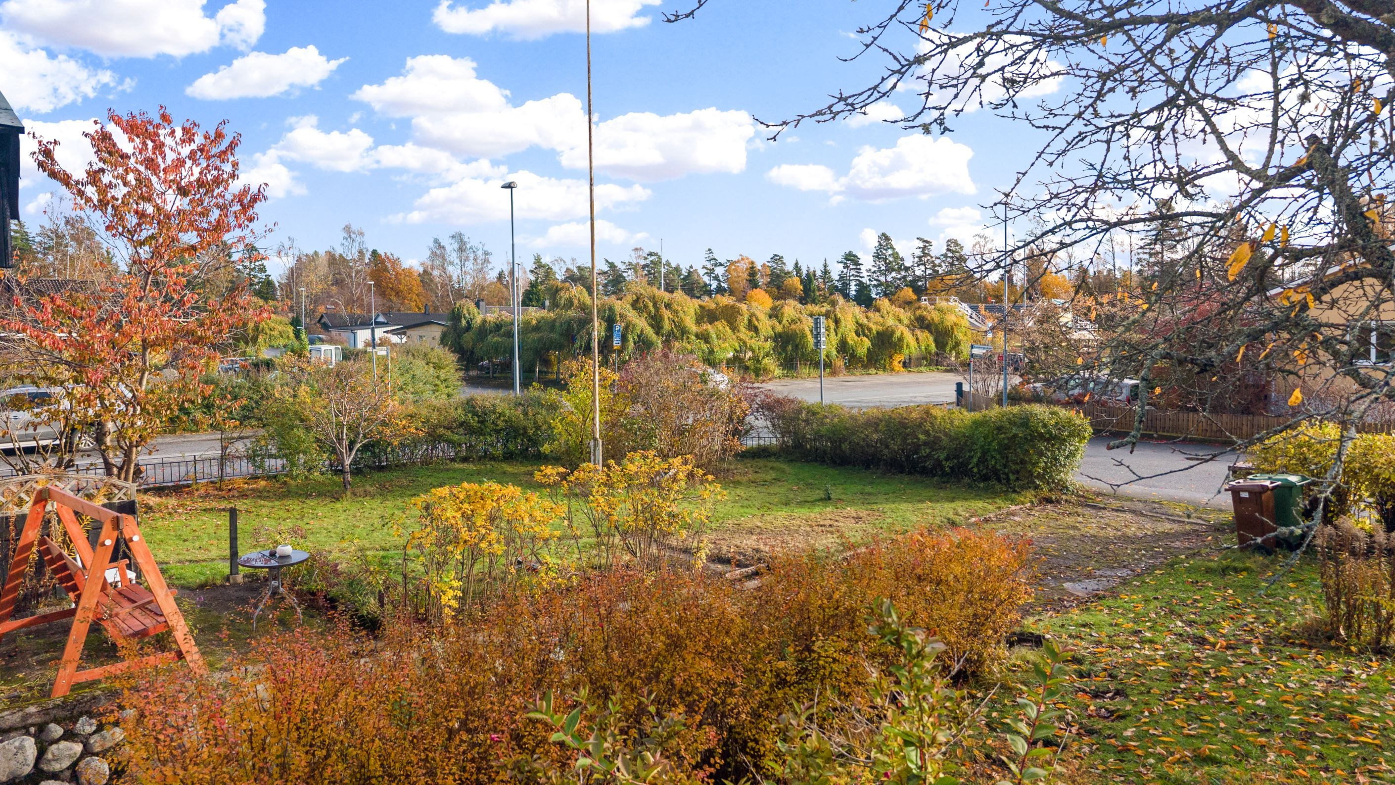 Den fina hörntomten om ca 912 kvm är en av fastighetens stora tillgångar. Här finns plats för lek, odling och flera uteplatser. Garaget i källaren och den rymliga uppfarten ger utrymme för bil, hobby eller extra förvaring.