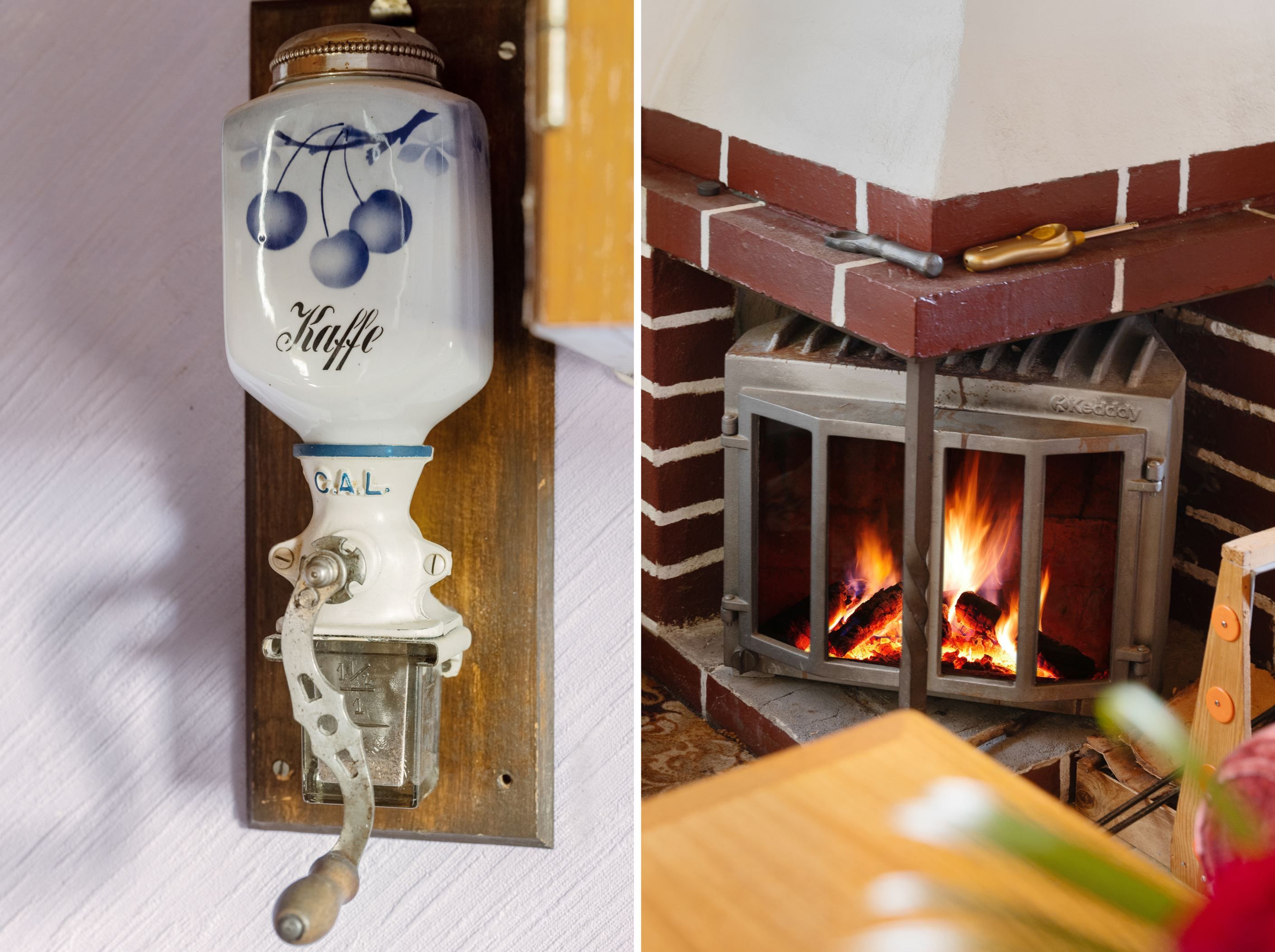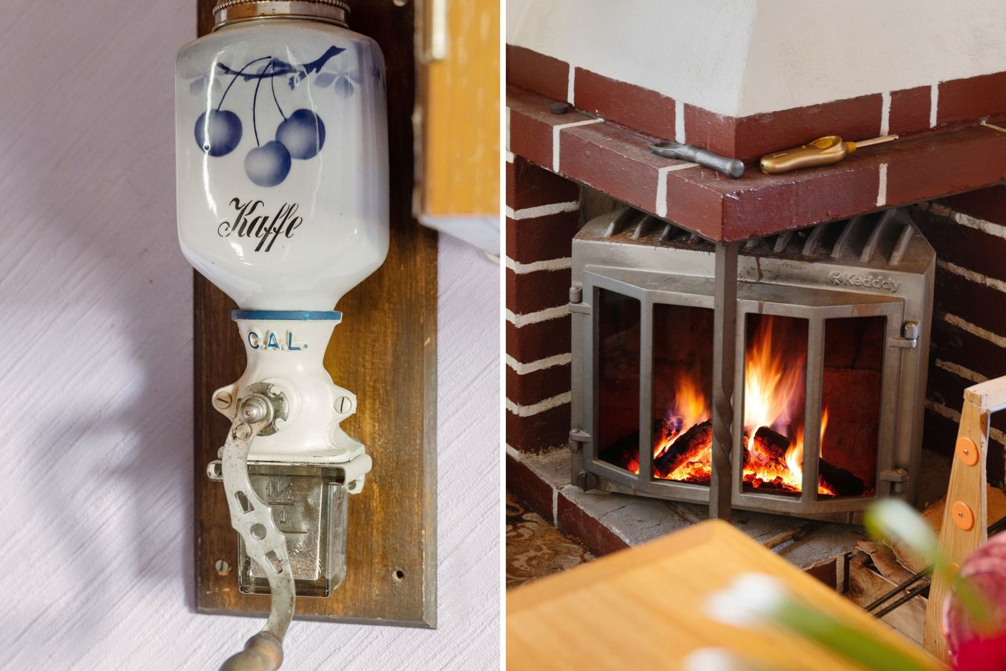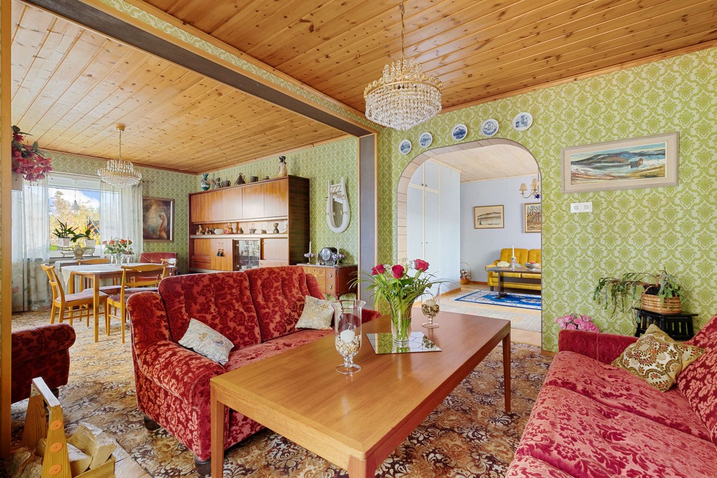 Vardagsrummet är rymligt och ligger i vinkel med generöst ljusinsläpp från stora fönsterpartier. Här finns gott om plats för både soffgrupp och matsalsdel – och dessutom en öppen spis som höjer mysfaktorn.