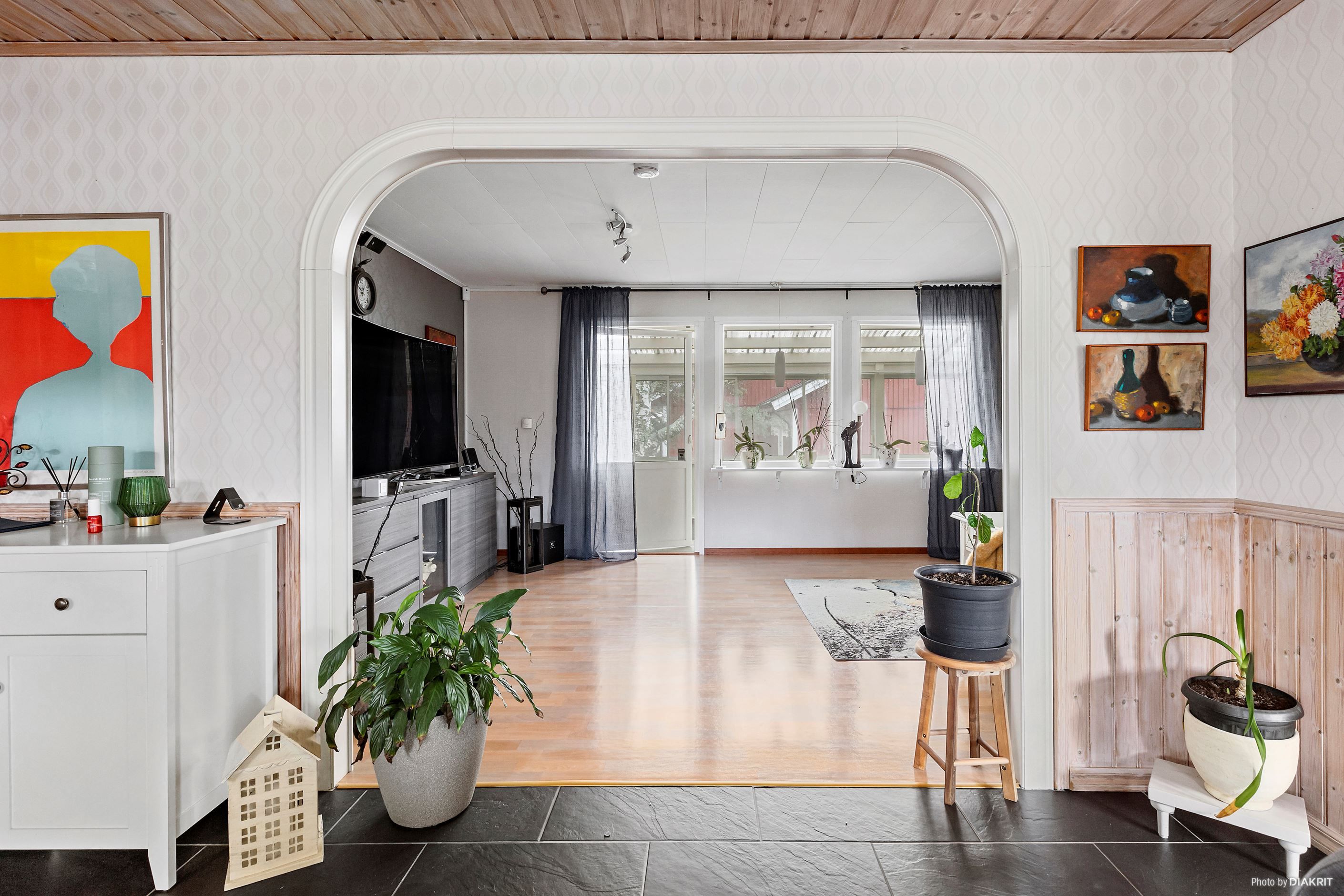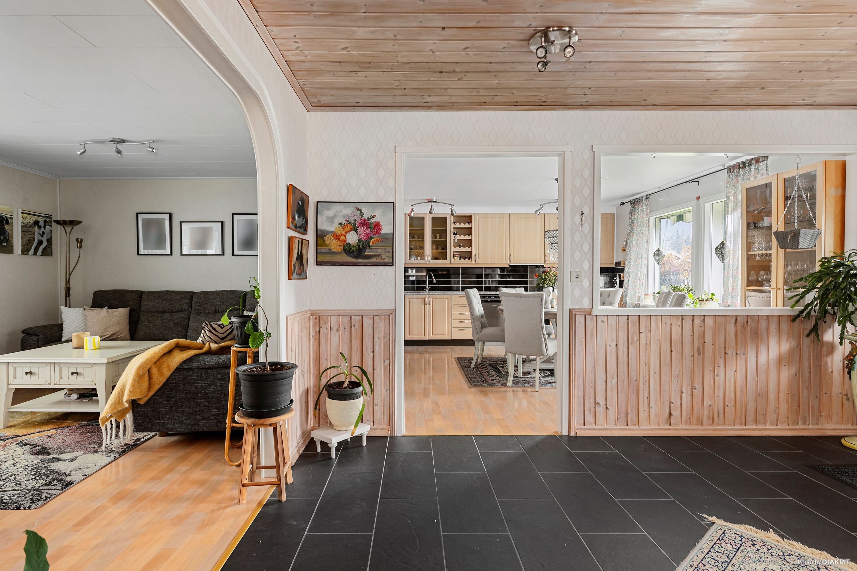 När du kliver in möts du av en stor och välkomnande hall med gott om plats för avhängning. Hallen öppnar upp mot hemmets hjärta – det ljusa och luftiga vardagsrummet. Här finns gott om plats för en större möbelgrupp, vilket gör rummet perfekt för både familjeliv och umgänge.