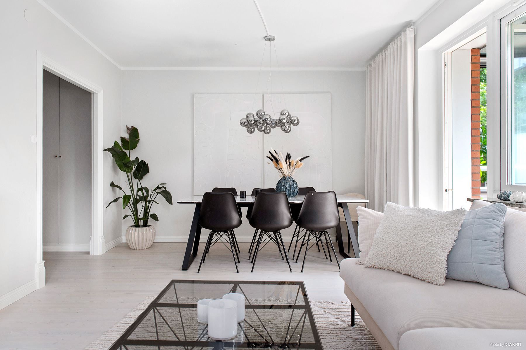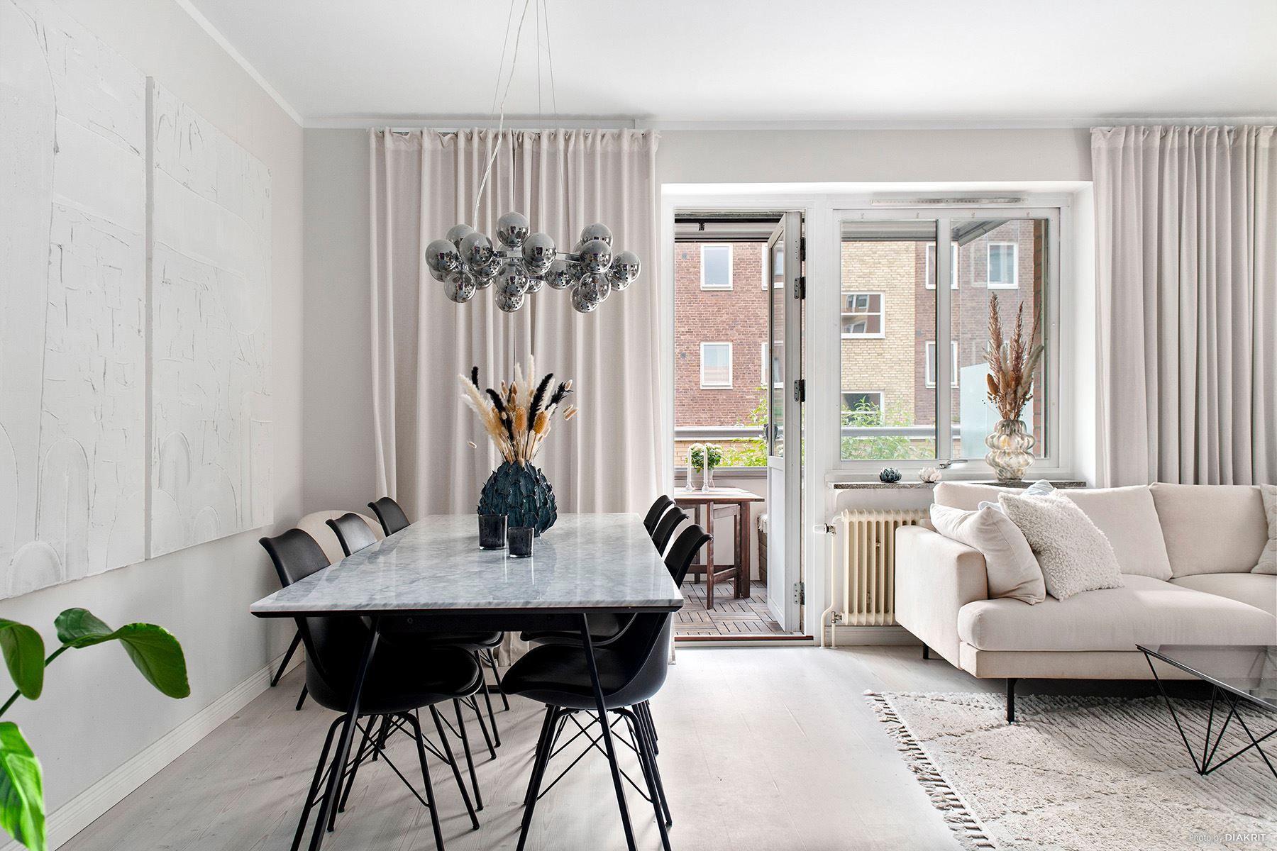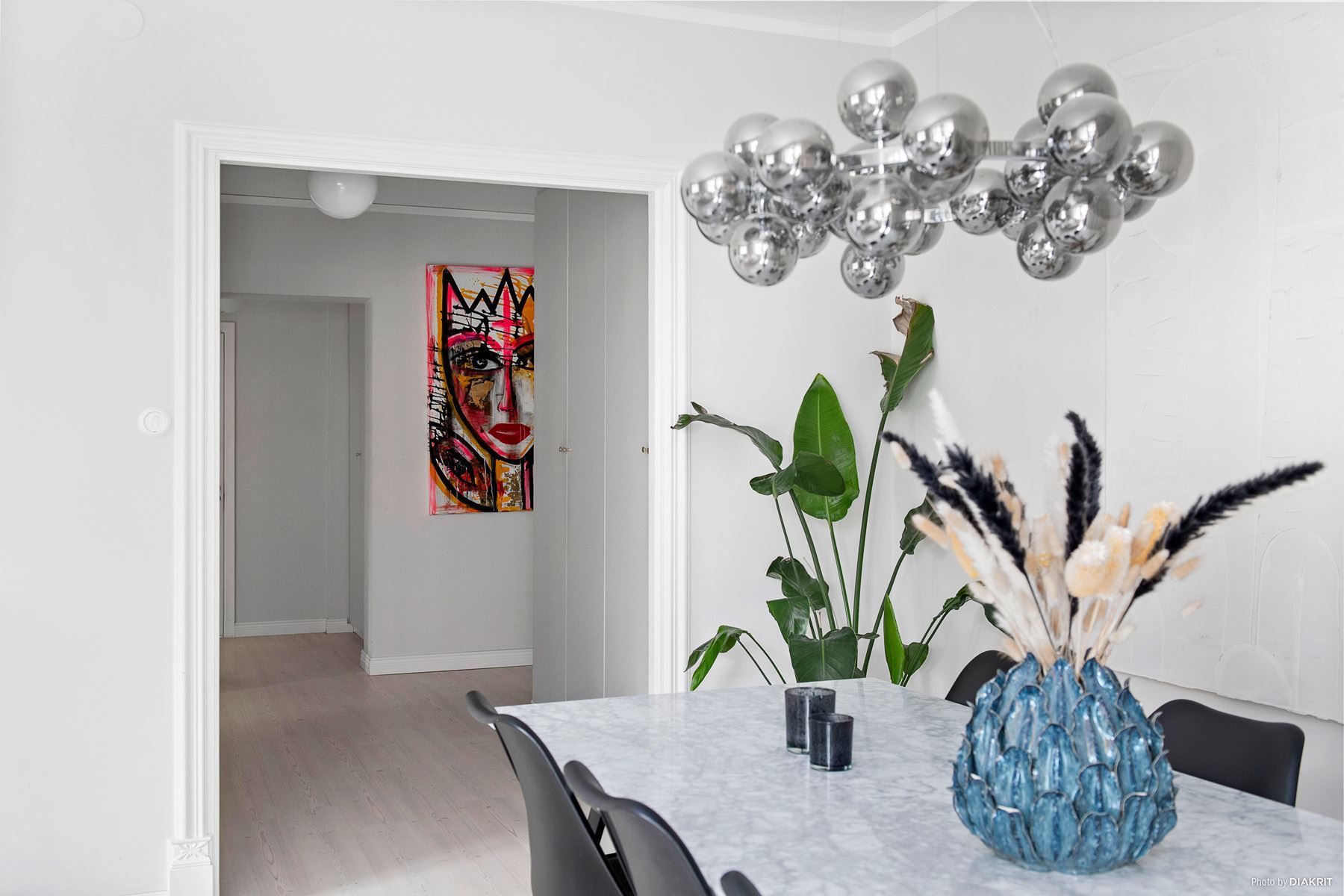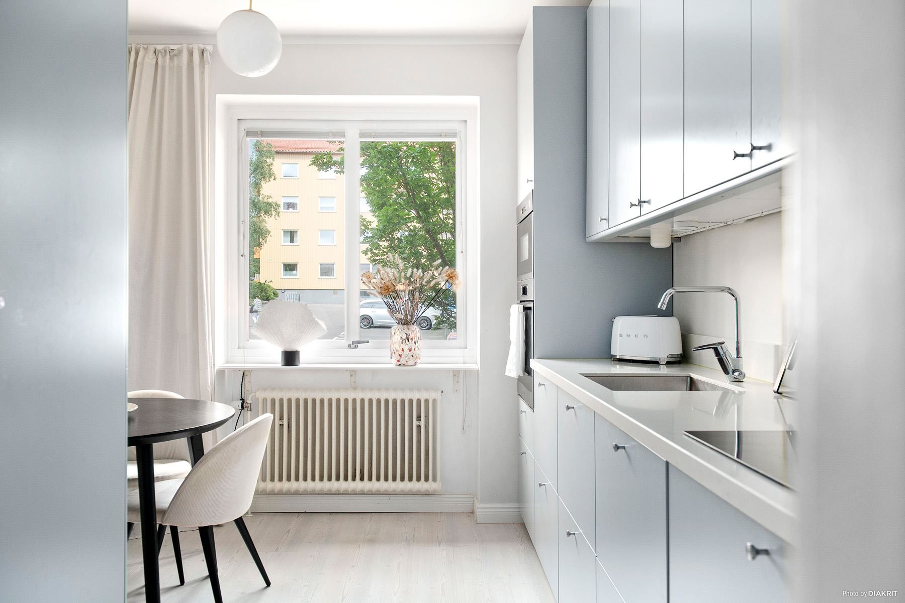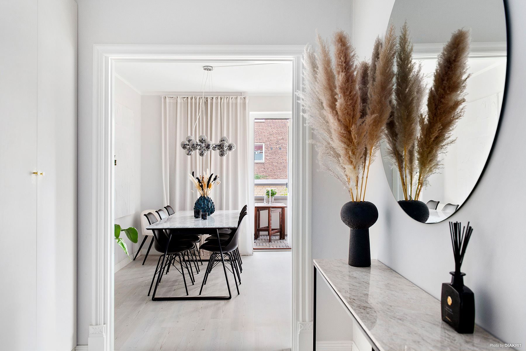 Tillsammans med strukturlister och dörrkarmar i ljusa toner samt vackra fönsterbleck sammansluter det bostaden till en perfekt kombination av modernitet som möter den äldre charmen.