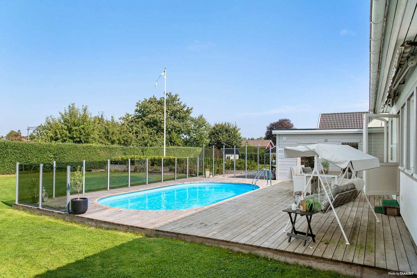 Sväng in uppför fastighetens fint stenlagda uppfart och parkera bekvämt under den tillbyggda carporten. Här får ni en första glimt av tomtens generösa storlek med en ypperlig gräsmatta på framsidan omringad av barrväxter. Passera genom carporten och kliv ut på tomtens fantastiska trädgård där ett inbjudande trädäck breder ut sig mot det lyxiga poolområdet. Här kan du svalka dig under varma sommardagar eller koppla av med familj och vänner på soliga eftermiddagar. Den tilltagna storleken är optimal för grillkvällar, sommarfester, trädgårdsodling och för barnens lek.