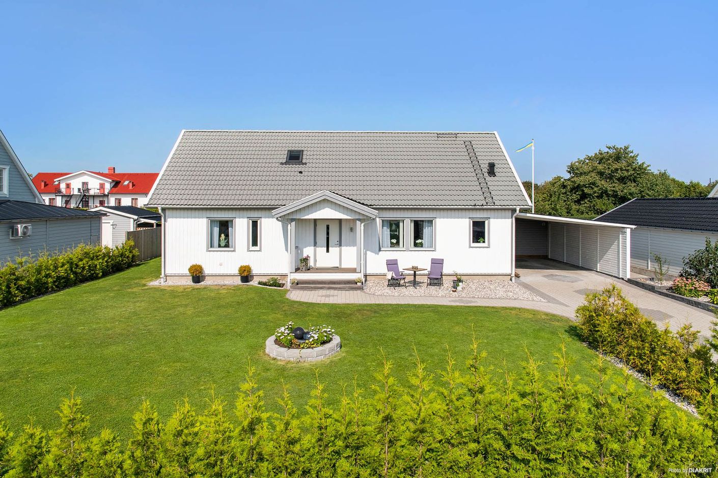 Interiört är huset lika imponerande som exteriört, med en genomtänkt planlösning och eleganta materialval. Med totalt fem sovrum erbjuder huset både flexibilitet och rymd, perfekt för att anpassa utrymmet till familjens behov – oavsett om det gäller extra sovplatser, gästrum eller ett inspirerande hemmakontor. Det öppna köket och vardagsrummet smälter samman till hemmets sociala hjärta, med generösa ytor för både matlagning och umgänge. Här flödar ljuset in genom stora fönster, vilket skapar en varm och inbjudande atmosfär. Husets två badrum är smakfullt inredda med moderna ytskikt, stilrena detaljer och högkvalitativ inredning som gör morgonrutinen smidig och njutbar.