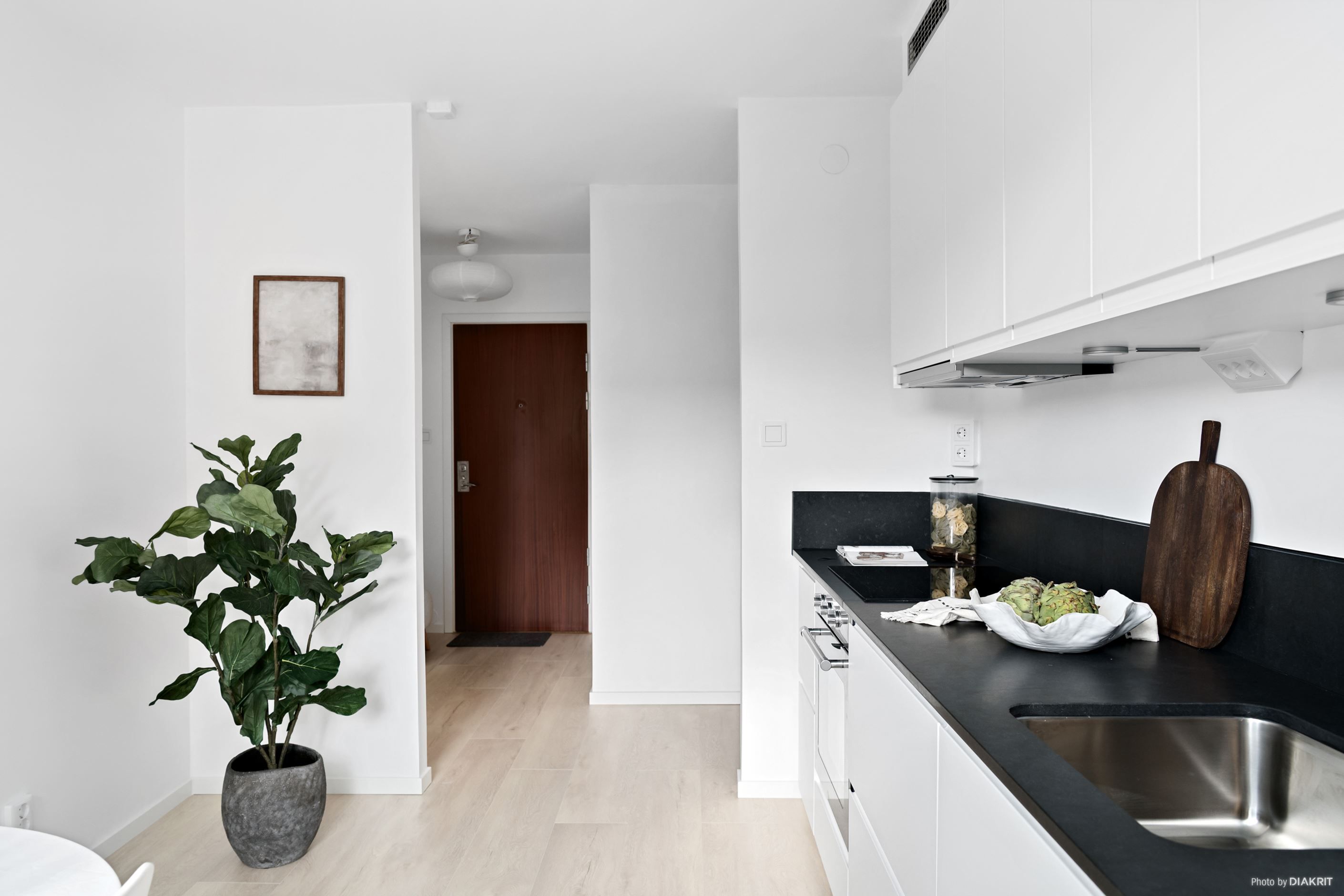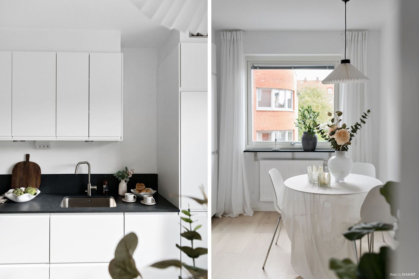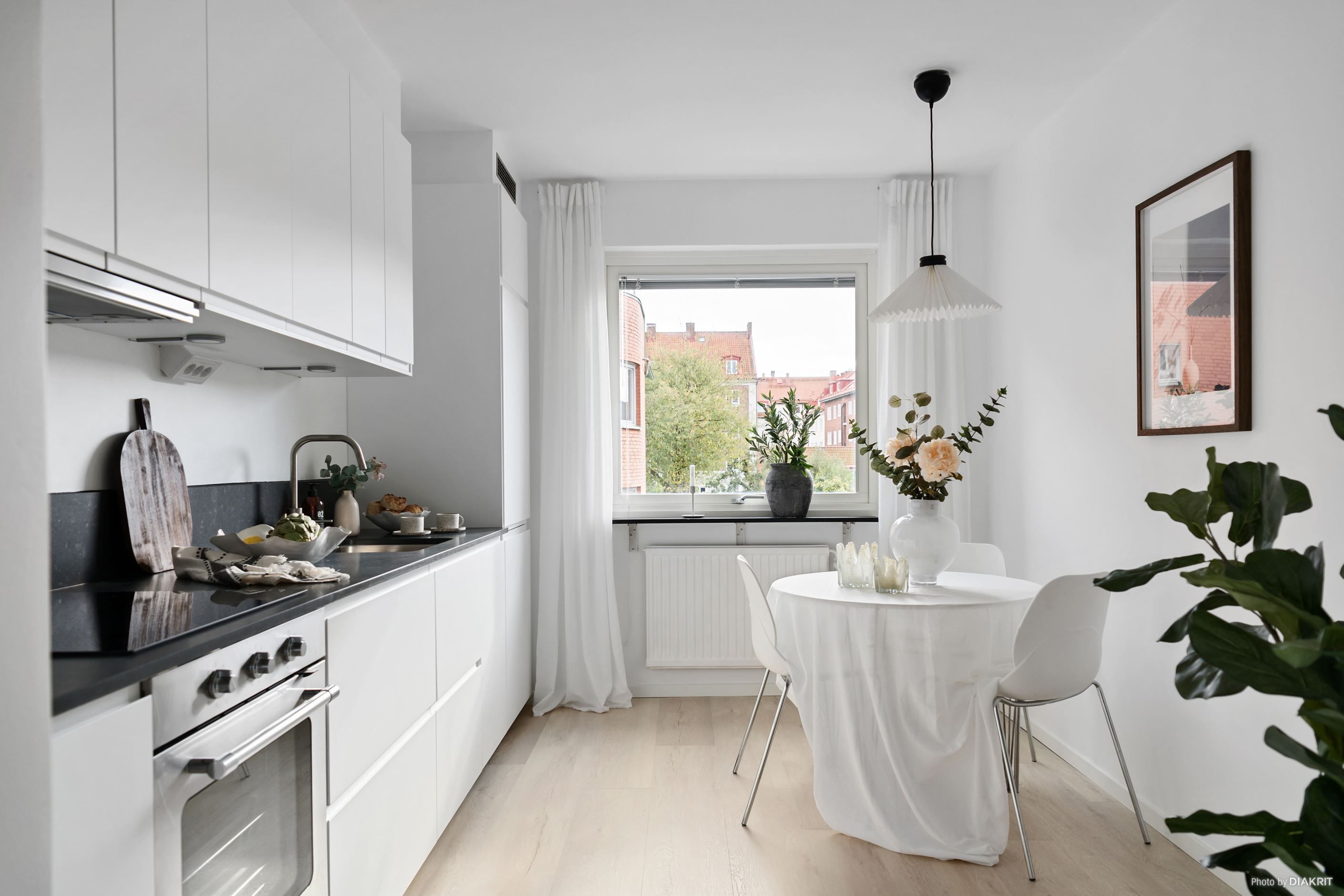 Redan i hallen möts du av en lugn och genomtänkt atmosfär som följer med genom hela bostaden. Köket är stilrent och nyrenoverat med vita luckor, mörk bänkskiva i granit och smakfulla detaljer. Här finns gott om arbetsyta och en självklar plats för matbordet intill fönstret, där utsikten mot kvarterets klassiska tegelhus ger en charmig inramning.