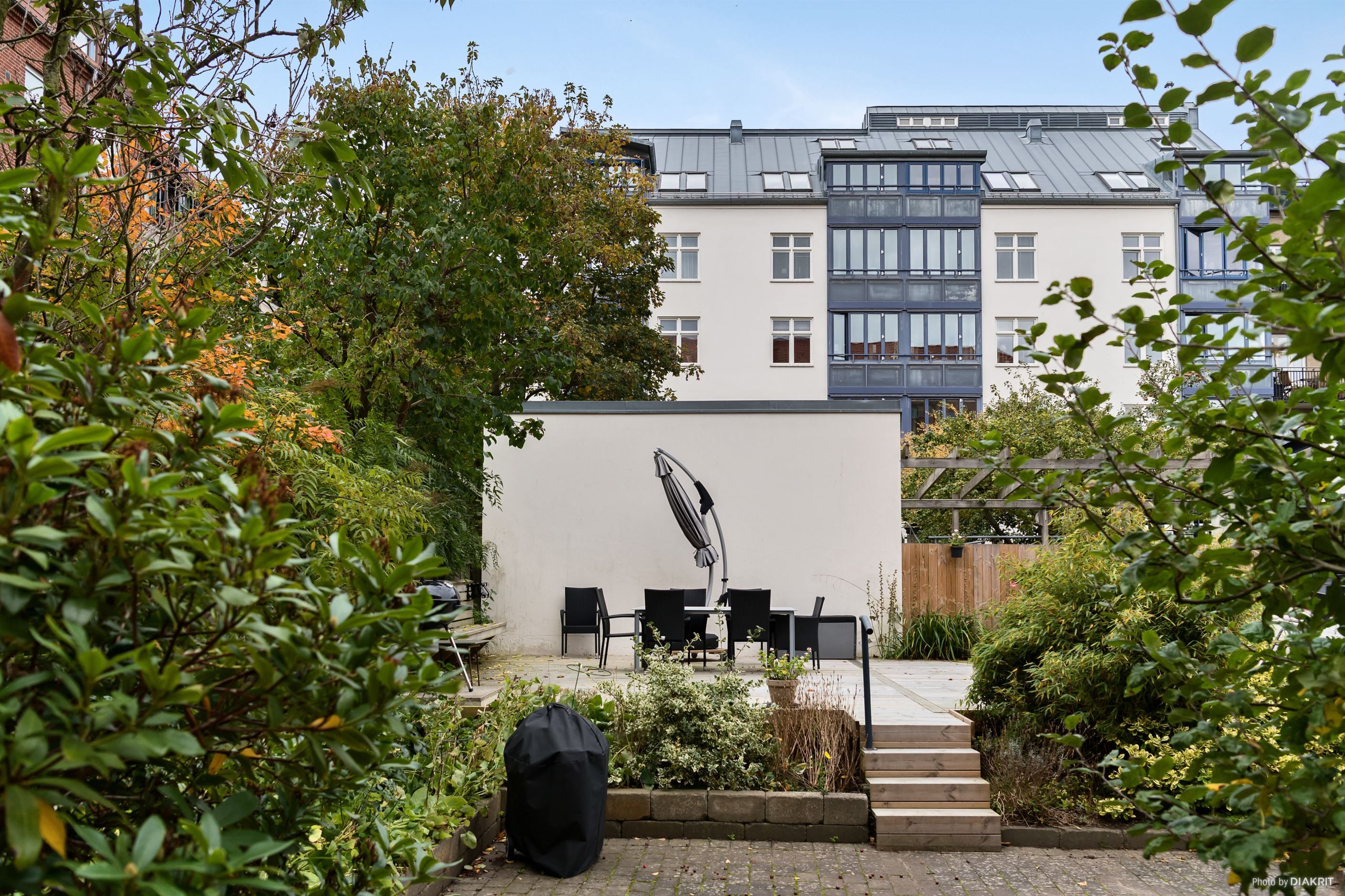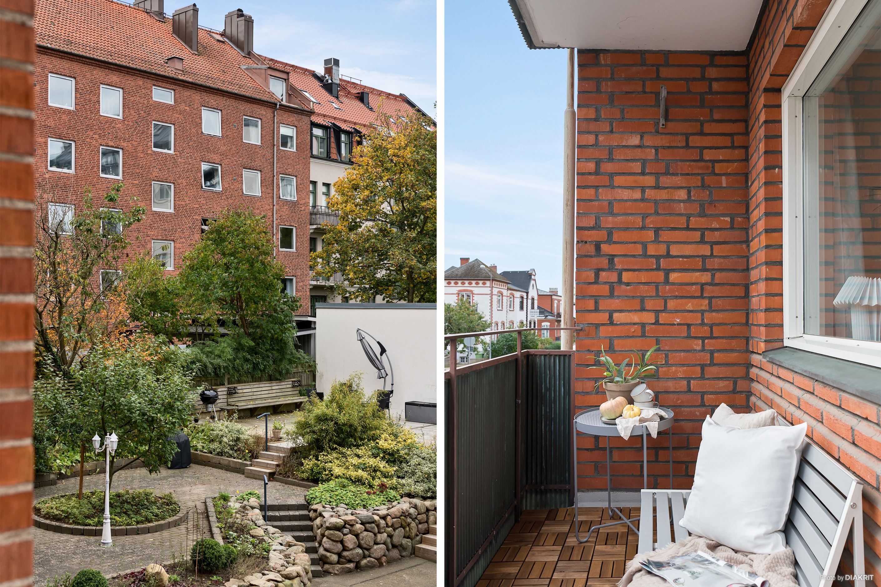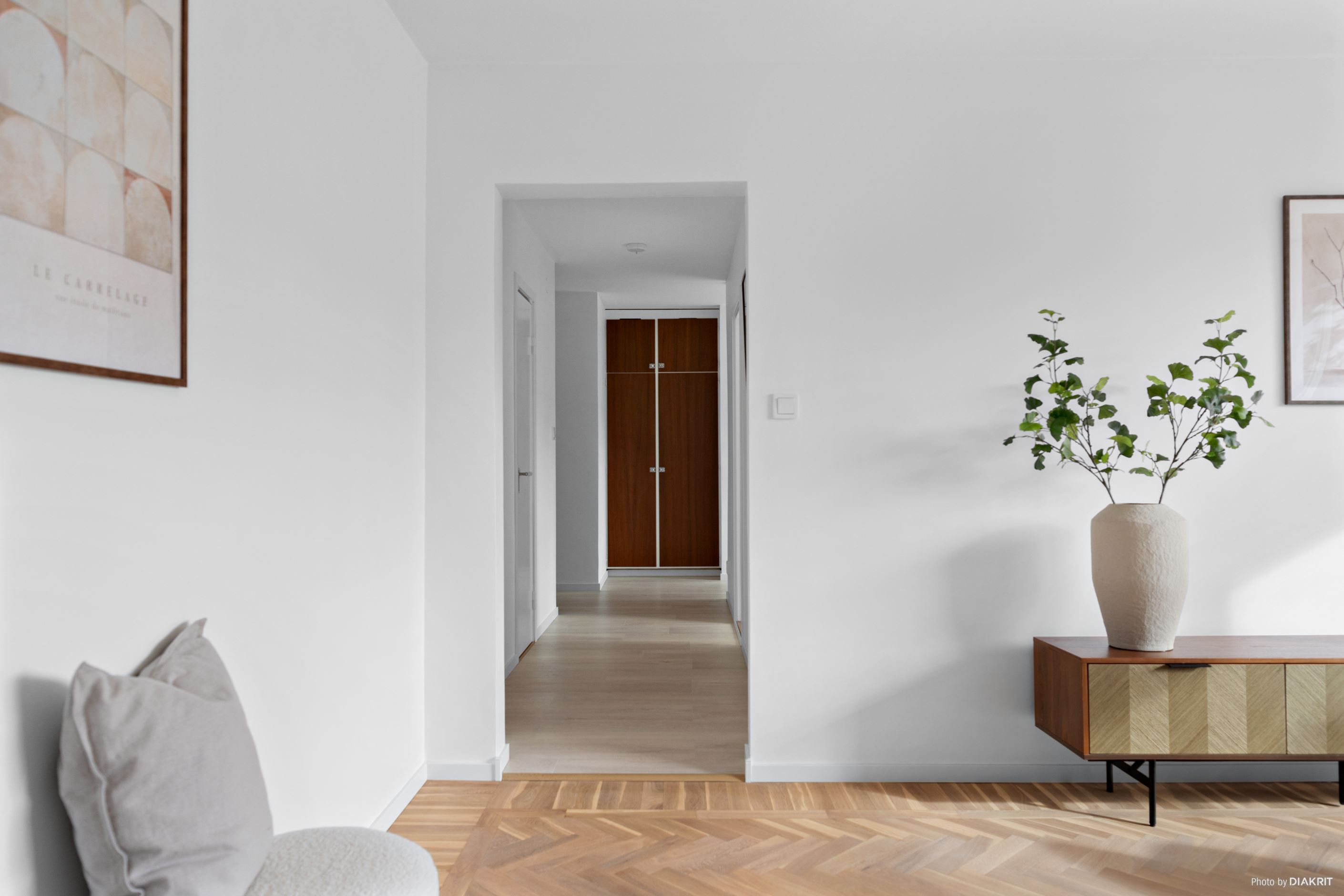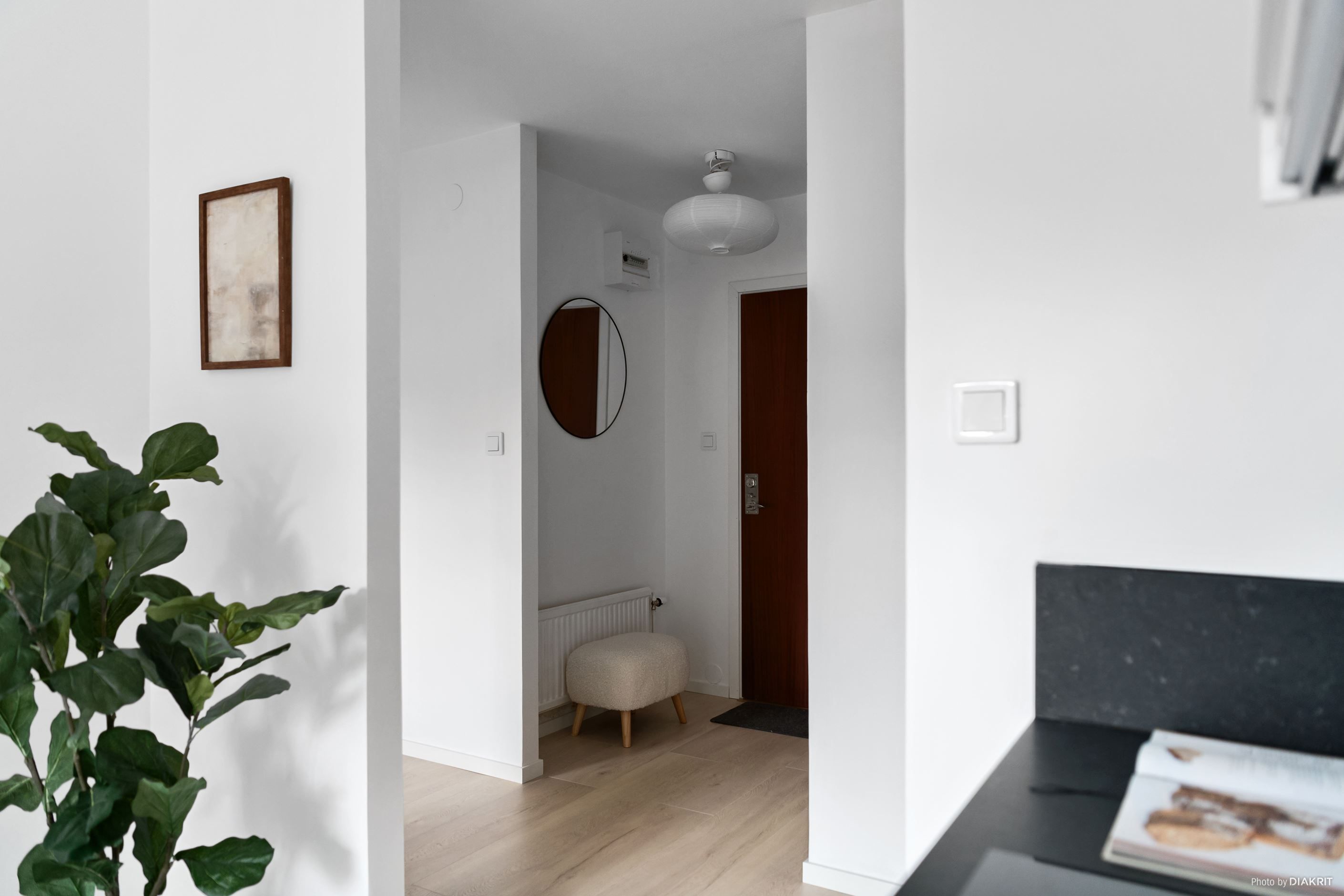 Redan i hallen möts du av en lugn och genomtänkt atmosfär som följer med genom hela bostaden. Köket är stilrent och nyrenoverat med vita luckor, mörk bänkskiva i granit och smakfulla detaljer. Här finns gott om arbetsyta och en självklar plats för matbordet intill fönstret, där utsikten mot kvarterets klassiska tegelhus ger en charmig inramning.