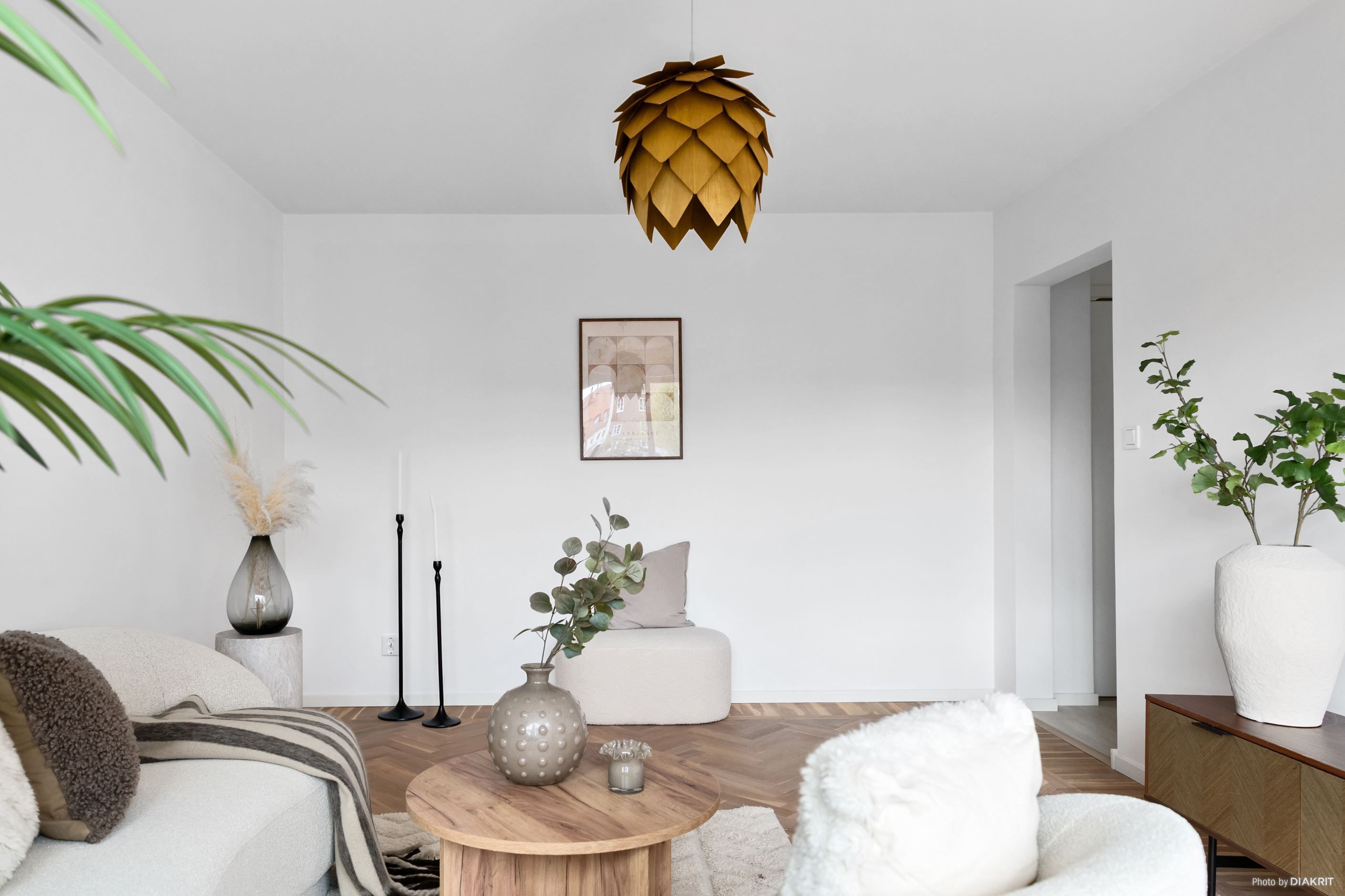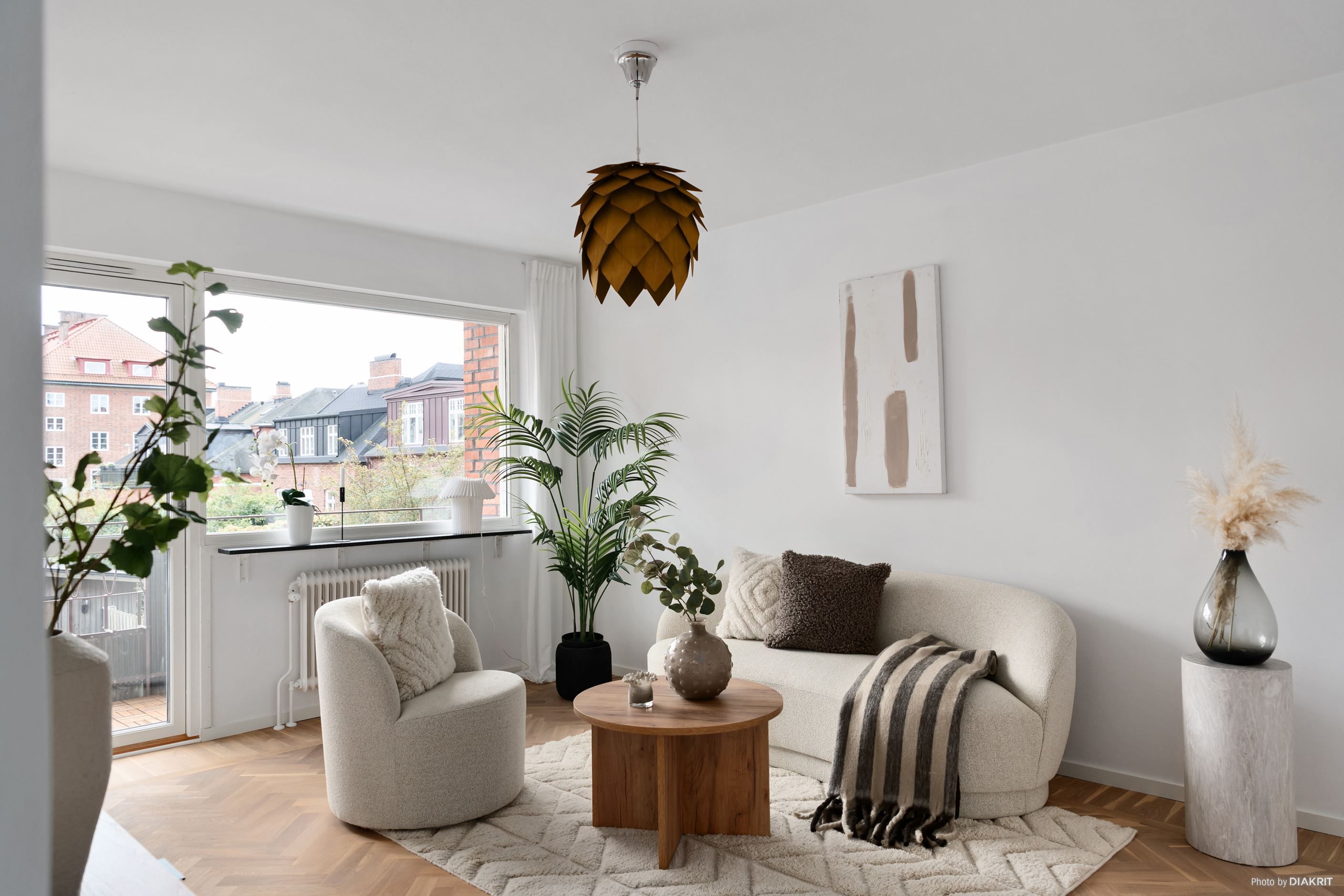 Vardagsrummet är generöst och välproportionerat – en inbjudande yta för både avkoppling och umgänge. De stora fönsterpartierna låter ljuset flöda in över den vackra fiskbensparketten och skapar en härlig känsla av rymd. Härifrån nås också den trivsamma balkongen med utsikt mot gårdens grönska – en naturlig plats för lugna stunder i solen.