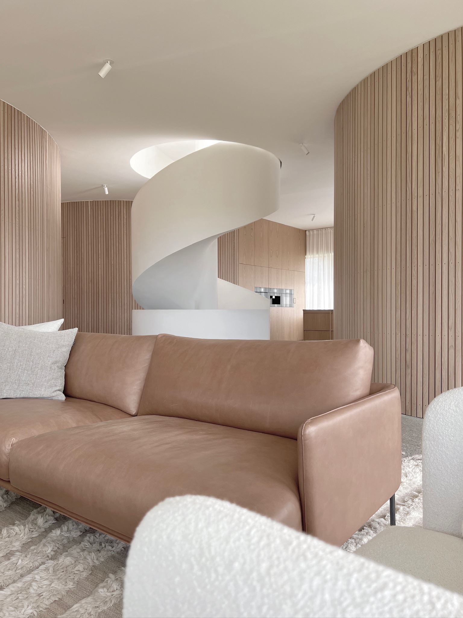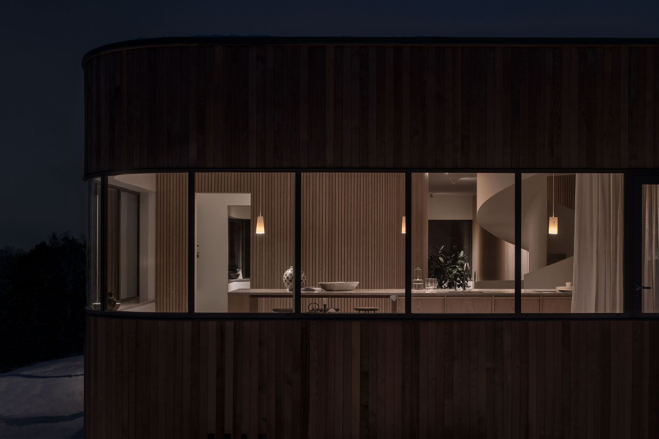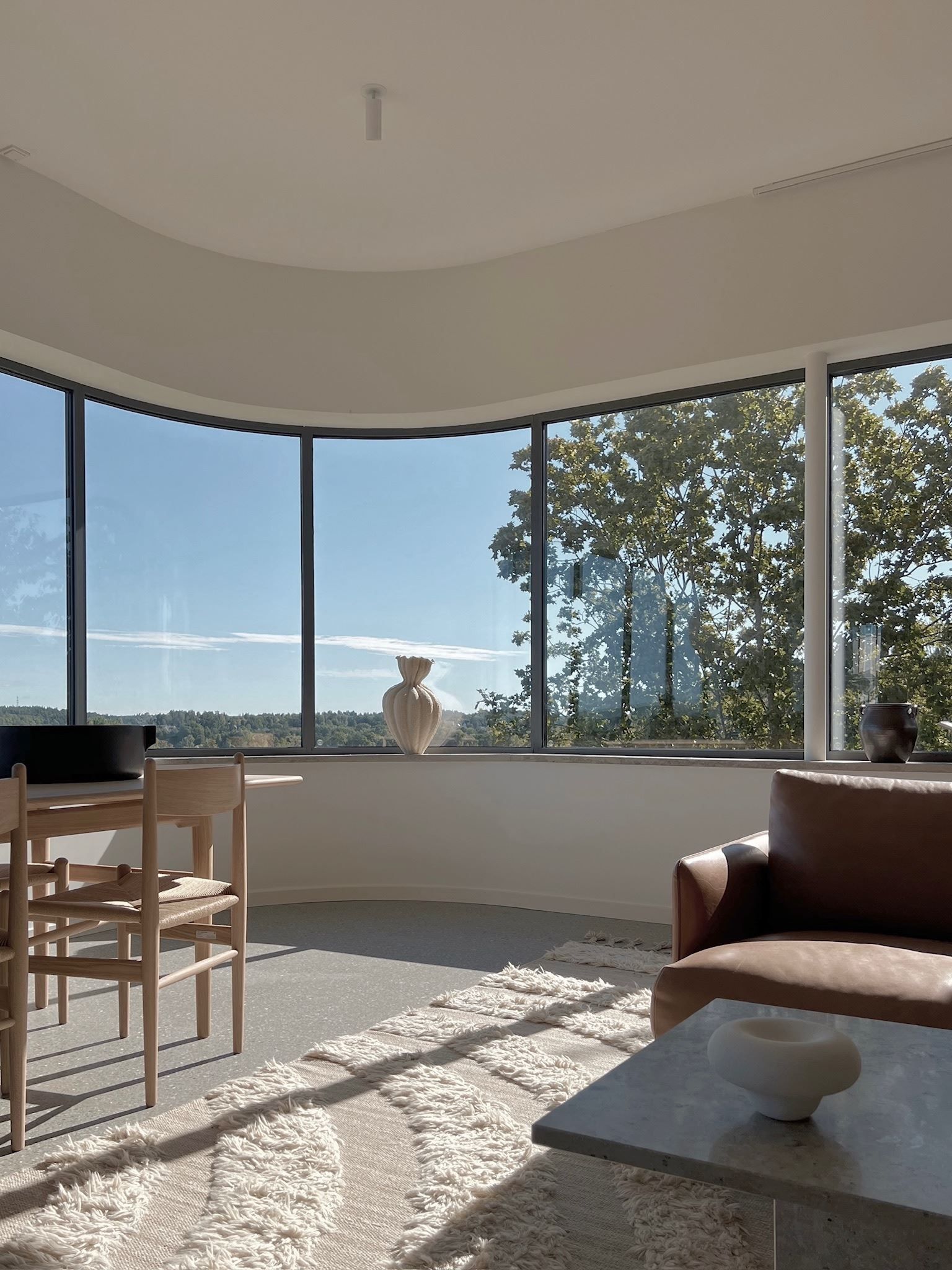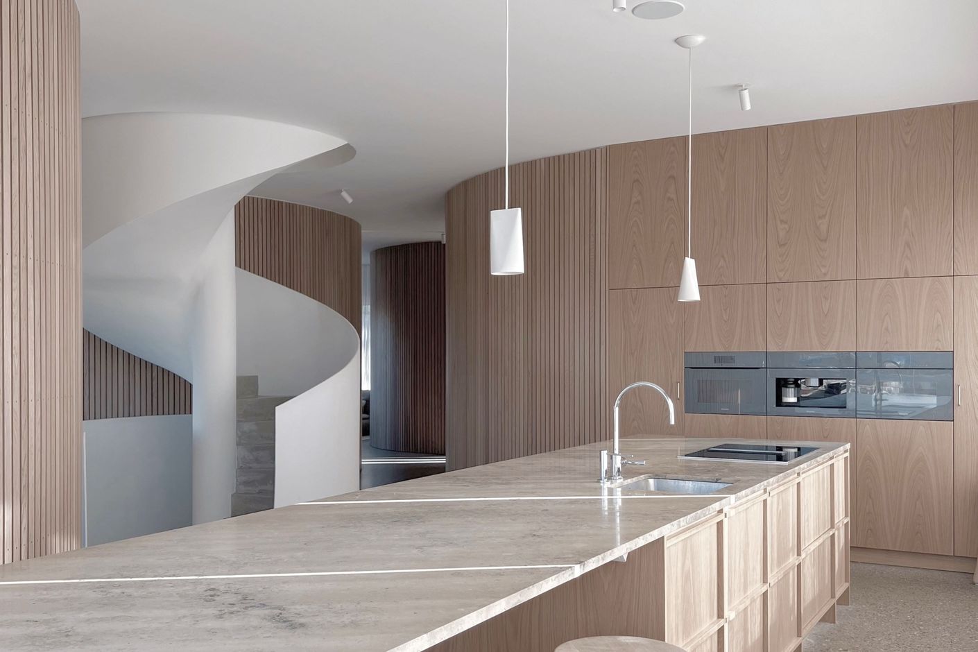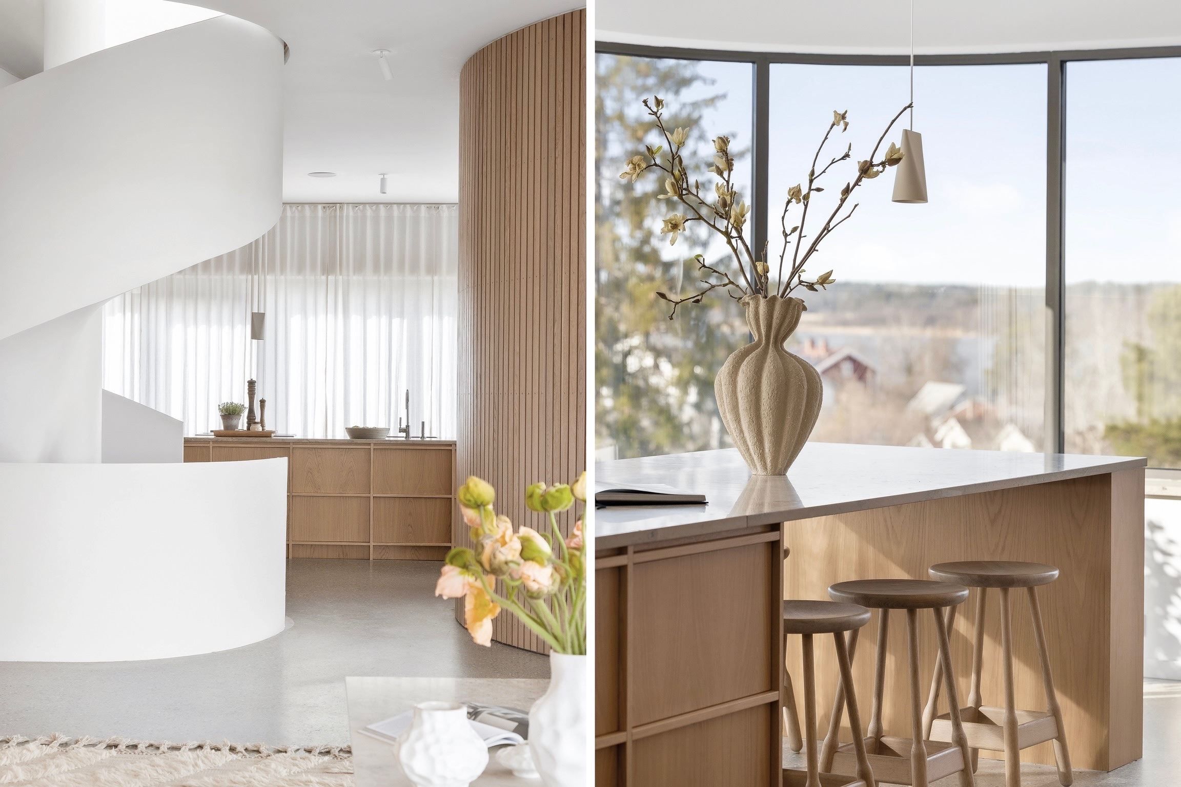 Planlösningen i form av fyra bågar i en mjuk kvadrat har skapat väl avvägda ytor, samband och flöden som böljar naturligt genom bostaden. Rummen är generösa och välplanerade med tilltagen höjd till tak. Det fåtal material som används – betong, ekpanel, kalksten, vit puts – bildar en lugn och behaglig bas och fönsterbandet bjuder på en bred horisontalvy. Nästintill all teknik är snillrikt inbyggd i de bågformade väggarna och spänning skapas av lönndörrar in till sovrummen som även har fått smart dold förvaring.