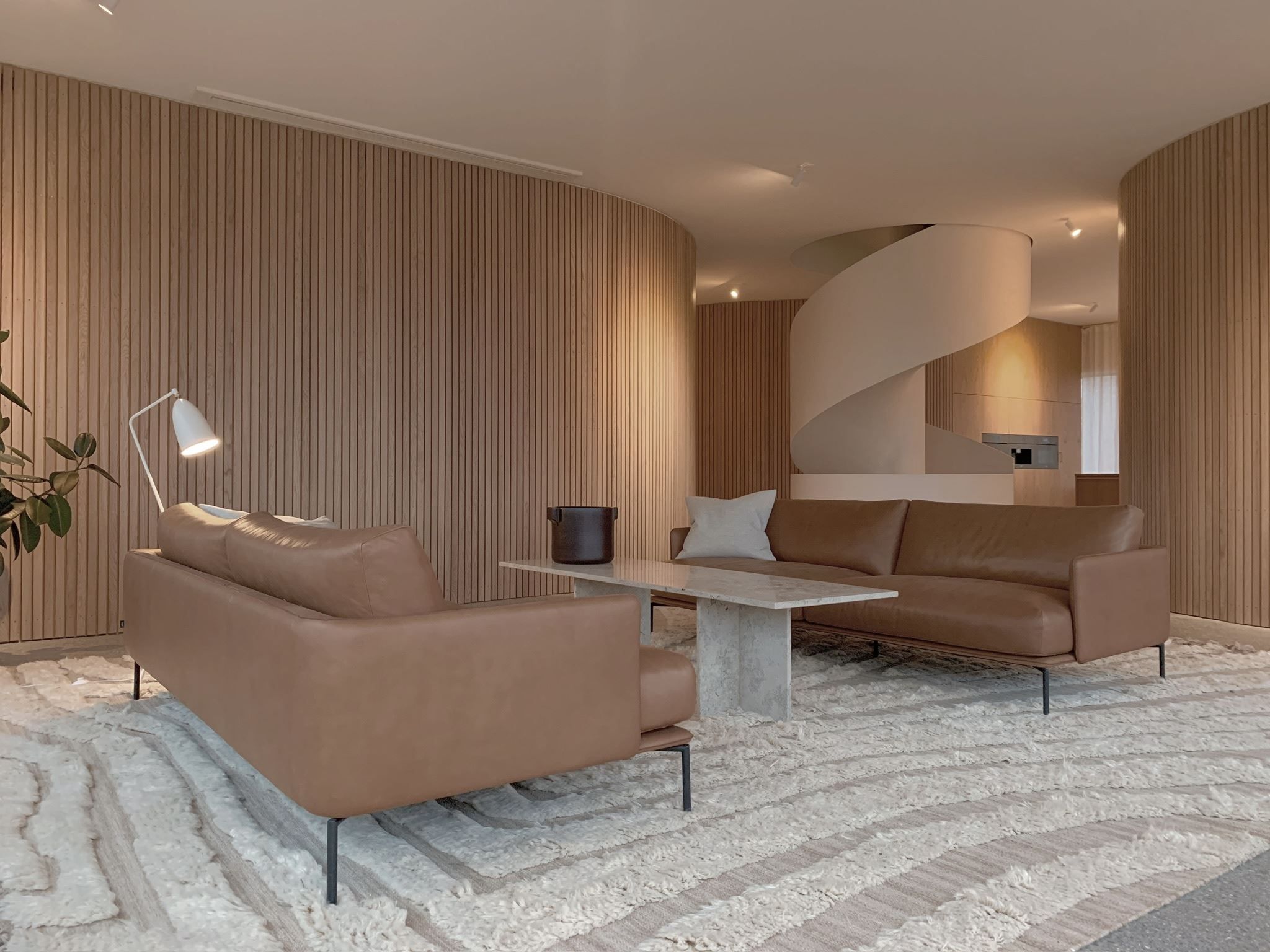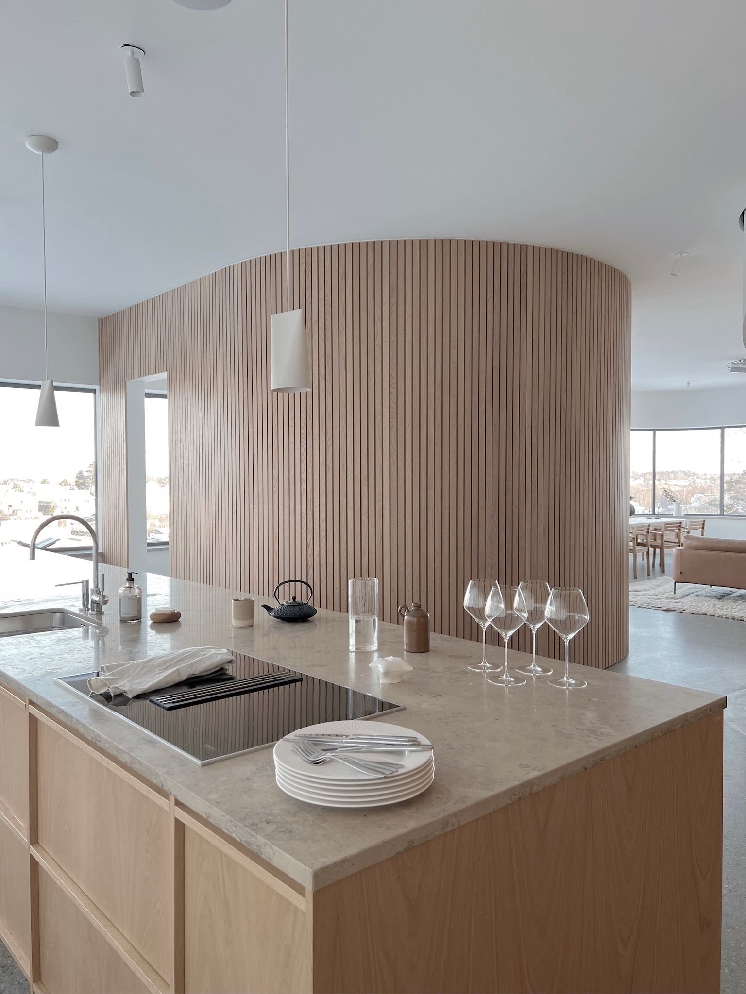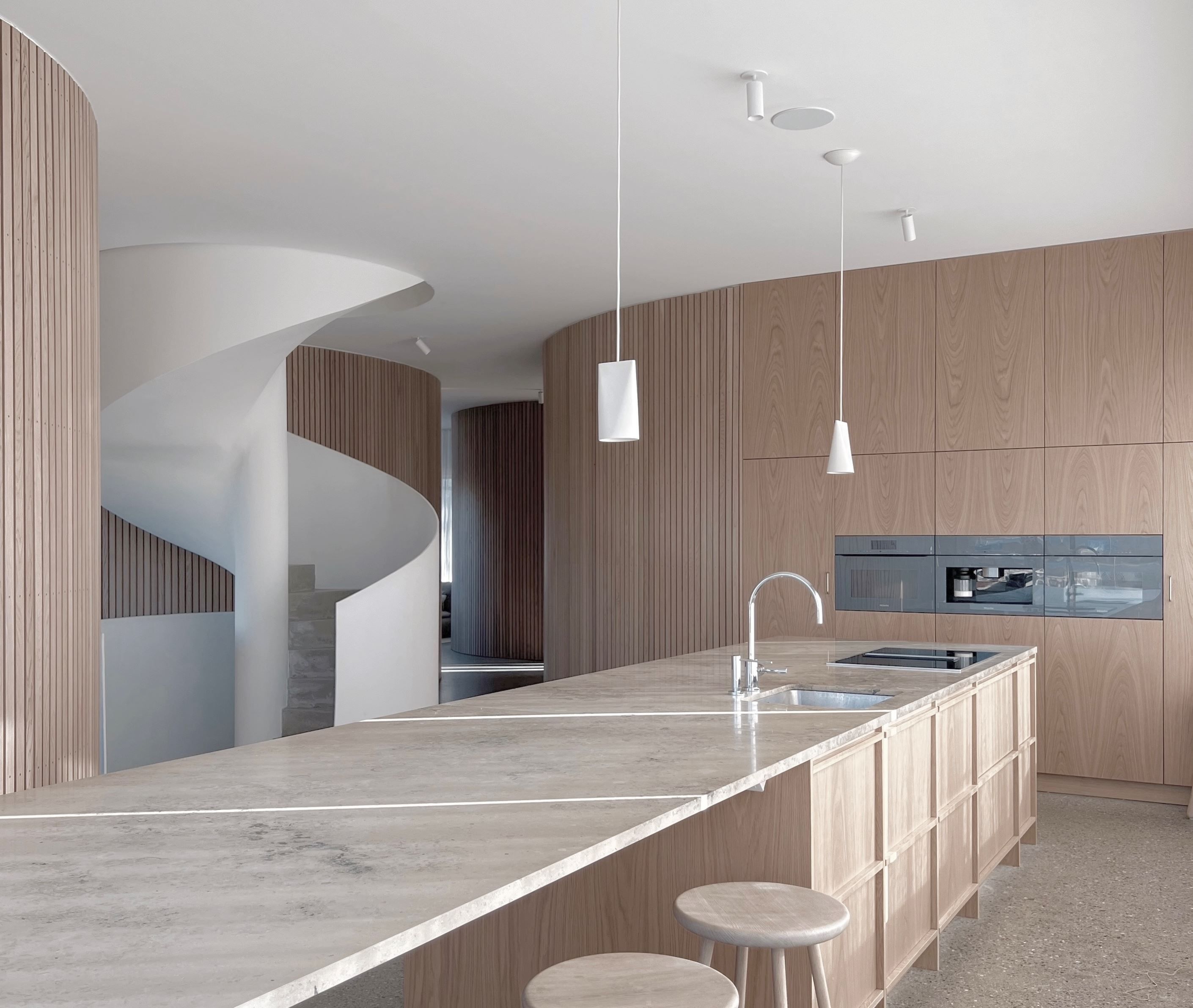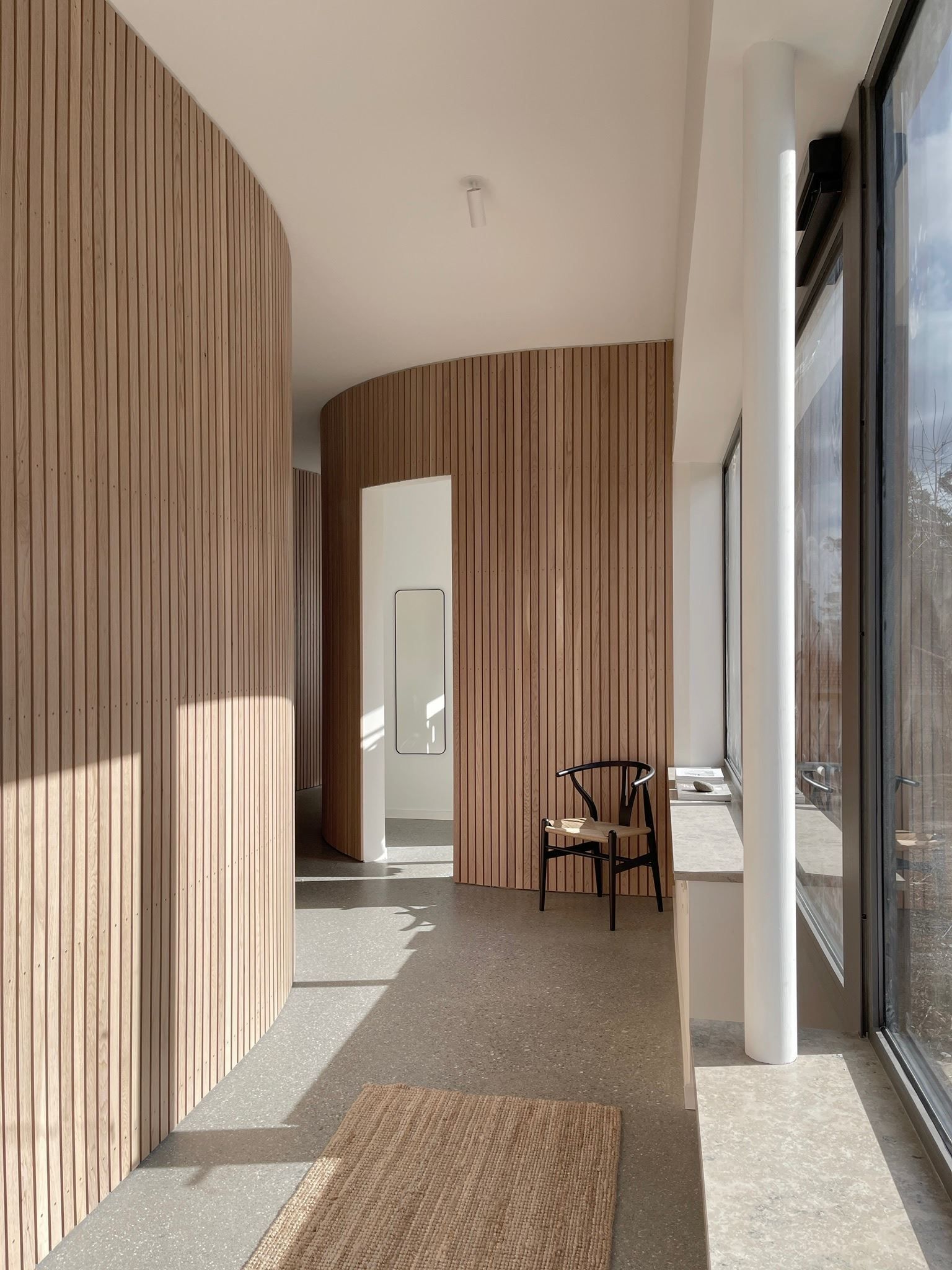 Planlösningen i form av fyra bågar i en mjuk kvadrat har skapat väl avvägda ytor, samband och flöden som böljar naturligt genom bostaden. Rummen är generösa och välplanerade med tilltagen höjd till tak. Det fåtal material som används – betong, ekpanel, kalksten, vit puts – bildar en lugn och behaglig bas och fönsterbandet bjuder på en bred horisontalvy. Nästintill all teknik är snillrikt inbyggd i de bågformade väggarna och spänning skapas av lönndörrar in till sovrummen som även har fått smart dold förvaring.