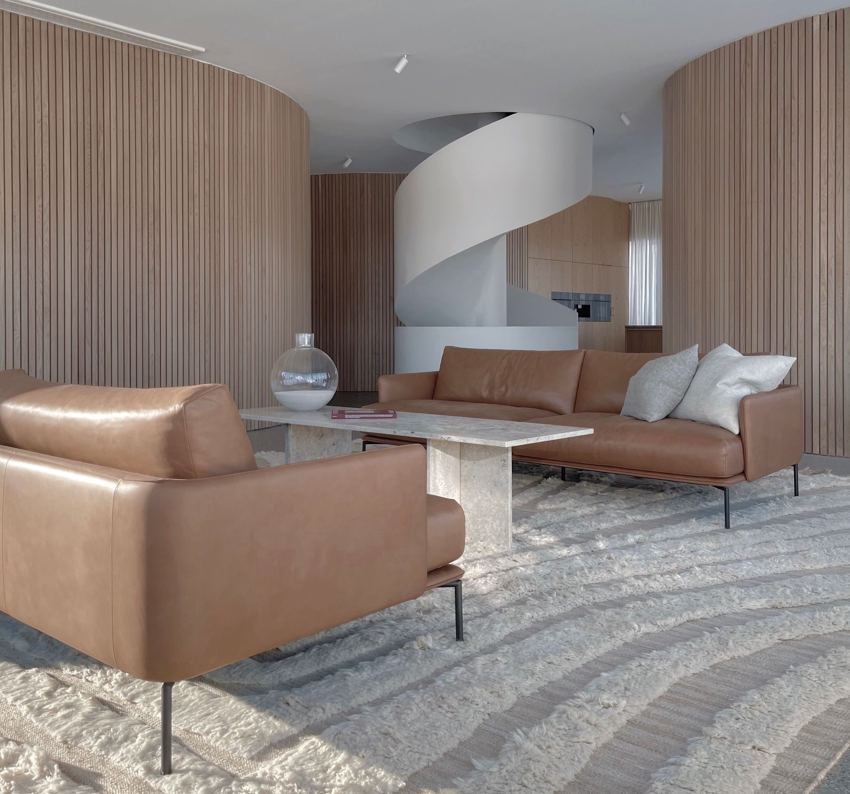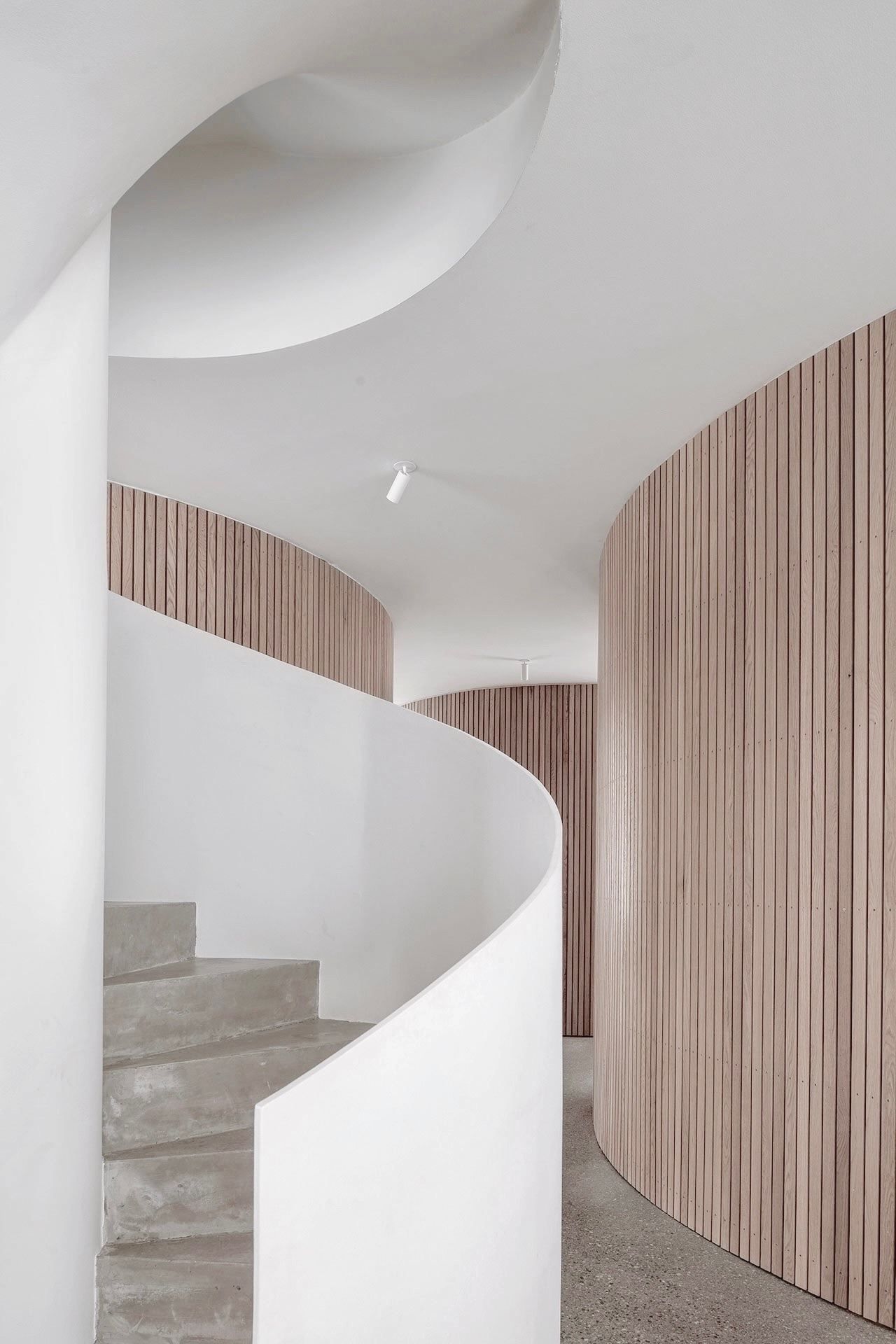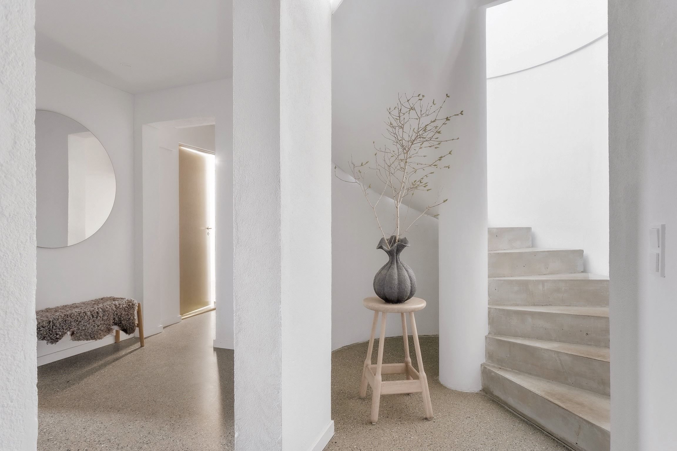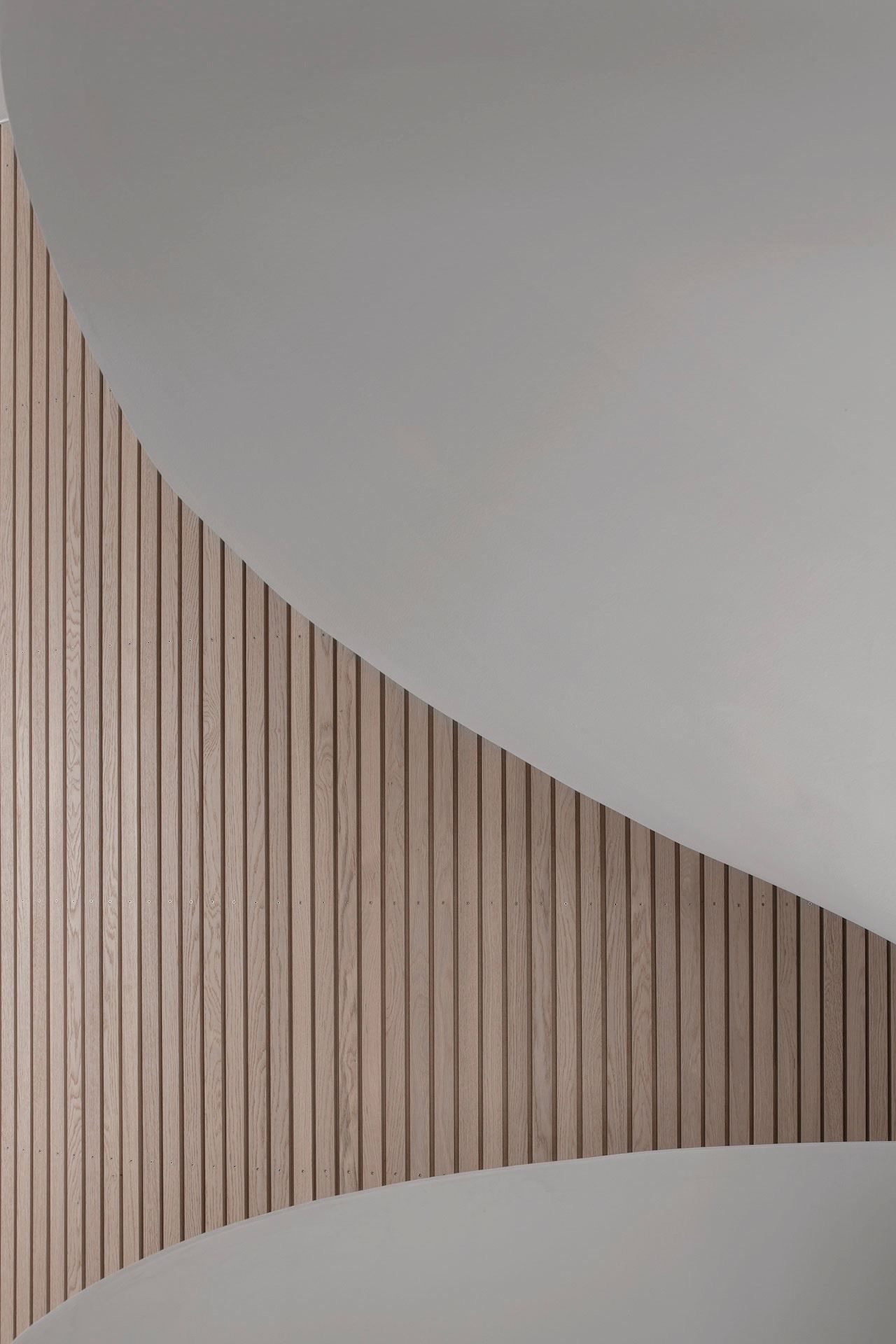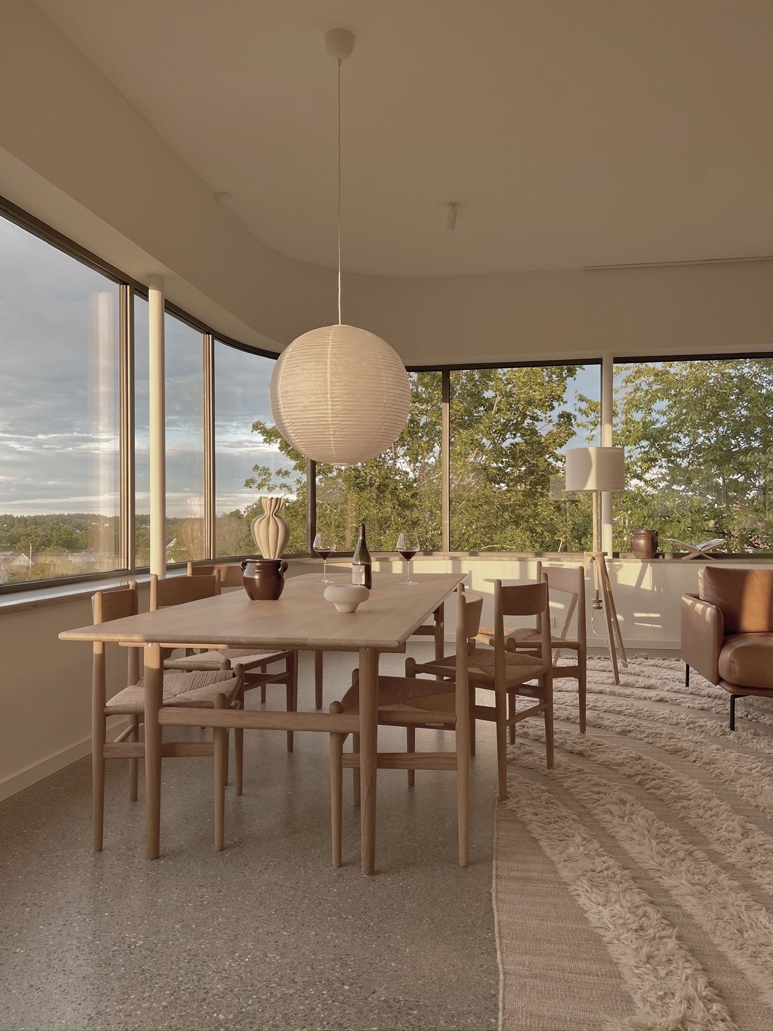 Planlösningen i form av fyra bågar i en mjuk kvadrat har skapat väl avvägda ytor, samband och flöden som böljar naturligt genom bostaden. Rummen är generösa och välplanerade med tilltagen höjd till tak. Det fåtal material som används – betong, ekpanel, kalksten, vit puts – bildar en lugn och behaglig bas och fönsterbandet bjuder på en bred horisontalvy. Nästintill all teknik är snillrikt inbyggd i de bågformade väggarna och spänning skapas av lönndörrar in till sovrummen som även har fått smart dold förvaring.