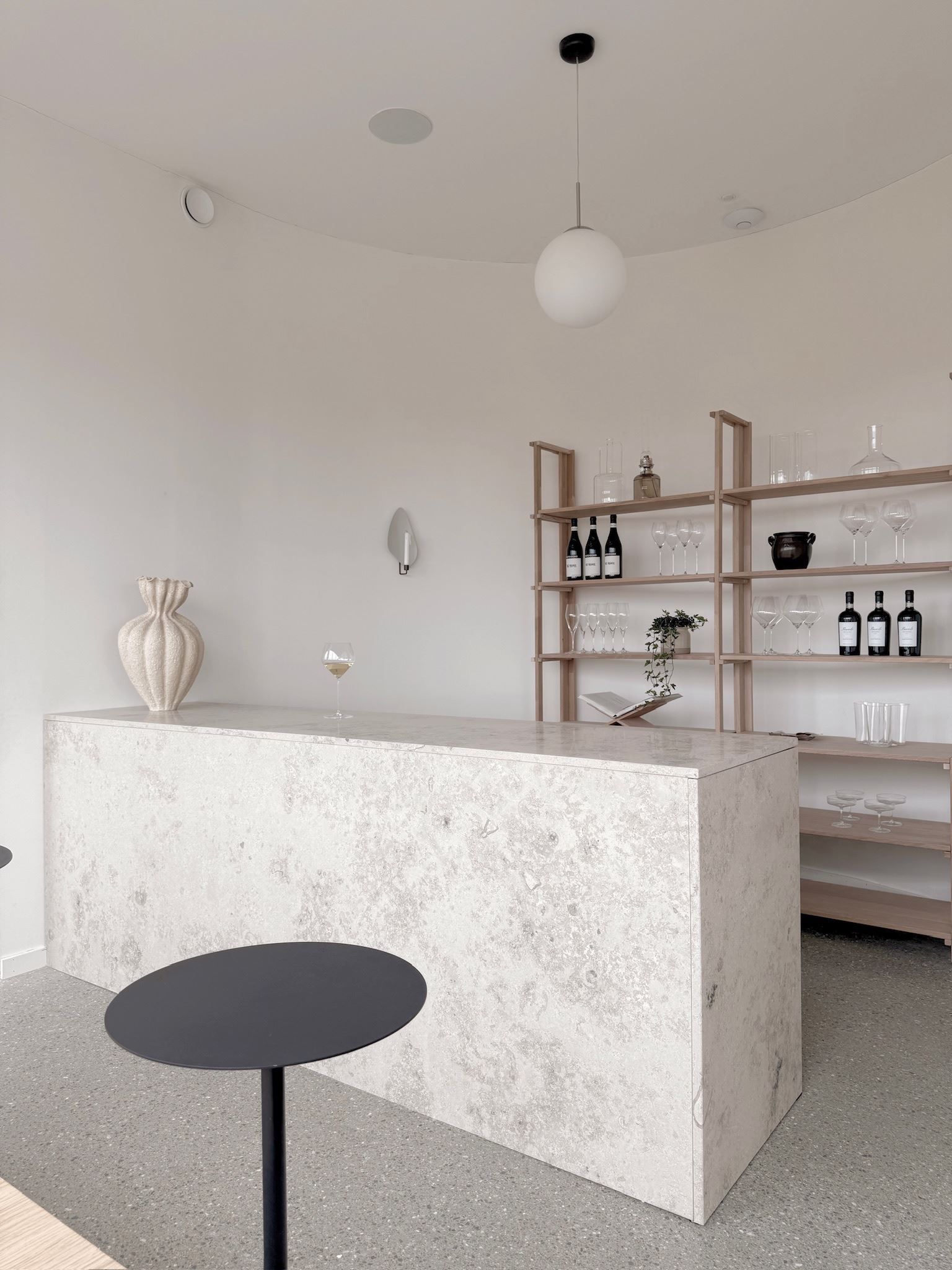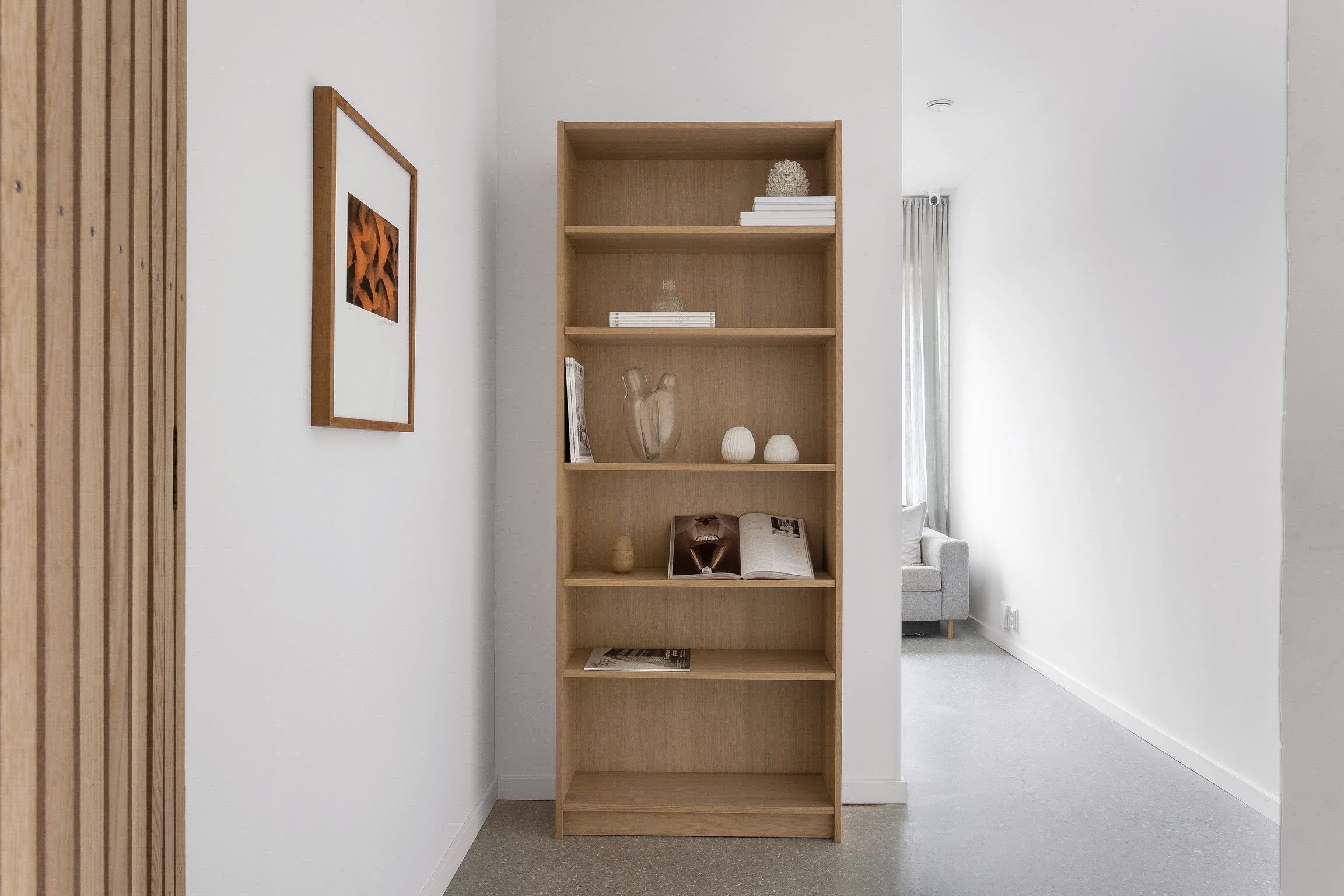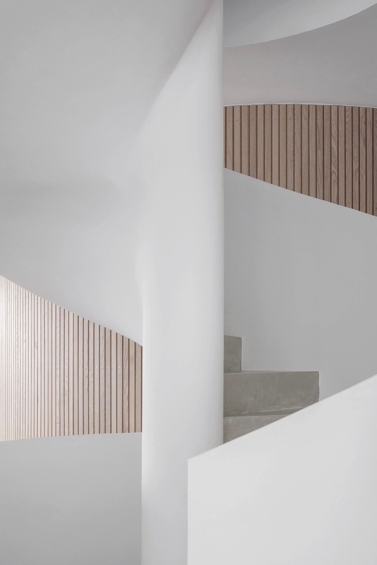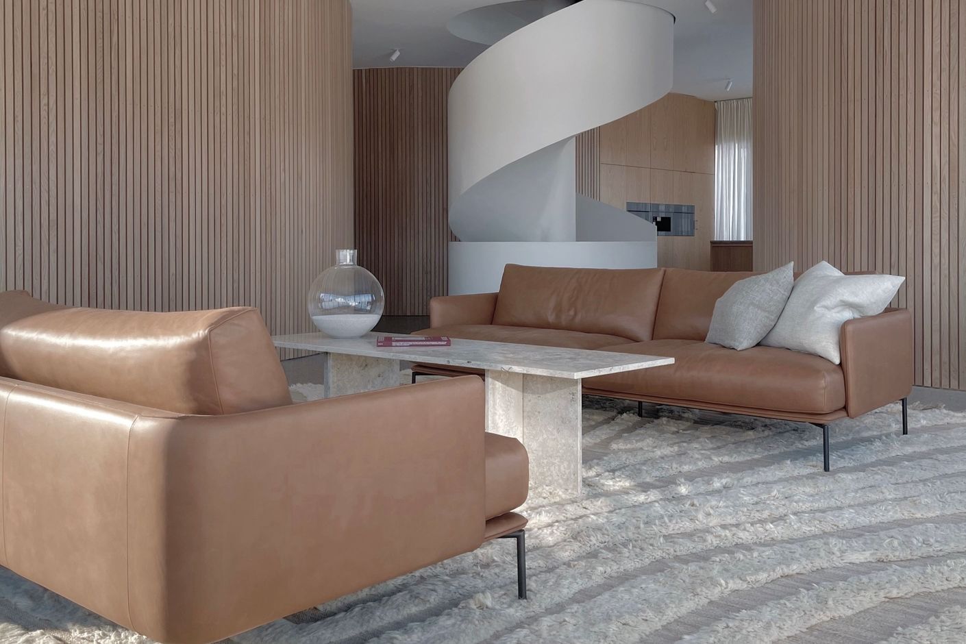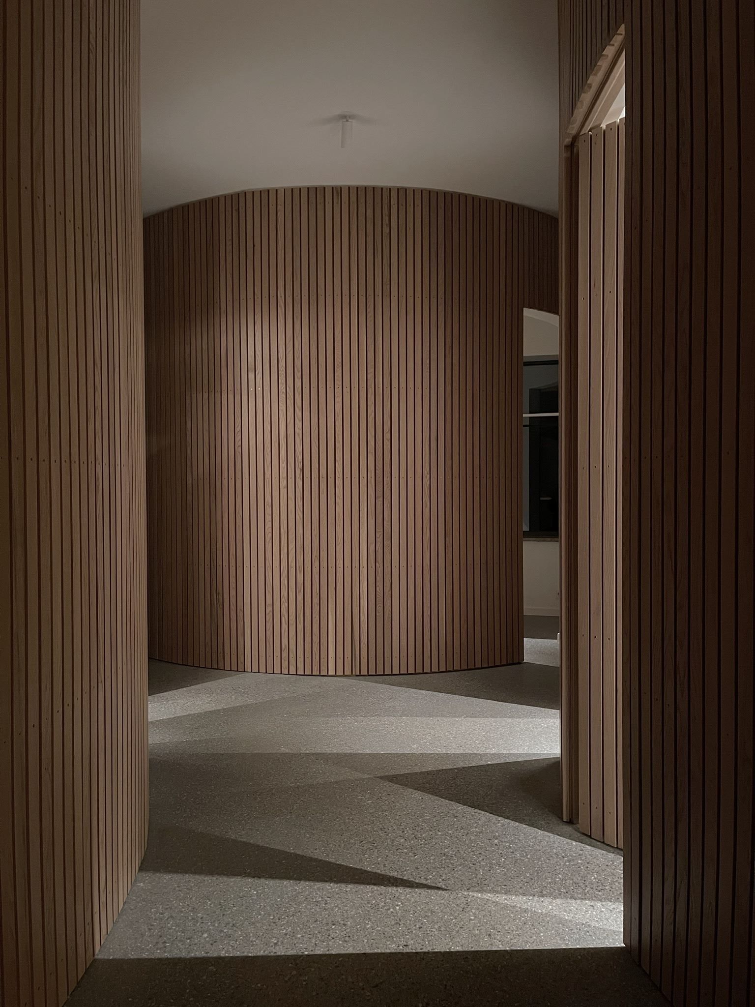 Planlösningen i form av fyra bågar i en mjuk kvadrat har skapat väl avvägda ytor, samband och flöden som böljar naturligt genom bostaden. Rummen är generösa och välplanerade med tilltagen höjd till tak. Det fåtal material som används – betong, ekpanel, kalksten, vit puts – bildar en lugn och behaglig bas och fönsterbandet bjuder på en bred horisontalvy. Nästintill all teknik är snillrikt inbyggd i de bågformade väggarna och spänning skapas av lönndörrar in till sovrummen som även har fått smart dold förvaring.