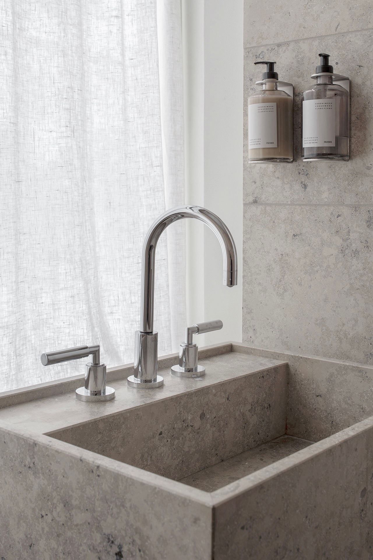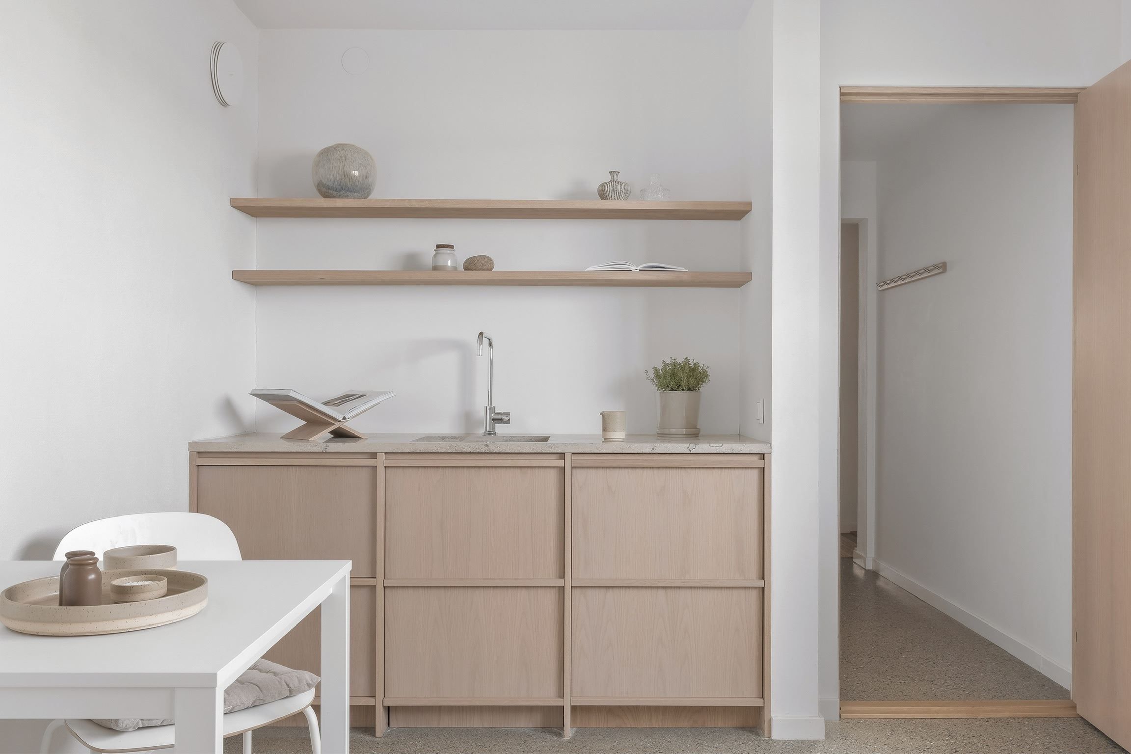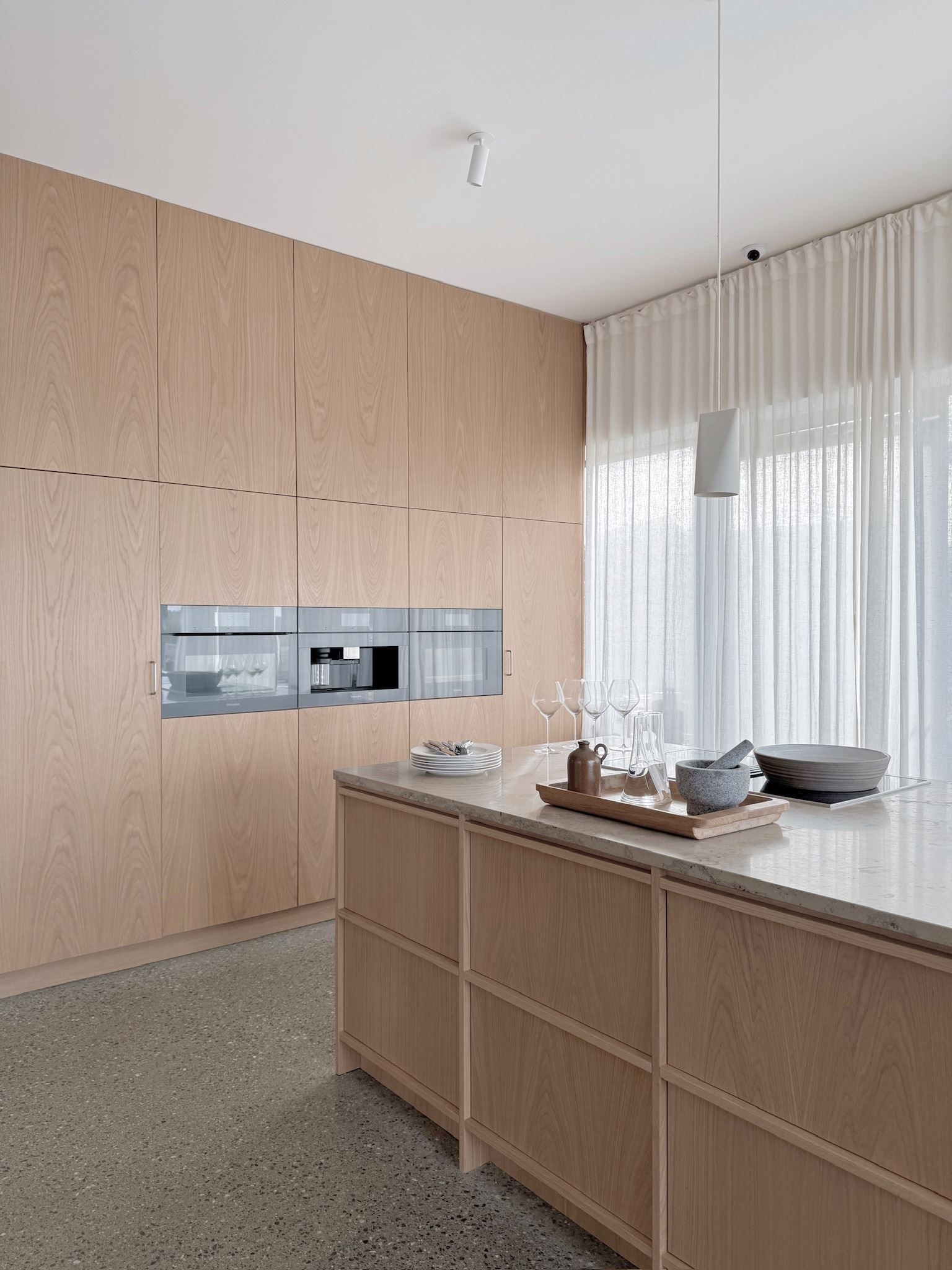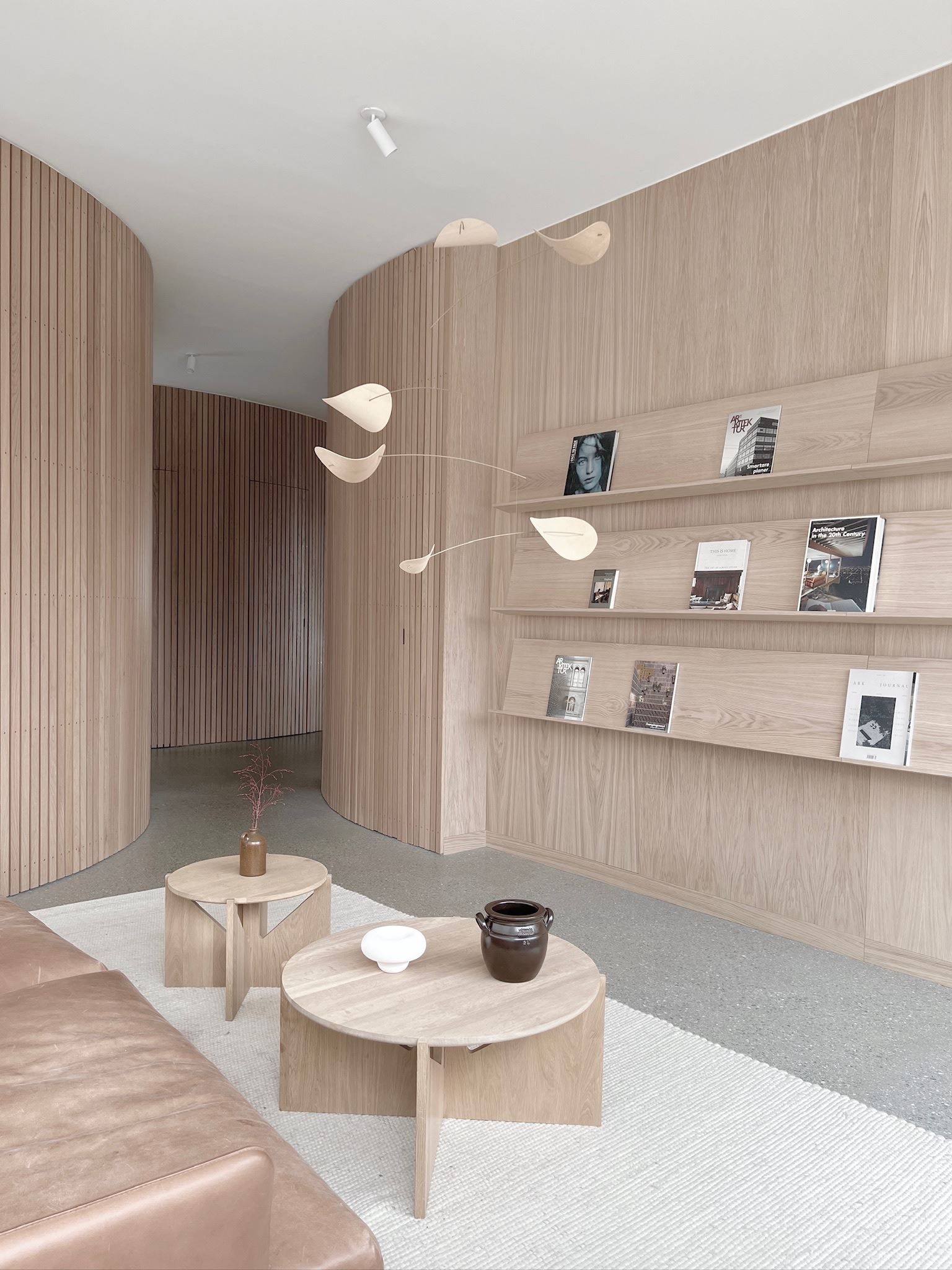 Planlösningen i form av fyra bågar i en mjuk kvadrat har skapat väl avvägda ytor, samband och flöden som böljar naturligt genom bostaden. Rummen är generösa och välplanerade med tilltagen höjd till tak. Det fåtal material som används – betong, ekpanel, kalksten, vit puts – bildar en lugn och behaglig bas och fönsterbandet bjuder på en bred horisontalvy. Nästintill all teknik är snillrikt inbyggd i de bågformade väggarna och spänning skapas av lönndörrar in till sovrummen som även har fått smart dold förvaring.