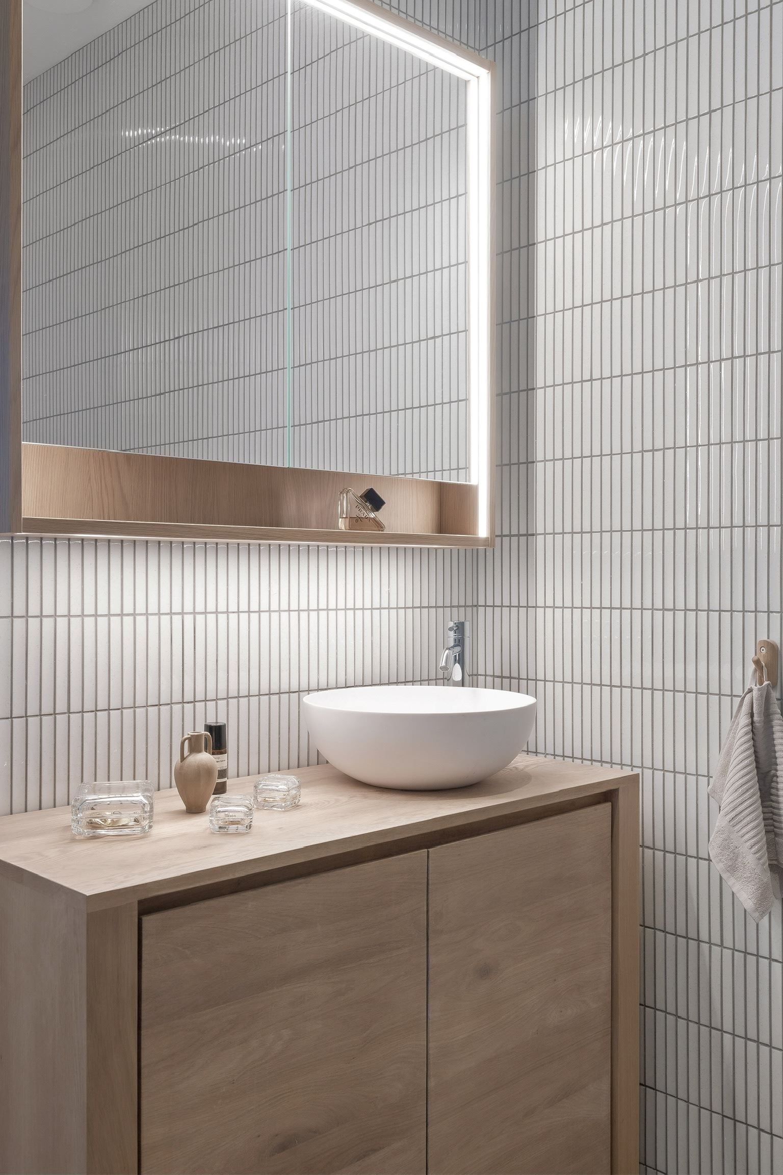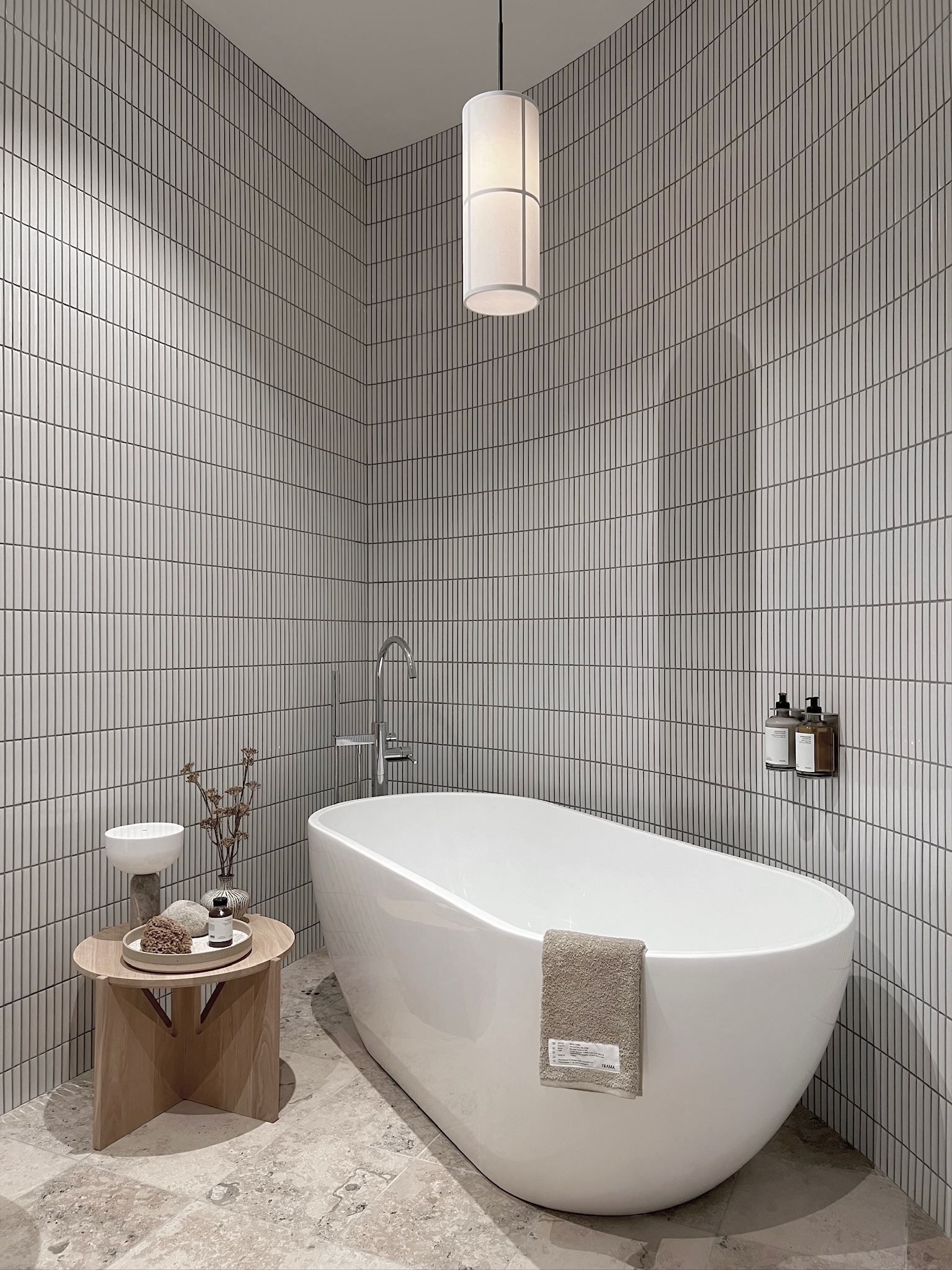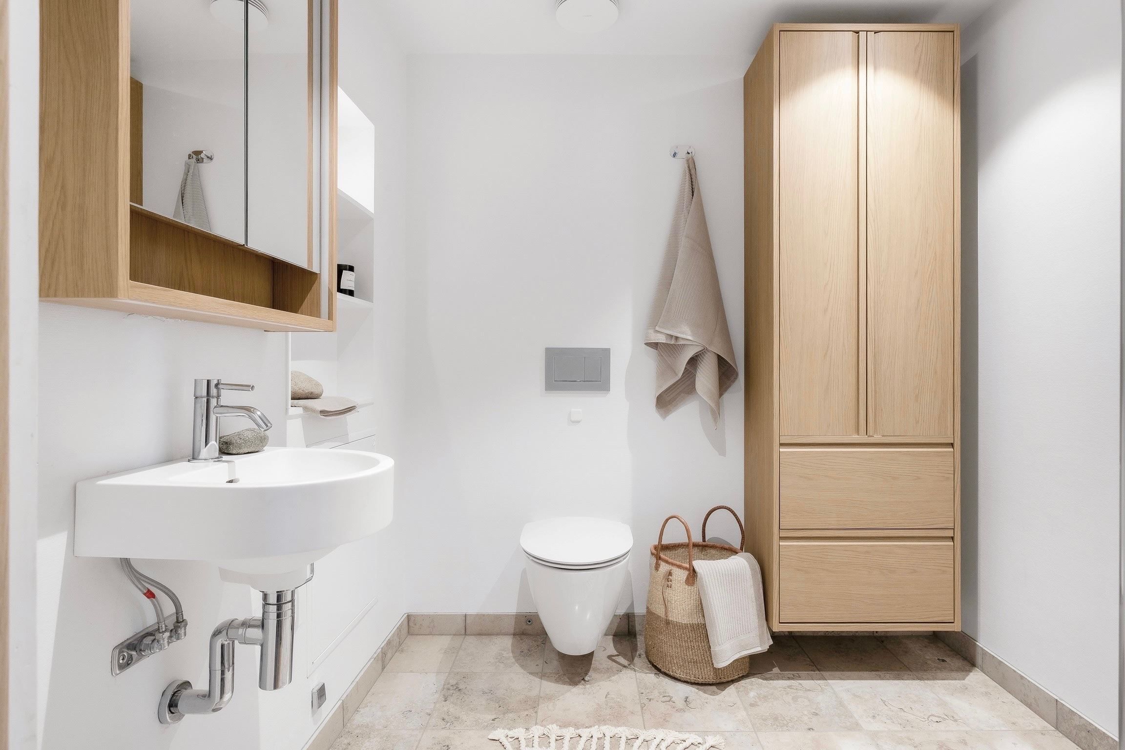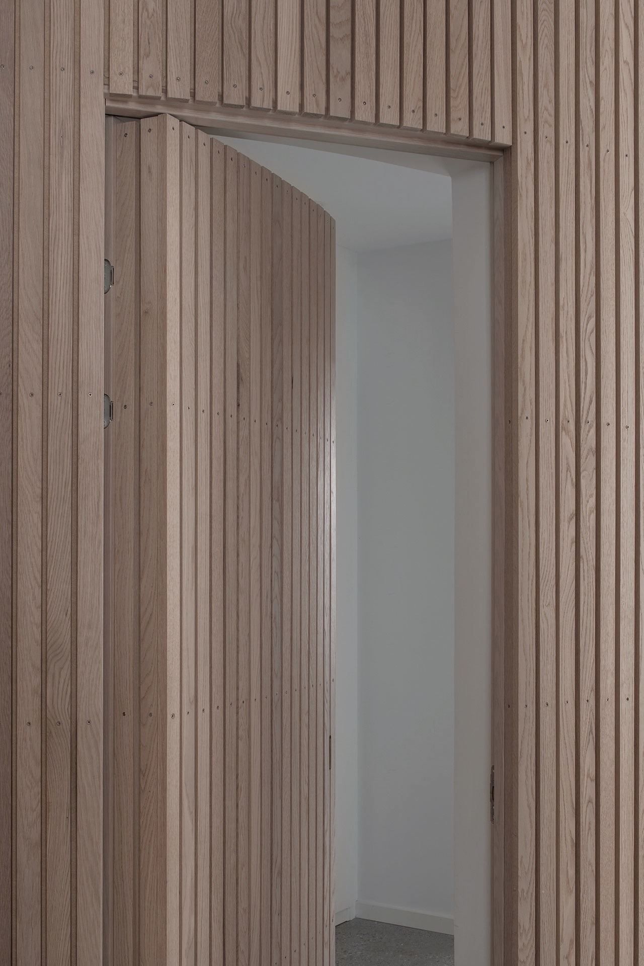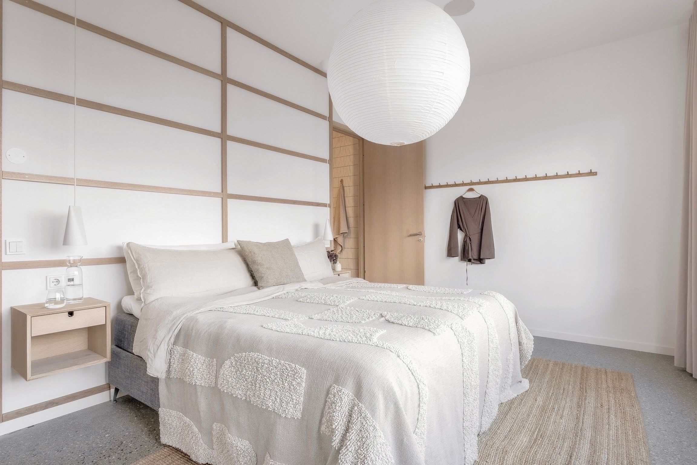 Planlösningen i form av fyra bågar i en mjuk kvadrat har skapat väl avvägda ytor, samband och flöden som böljar naturligt genom bostaden. Rummen är generösa och välplanerade med tilltagen höjd till tak. Det fåtal material som används – betong, ekpanel, kalksten, vit puts – bildar en lugn och behaglig bas och fönsterbandet bjuder på en bred horisontalvy. Nästintill all teknik är snillrikt inbyggd i de bågformade väggarna och spänning skapas av lönndörrar in till sovrummen som även har fått smart dold förvaring.