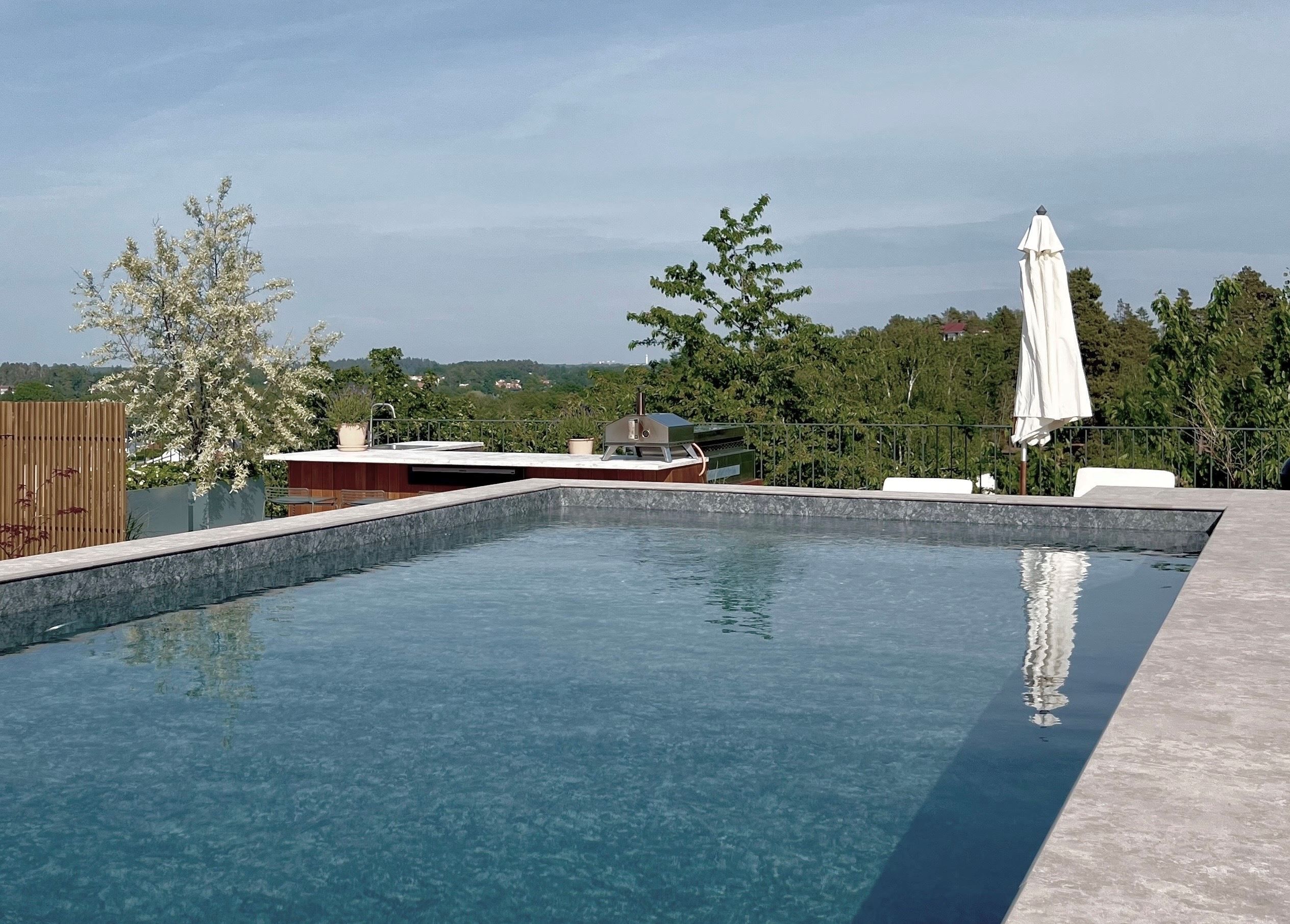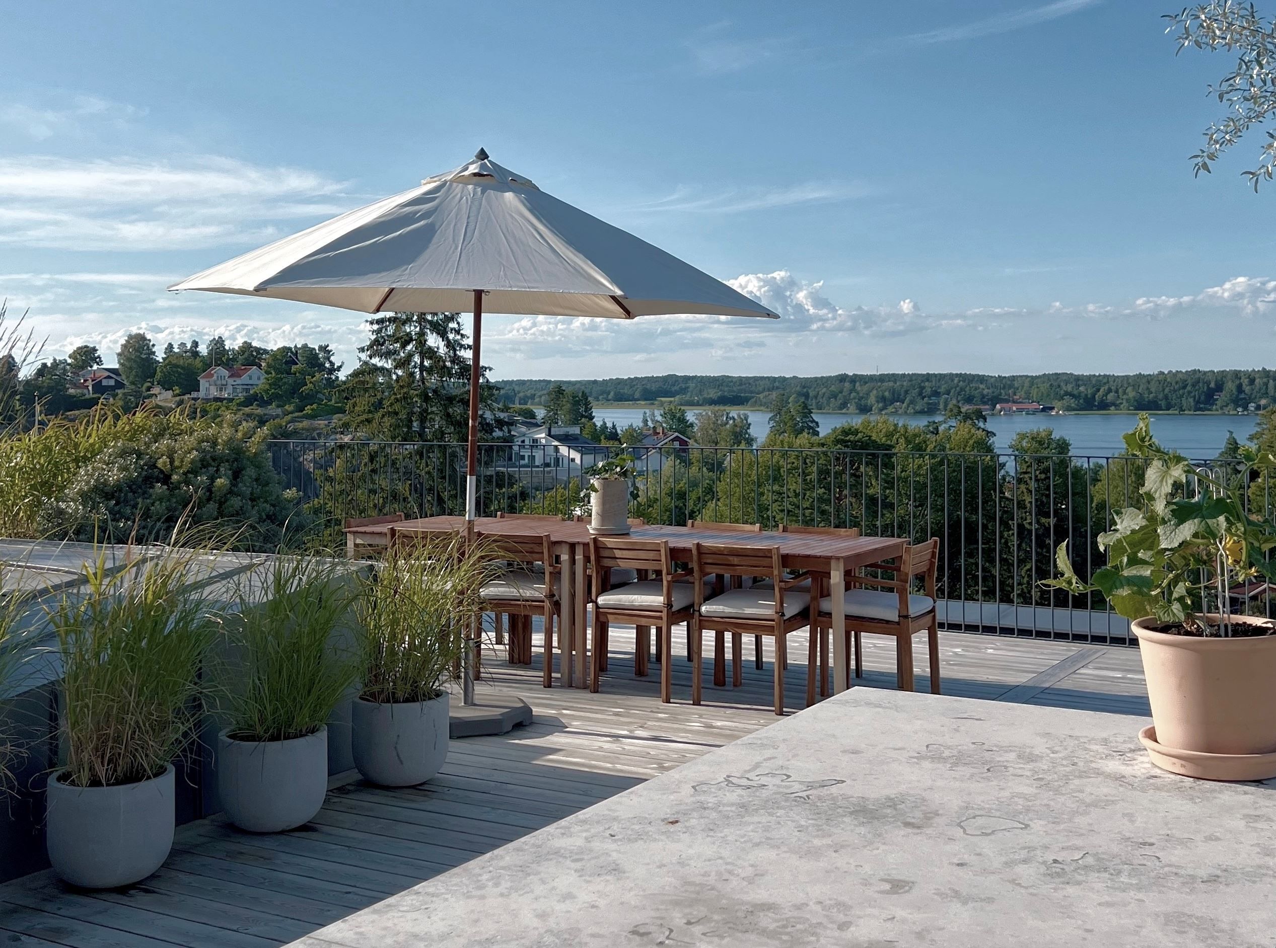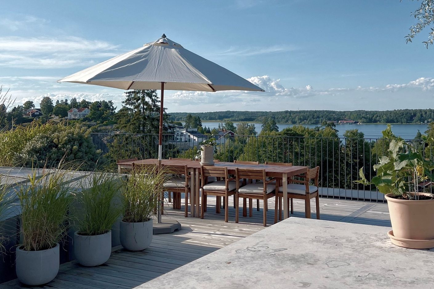 Den imponerande takterrassen är hemmets självklara samlingsplats under årets varma månader. Här finns pool i bästa solläge från morgon till kväll, utedusch, utekök med varmt vatten, loungedel, matplats och vackra planteringar. Från terrassen breder Mälaren ut sig i horisonten och solnedgångarna över sjön är något alldeles extra.