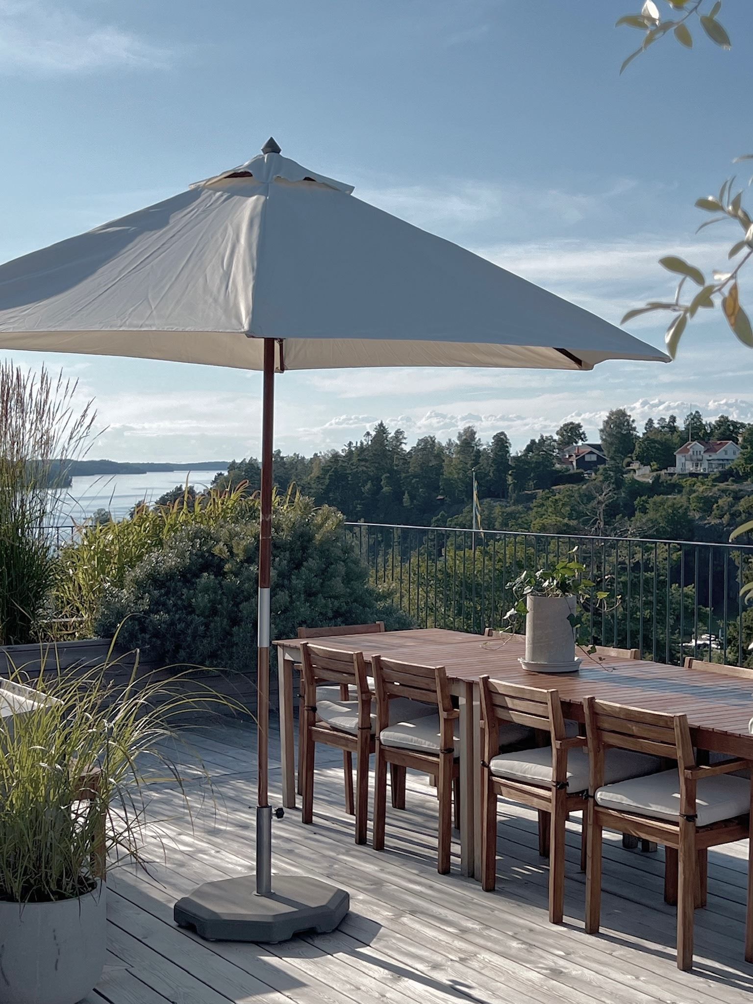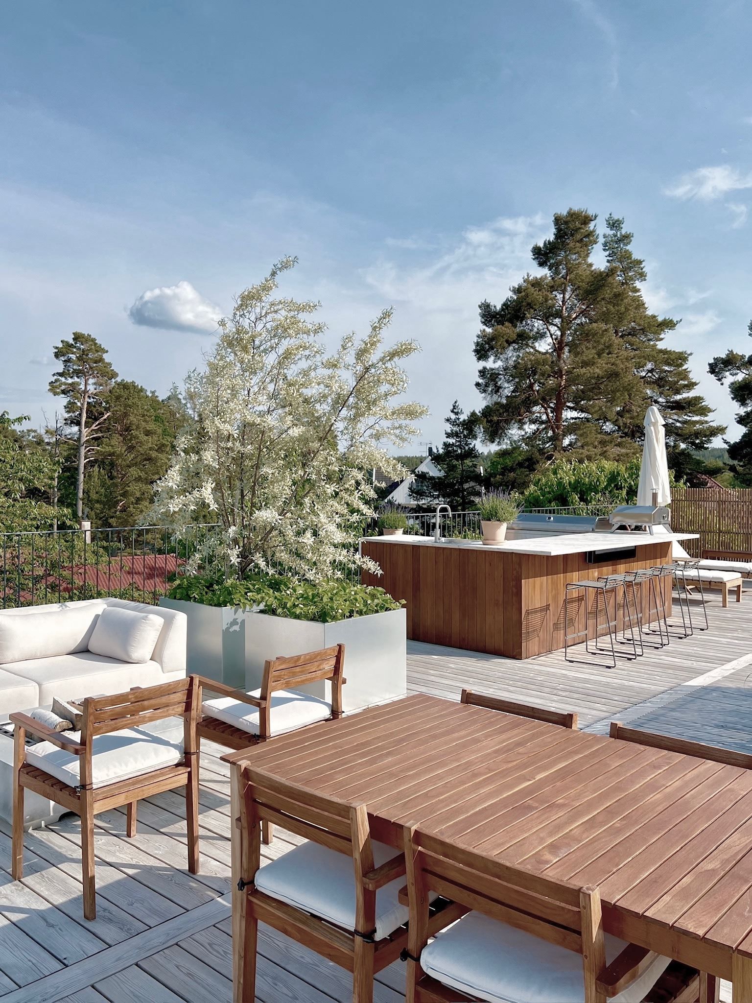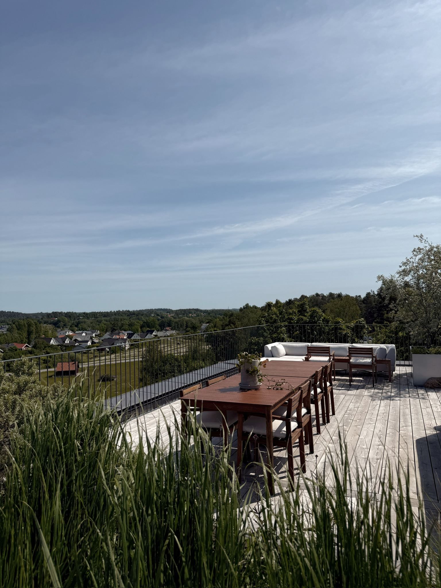 Den imponerande takterrassen är hemmets självklara samlingsplats under årets varma månader. Här finns pool i bästa solläge från morgon till kväll, utedusch, utekök med varmt vatten, loungedel, matplats och vackra planteringar. Från terrassen breder Mälaren ut sig i horisonten och solnedgångarna över sjön är något alldeles extra.