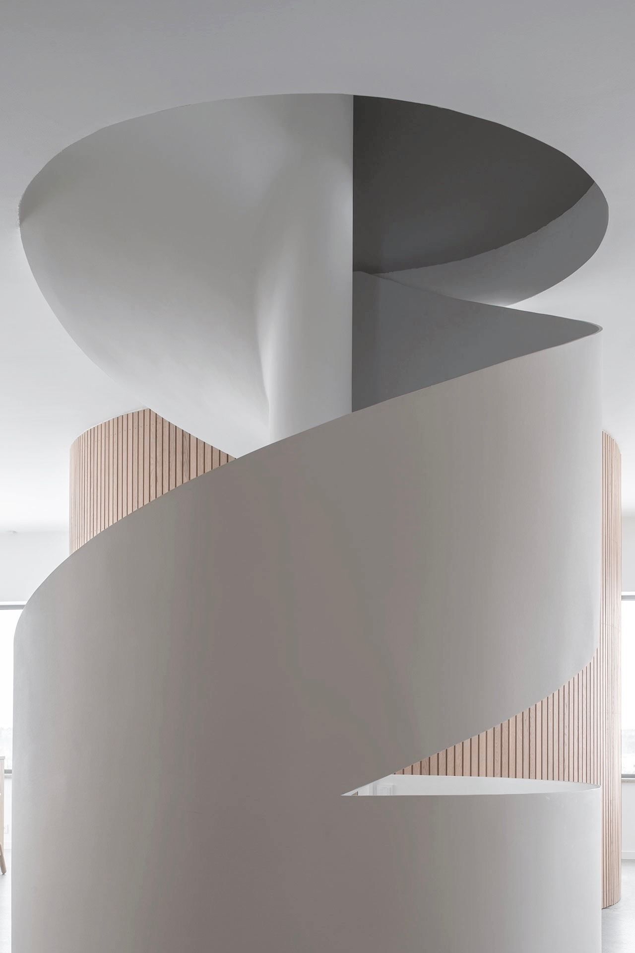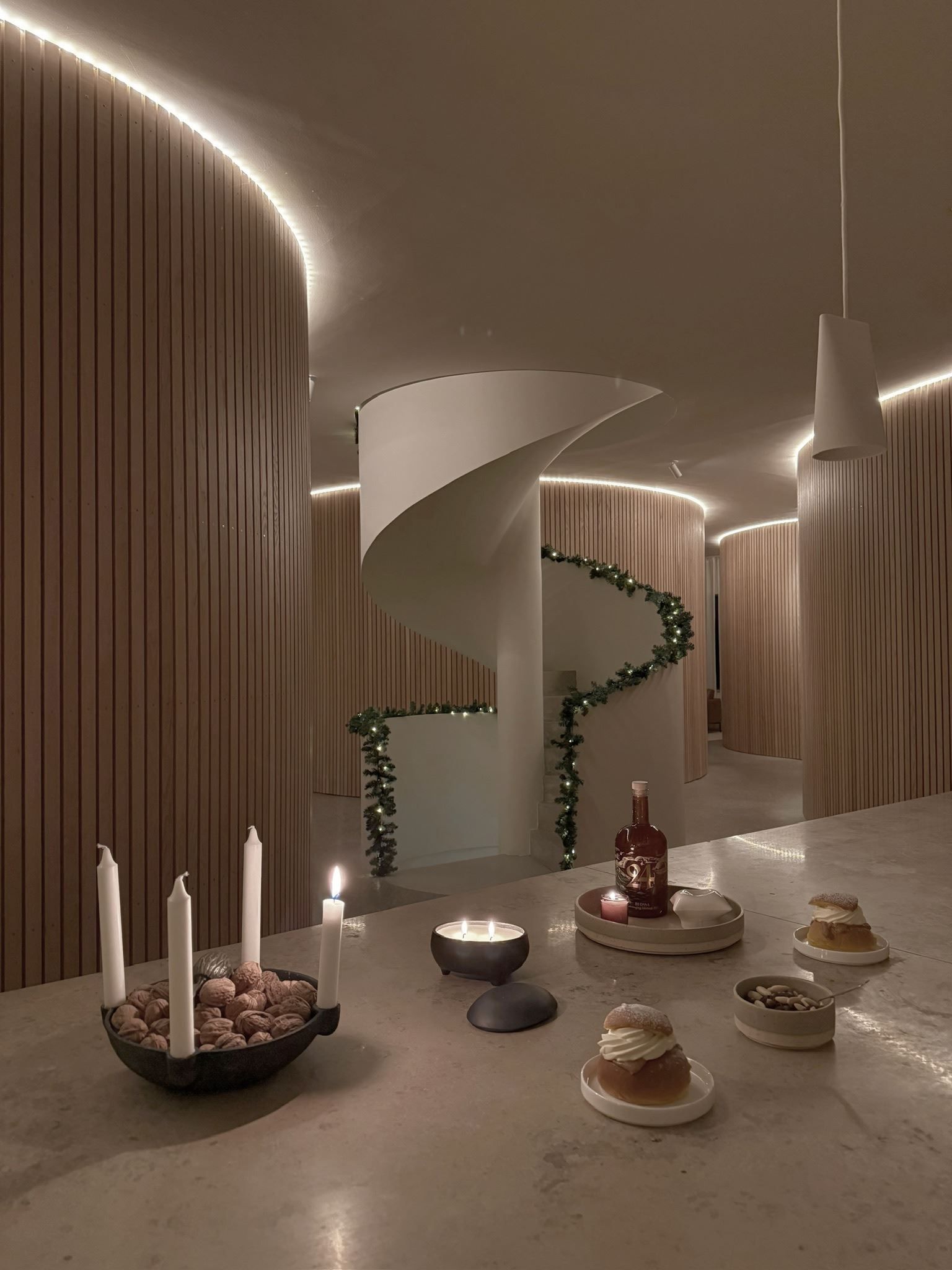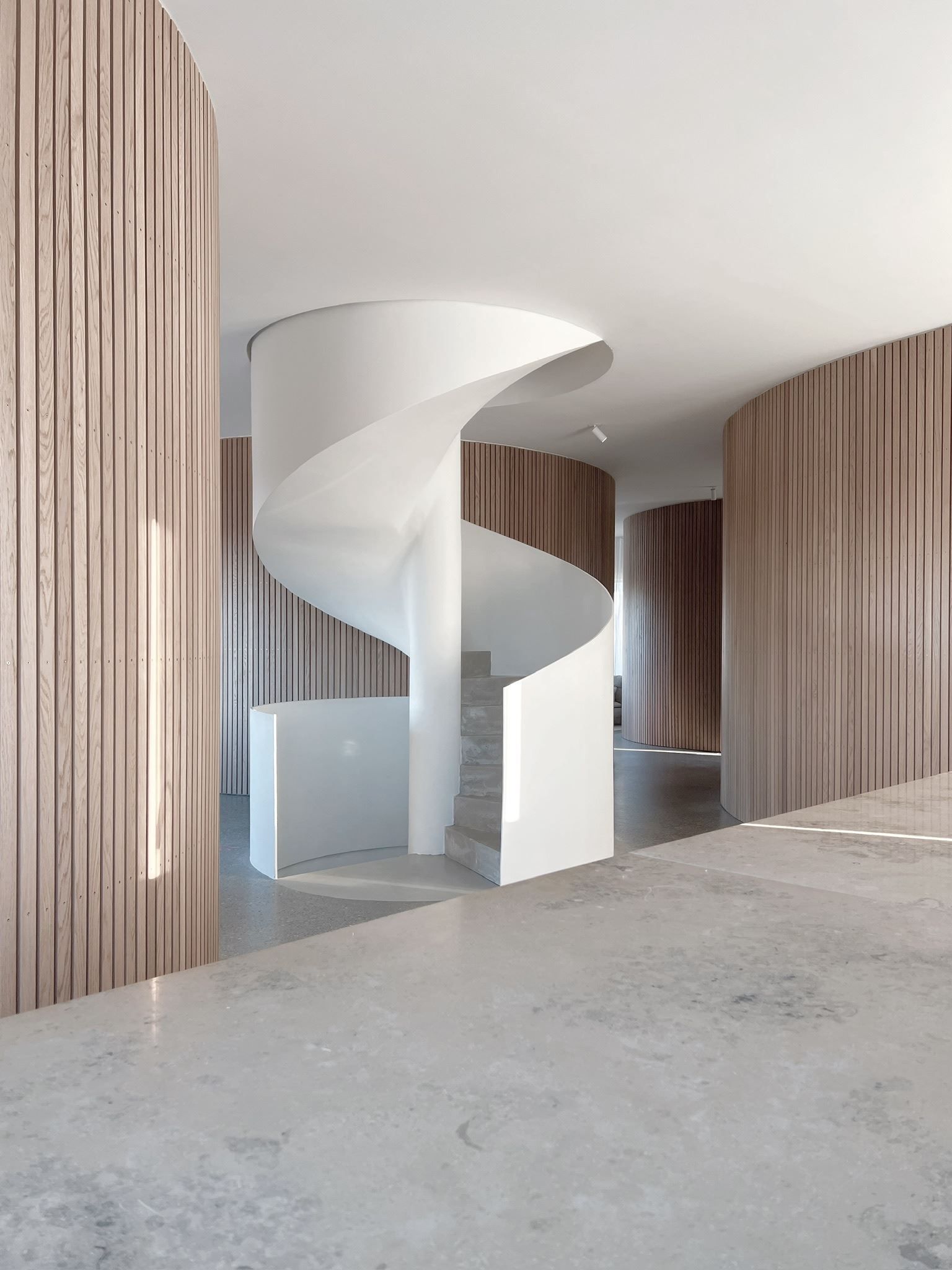 Centralt i huset står den skulpturala spiraltrappan i helgjuten betong som elegant binder samman våningsplanen och leder upp till takterrassen via en specialbyggd lanternin. Materialvalen är konsekvent genomförda med vitoljad ek, rundade ribbväggar i massivt trä, kalksten och slipade betonggolv med vattenburen golvvärme – en kombination som skapar en sober, exklusiv känsla. Huset är utrustat med avancerad hemautomation där belysning, värme och säkerhet kan styras direkt från mobilen.