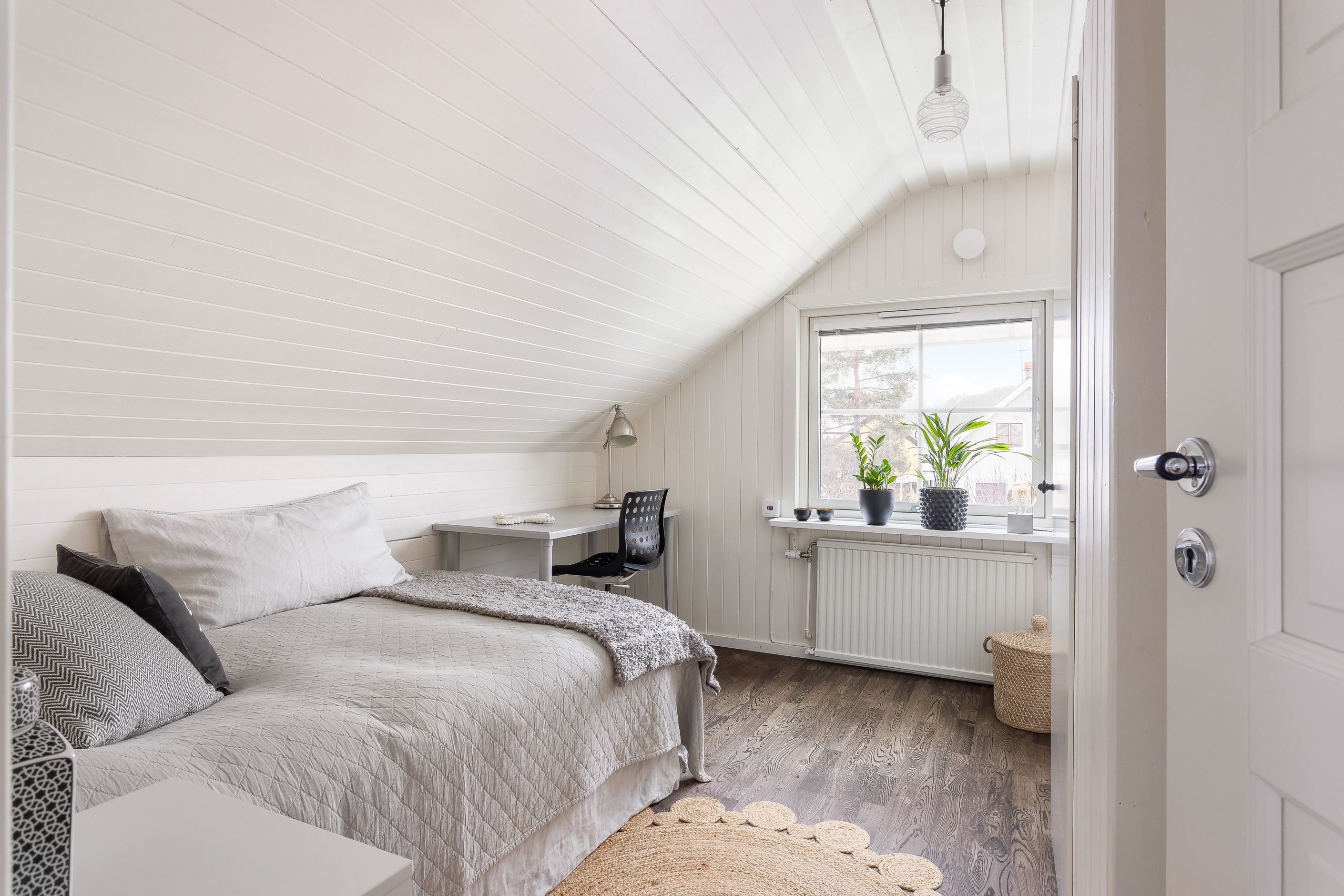 ÖVRE PLAN som nås via vitmålad trappa från hallen. ÖVRE HALL med läshörna och utgång till takaltan samt tre bra SOVRUM. Genomgående trägolv och stilfull färgsättning. DUSCHRUM som är helkaklat i vitt och grått.