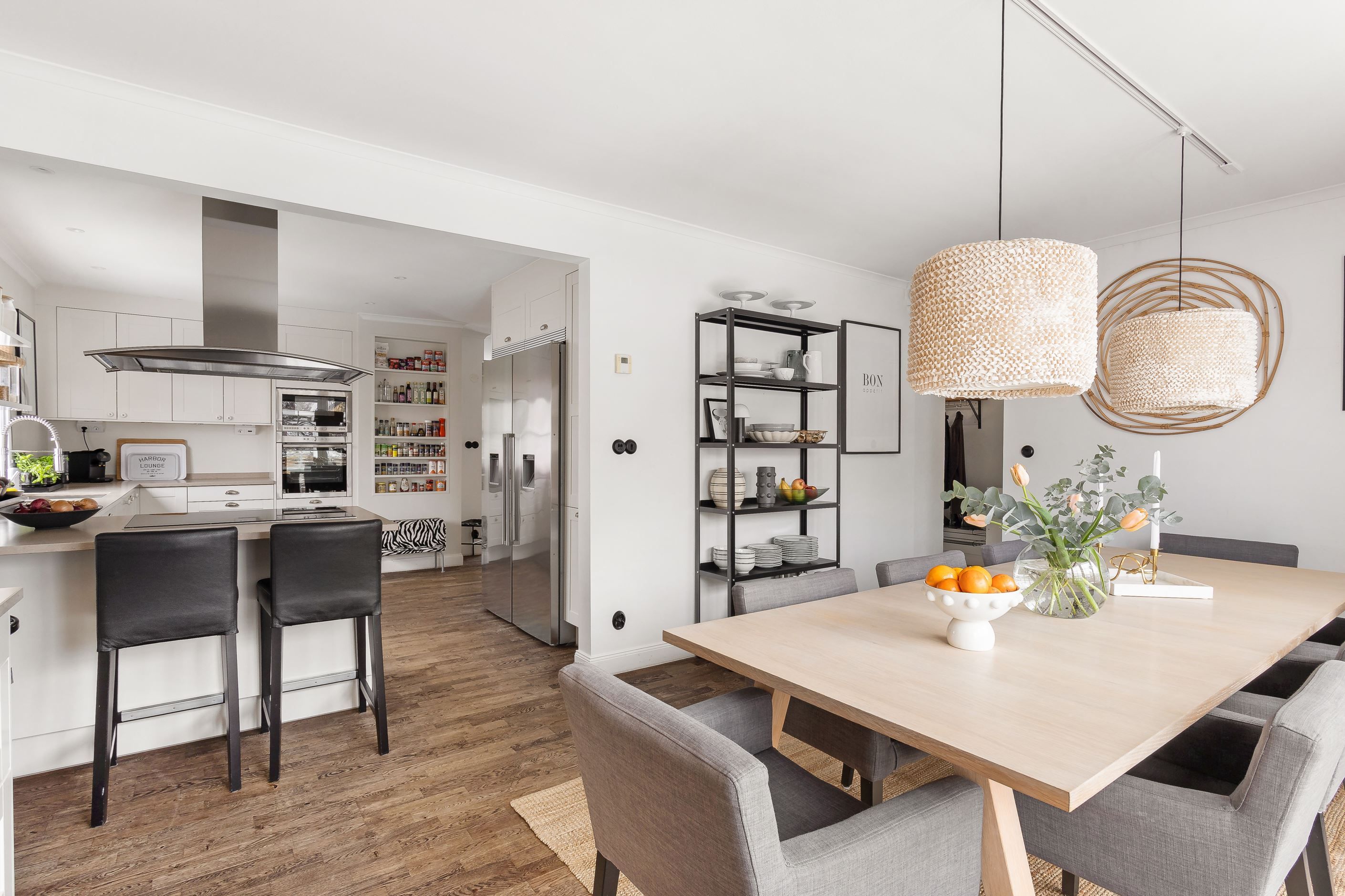 I sällskapsdelen, med två rum i fil, finns gott om plats för såväl soffgrupp som MATSALSDELEN för det stora sällskapet. Platsbyggd förvaring med bla vinkyl samt gott om förvaring skapar fin atmosfär och adderar trivsel.