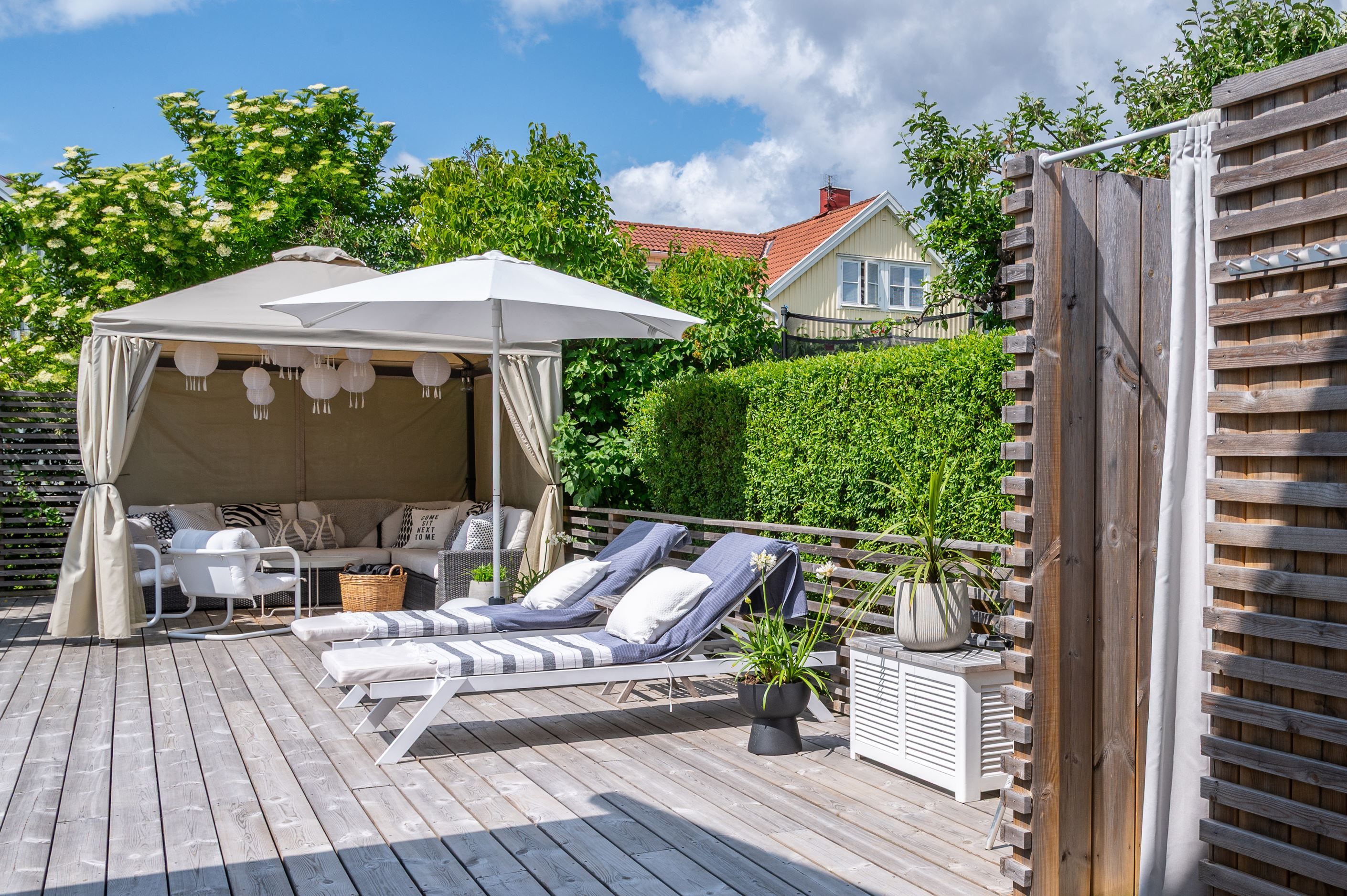 SÄLLSKAPSYTA i öppen planlösning vilket ger härlig rymd och fint ljus. Glasade dörrar via matsalsdelen ut mot generös ALTAN under tak, ett extrarum den varma årstiden med fin vy och smidig access till pooldäcket. Den generöst glasade ytan ger en härlig kontakt med uteliv och trädgård, precis vad man drömmer om när man lämnar lägenheten för ett friare villaliv.