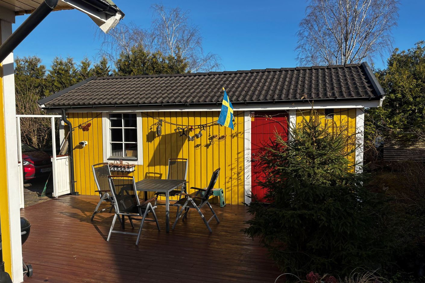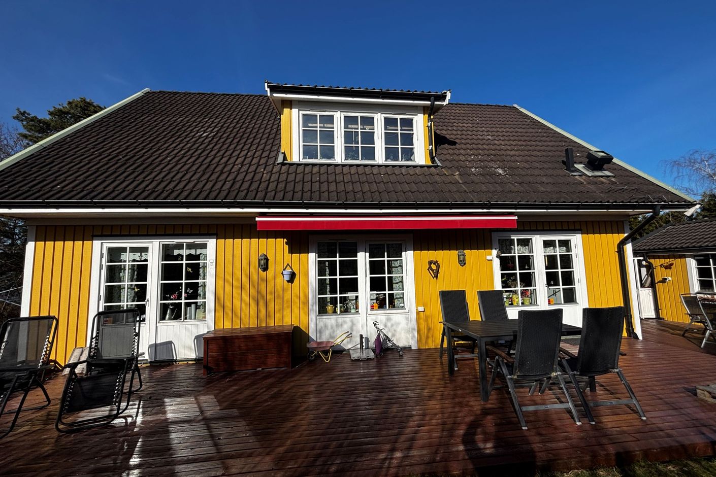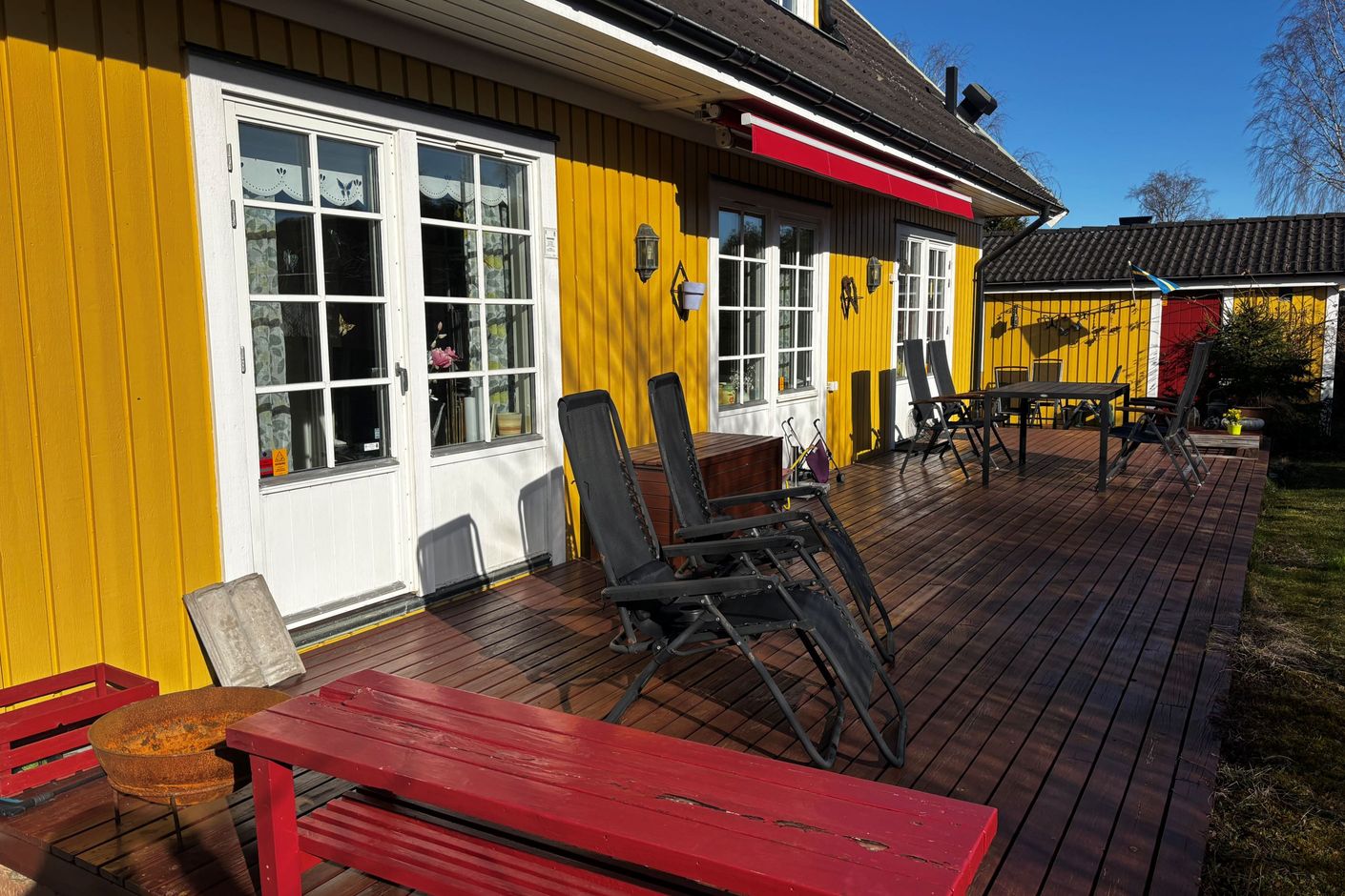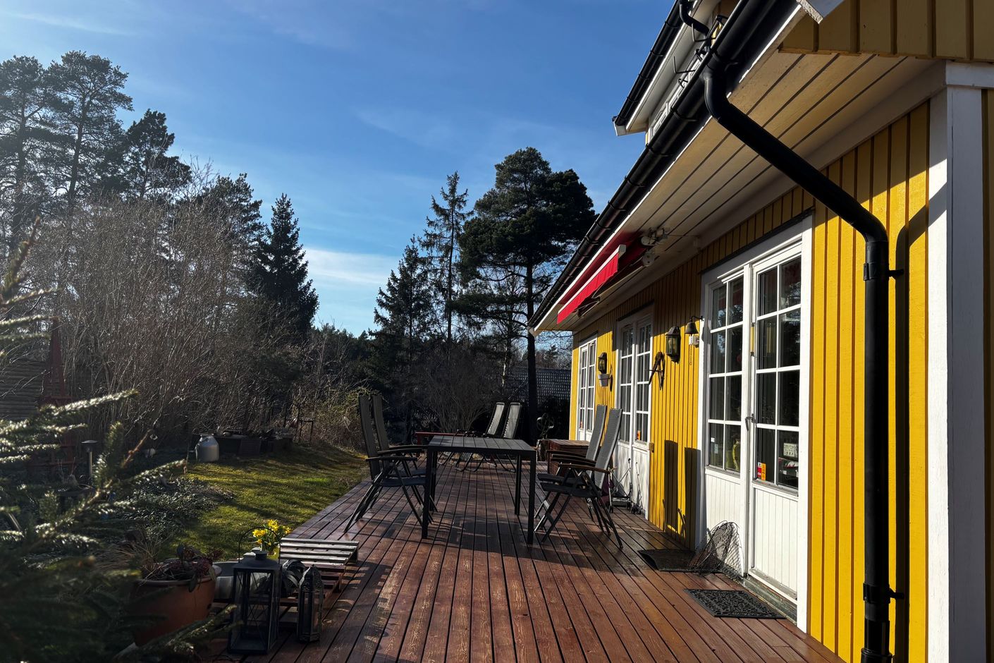 Den generösa och soliga tomten är en riktig oas med en stor, trälagd uteplats om ca 60 kvm med markis, som löper runt halva huset. Här finns gott om plats för både matgrupp och loungehörna – en självklar samlingsplats för familj och vänner under årets varmare månader.
