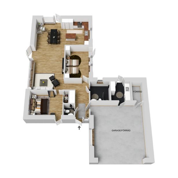 Innanför dörrarna möts du av en välplanerad och ljus interiör. Högt i tak och stora fönsterpartier skapar en luftig atmosfär och ger ett naturligt flöde av ljus genom rummen. Golvvärme i hela huset ger extra komfort under kalla vinterdagar.