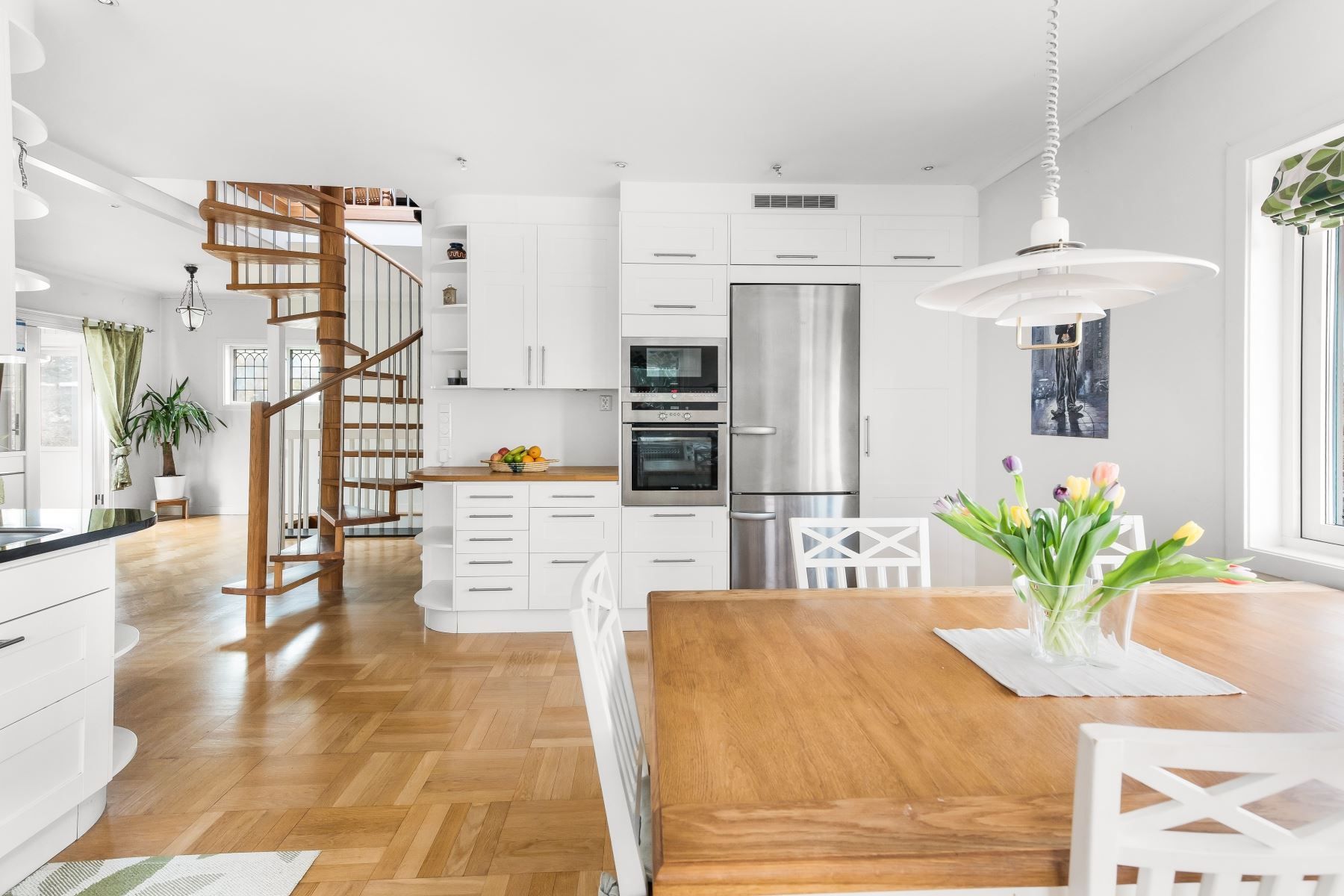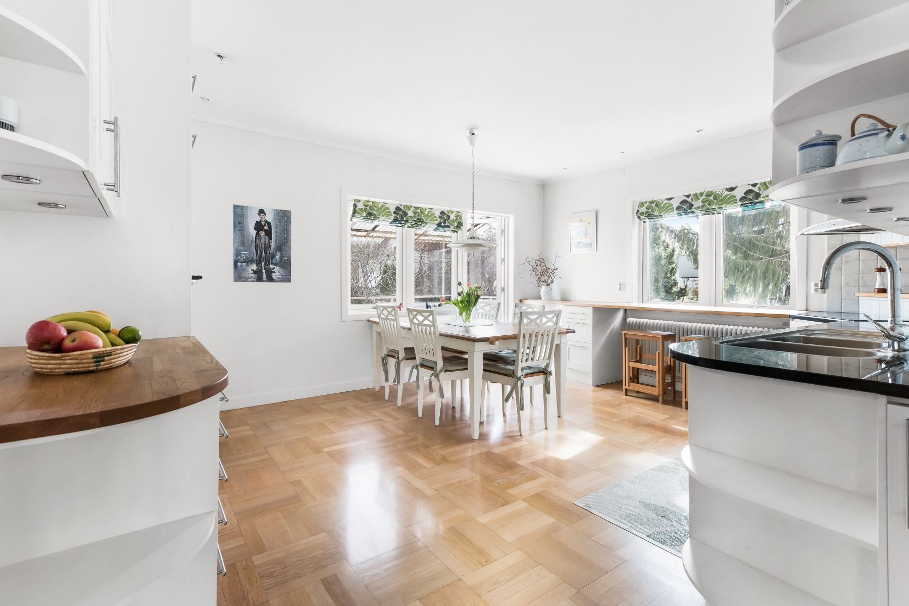 På entréplanet finner du en välkomnande hall med gott om extra förvaring, extra wc, vardagsrum samt en charmig läshörna i burspråk, sovrum, tvättstuga kombinerat med badrum. På det övre planet så finner du ett kök med generösa ytor för den större familjen, samt en anslutande balkong mot framsidan, två bra sovrum, wc samt en inglasad veranda som verkligen blir en förlängning av årets varmare månader. Via en spiraltrappa från det övre planet tar man sig upp till ett stort allrum på vindsplanet. Detta rum kan inredas till att bli ytterligare två bra sovrum. Kort promenad till t-bana som tar dig in till city på 16 min. Bergvärme som ger låga driftkostnader, stort garage samt extra förvaringsutrymme på baksidan av tomten.
