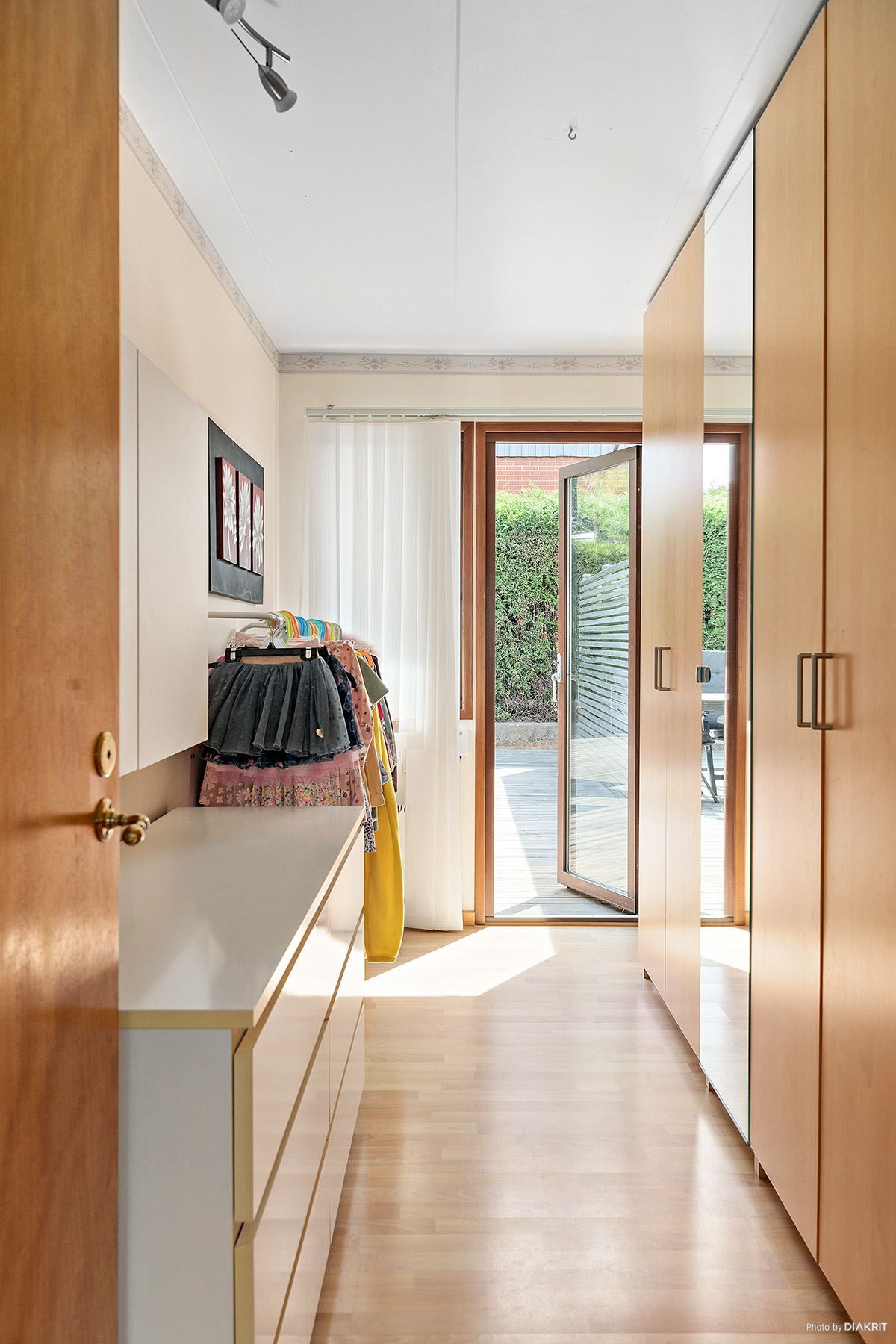 Till höger om hallen finner du det stilfullt renoverade köket. Här har man valt tidlösa ekluckor och en praktisk köksö som inbjuder till både matlagning och umgänge. Köket är modernt utrustat och ger ett elegant intryck. Mittemot köket finns ytterligare ett sovrum med utgång till den mysiga altanen. Detta rum används idag som en rymlig Walk-in closet, men kan enkelt återställas till sovrum vid behov.
