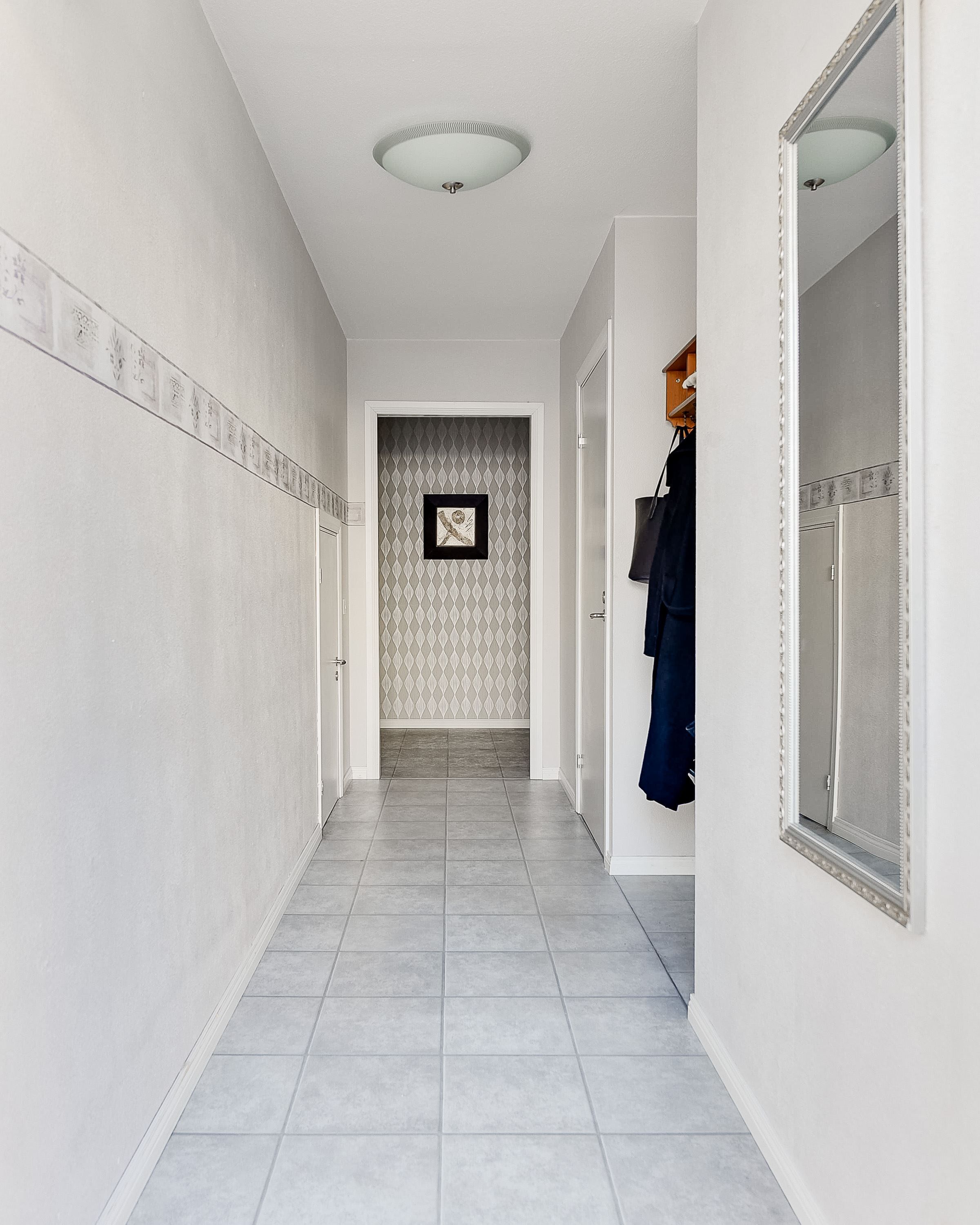 Redan i hallen möts du av ett luftigt intryck, gråmelerat golv som sträcker sig vidare till köket, klädavhängning och en rymlig klädkammare.