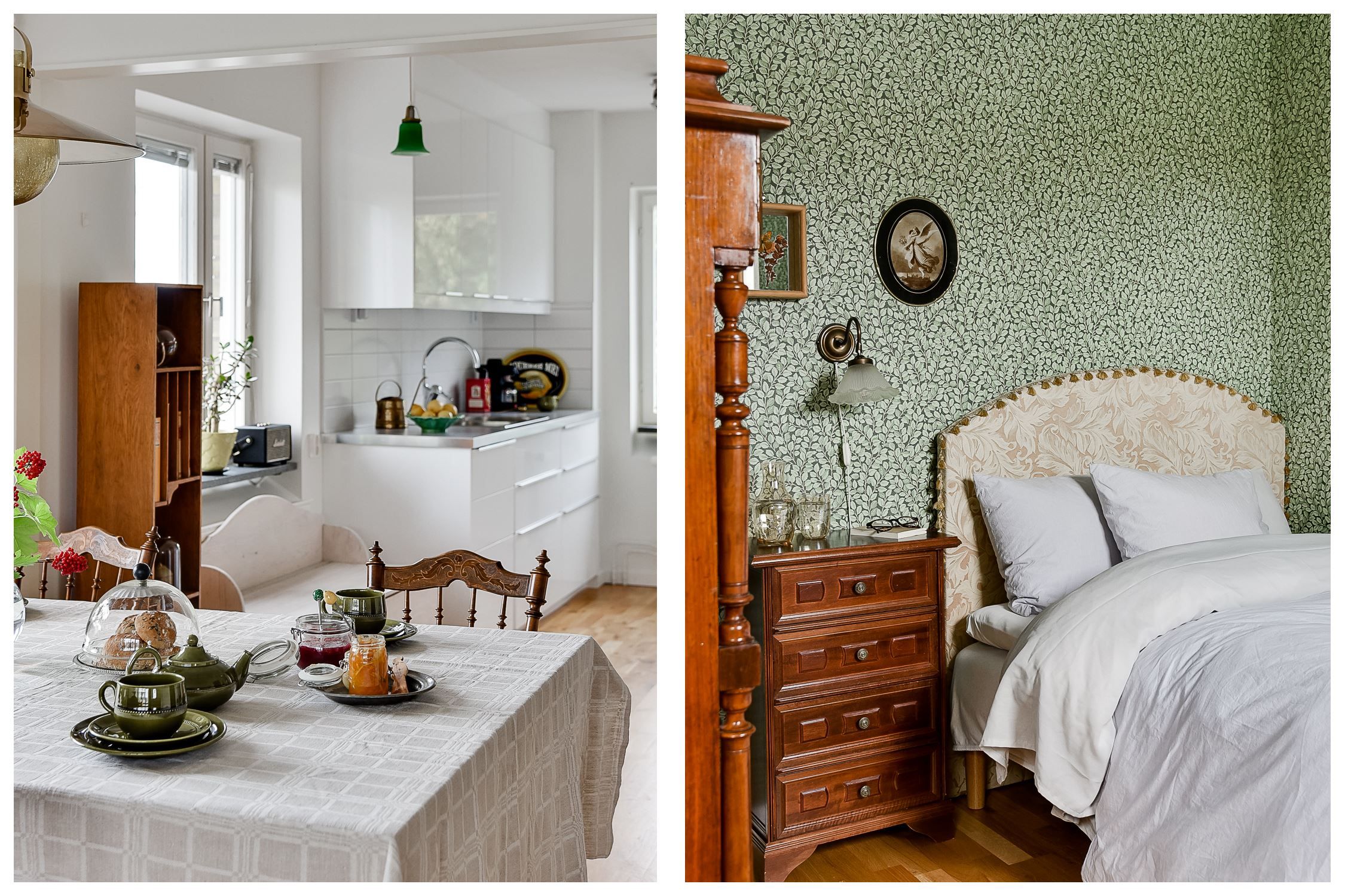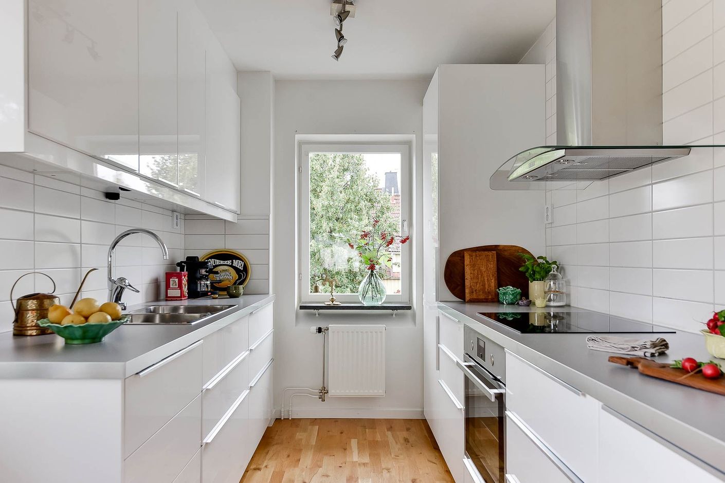 Bostaden präglas av ett generöst ljusinsläpp från tre väderstreck, vilket skapar en ljus och levande känsla genom hela hemmet. De genomgående ljusa väggarna tillsammans med en enhetlig ekparkett ger ett varmt och harmoniskt intryck. Planlösningen är social och väl genomtänkt, med ett smakfullt renoverat kök i öppen anslutning till matplats och vardagsrum. Köket är fullt utrustat med moderna vitvaror som kombinerad kyl/frys, induktionshäll, inbyggnadsugn och diskmaskin. Här finns gott om arbetsyta och förvaring, och rummet binds samman på ett sätt som känns både funktionellt och inbjudande.