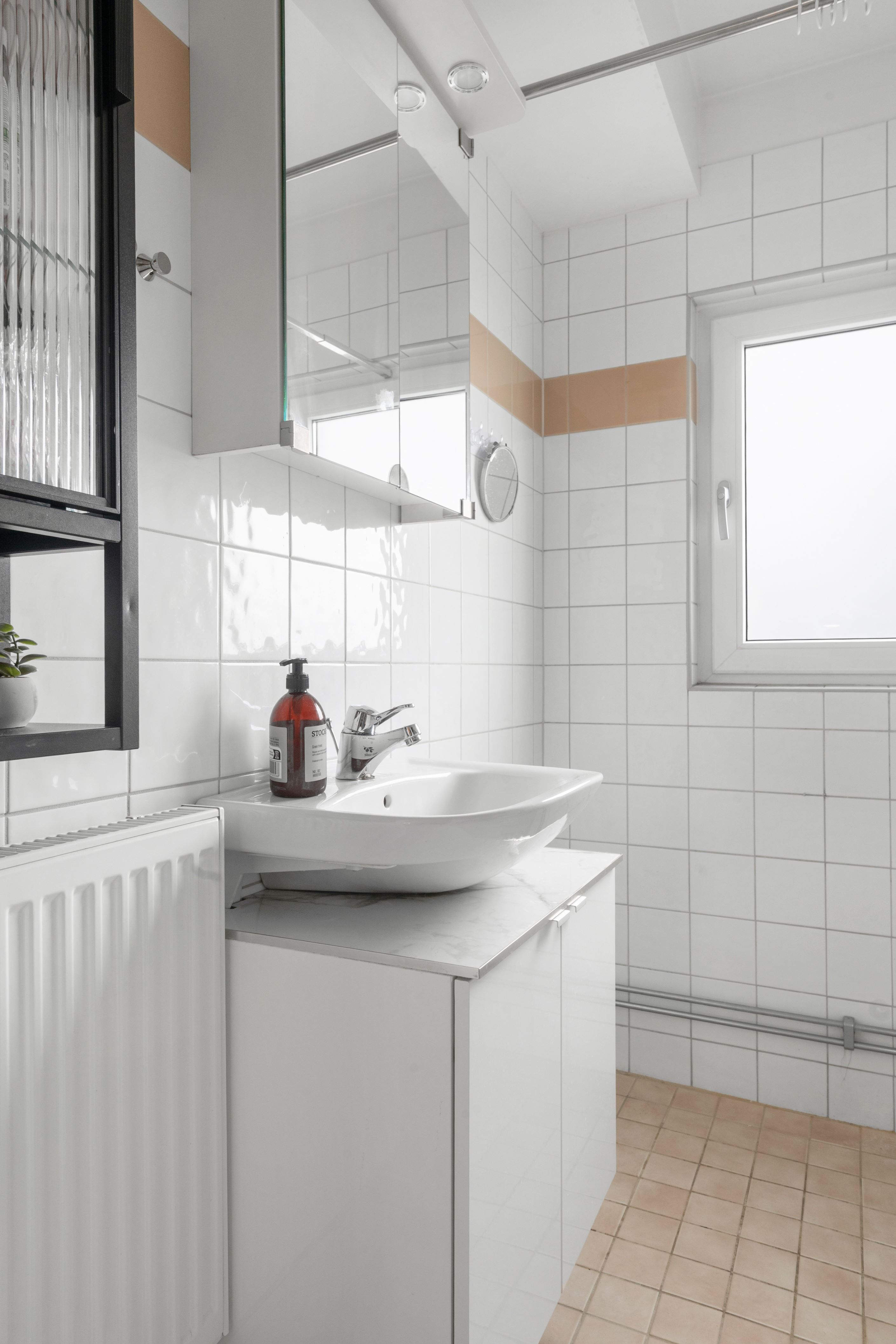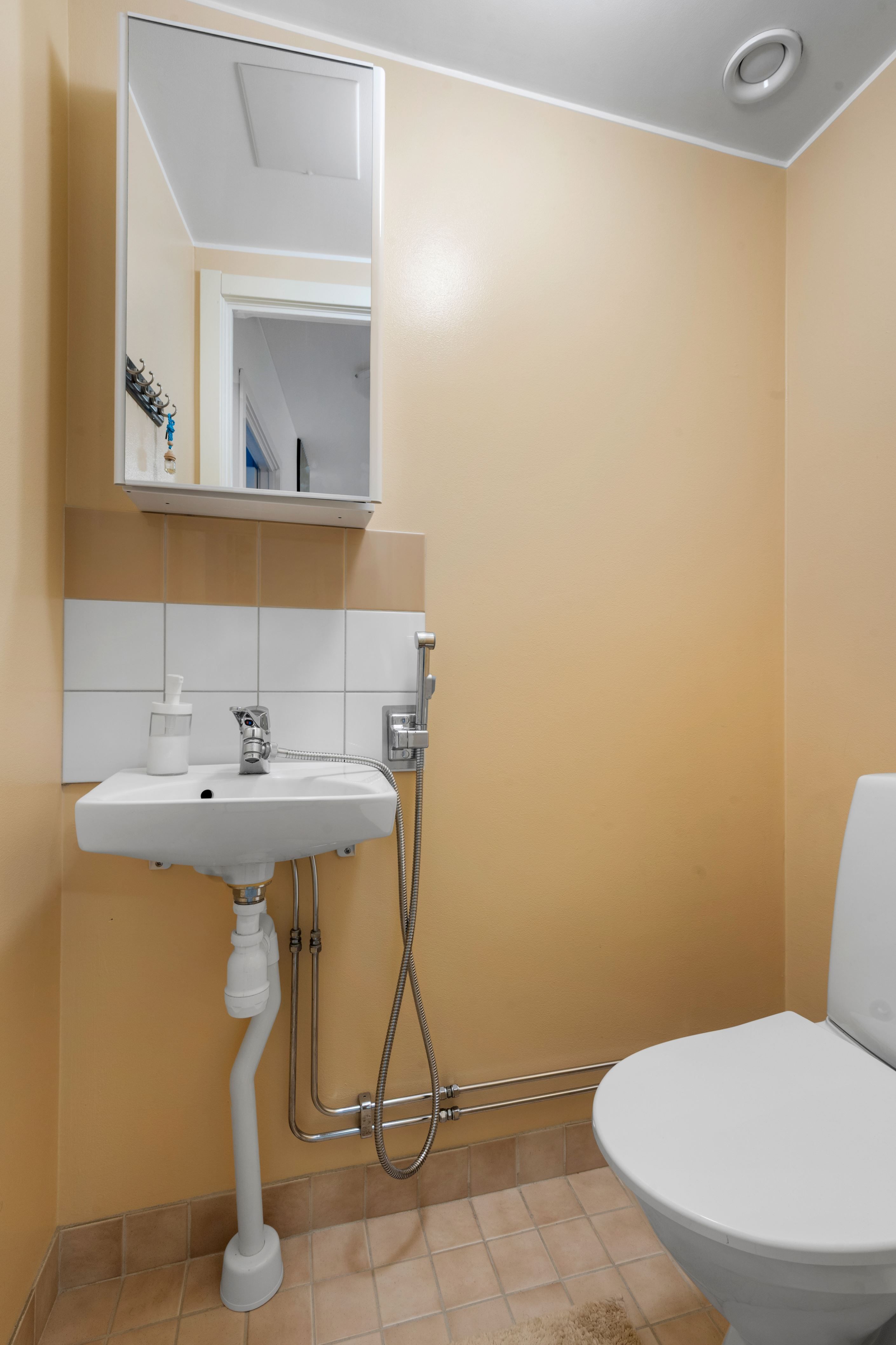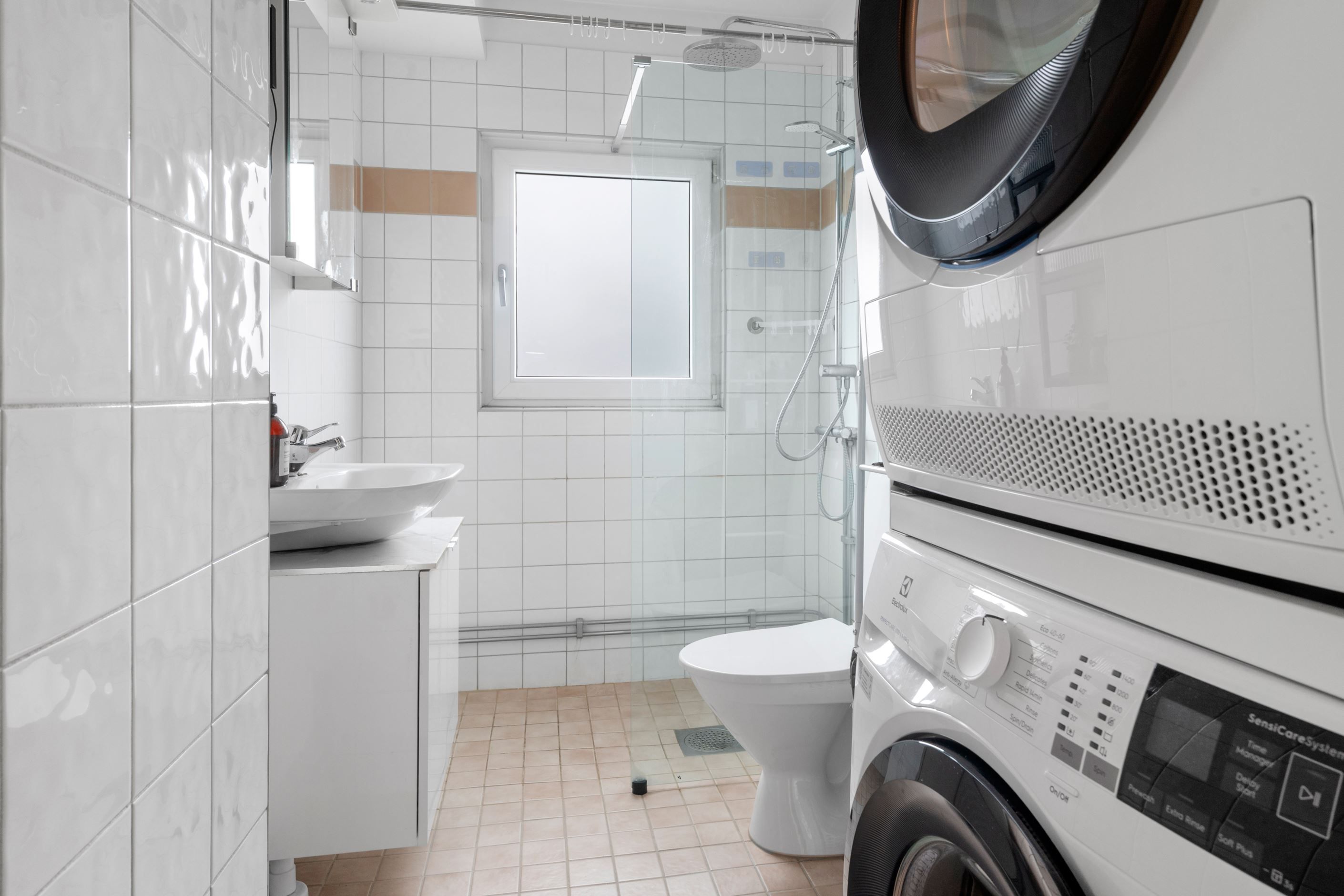 Stambytt badrum och gäst toalett. Badrummet stilrent renoverat med moderna ytskikt och bekvämligheter såsom dusch, handfat med kommod och förvaringslösningar. Ett hem att trivas i – genomtänkt och funktionellt med alla förutsättningar för en bekväm vardag.