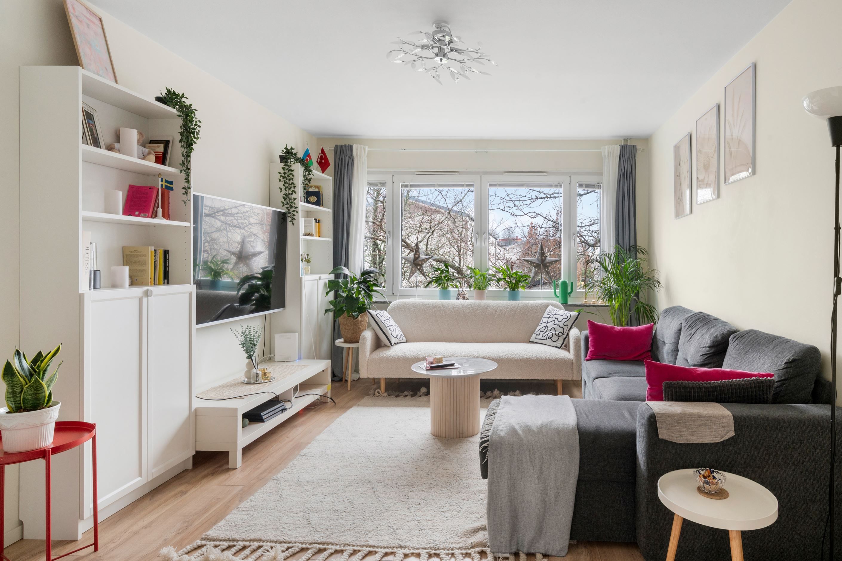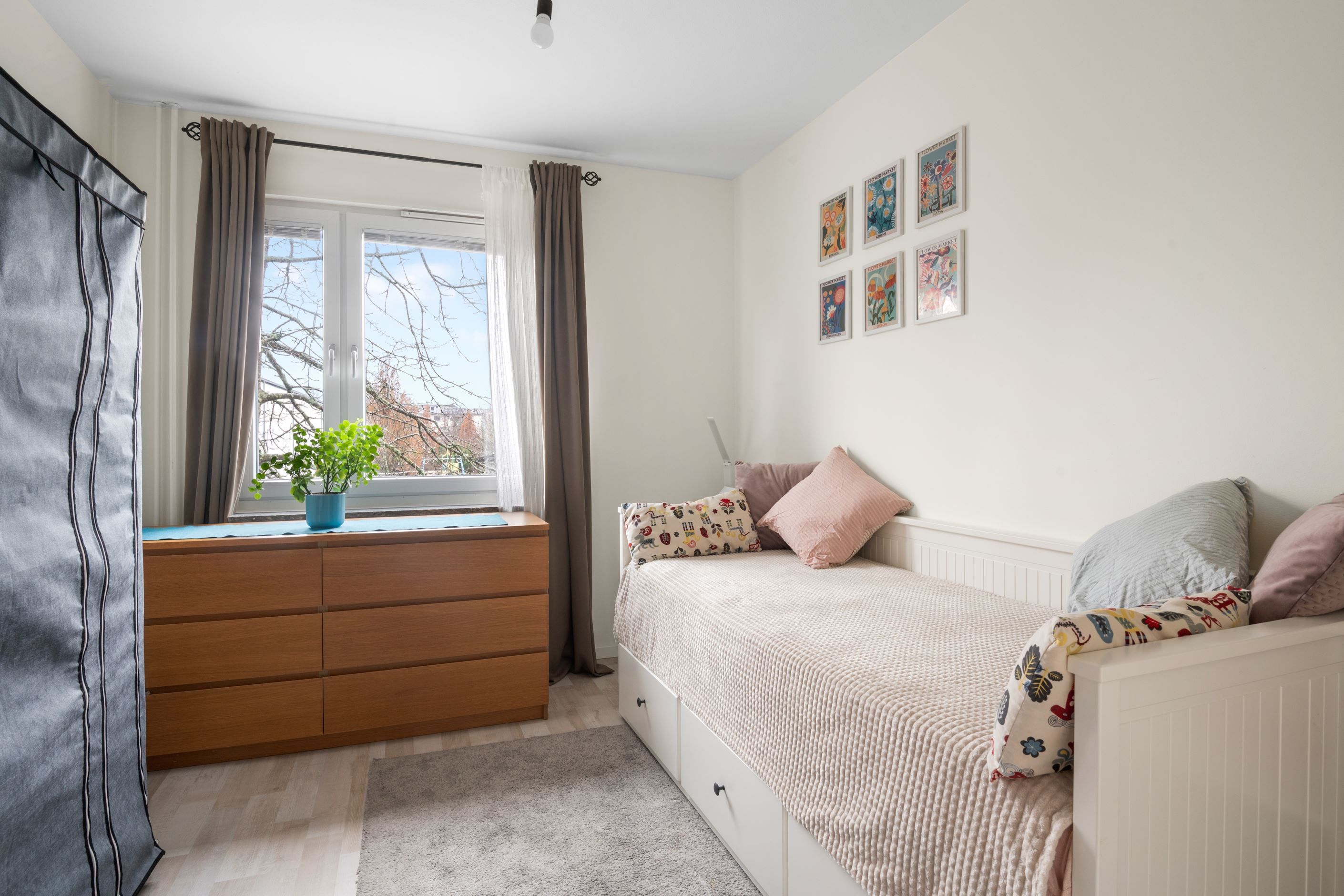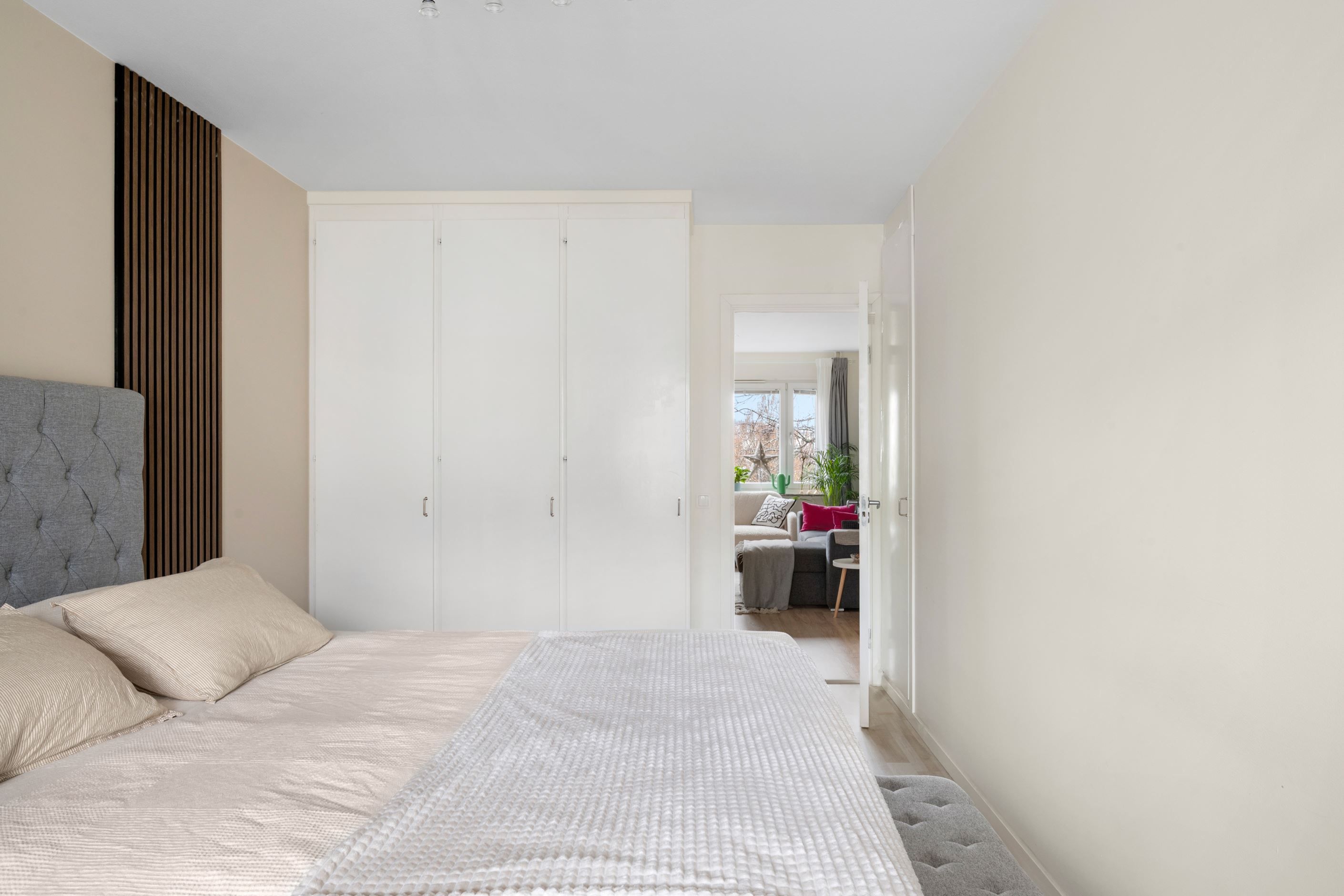 Vidare erbjuds två väl tilltagna sovrum med plats för dubbelsäng, förvaring och skrivbord – idealiska som både master bedroom och barnrum, gästrum eller hemmakontor. Det stora och luftiga vardagsrummet bjuder in till umgänge och avkoppling med plats för både soffgrupp och matsalsmöbel. De stora fönsterpartierna ger rikligt med ljusinsläpp och skapar en härlig rymd.