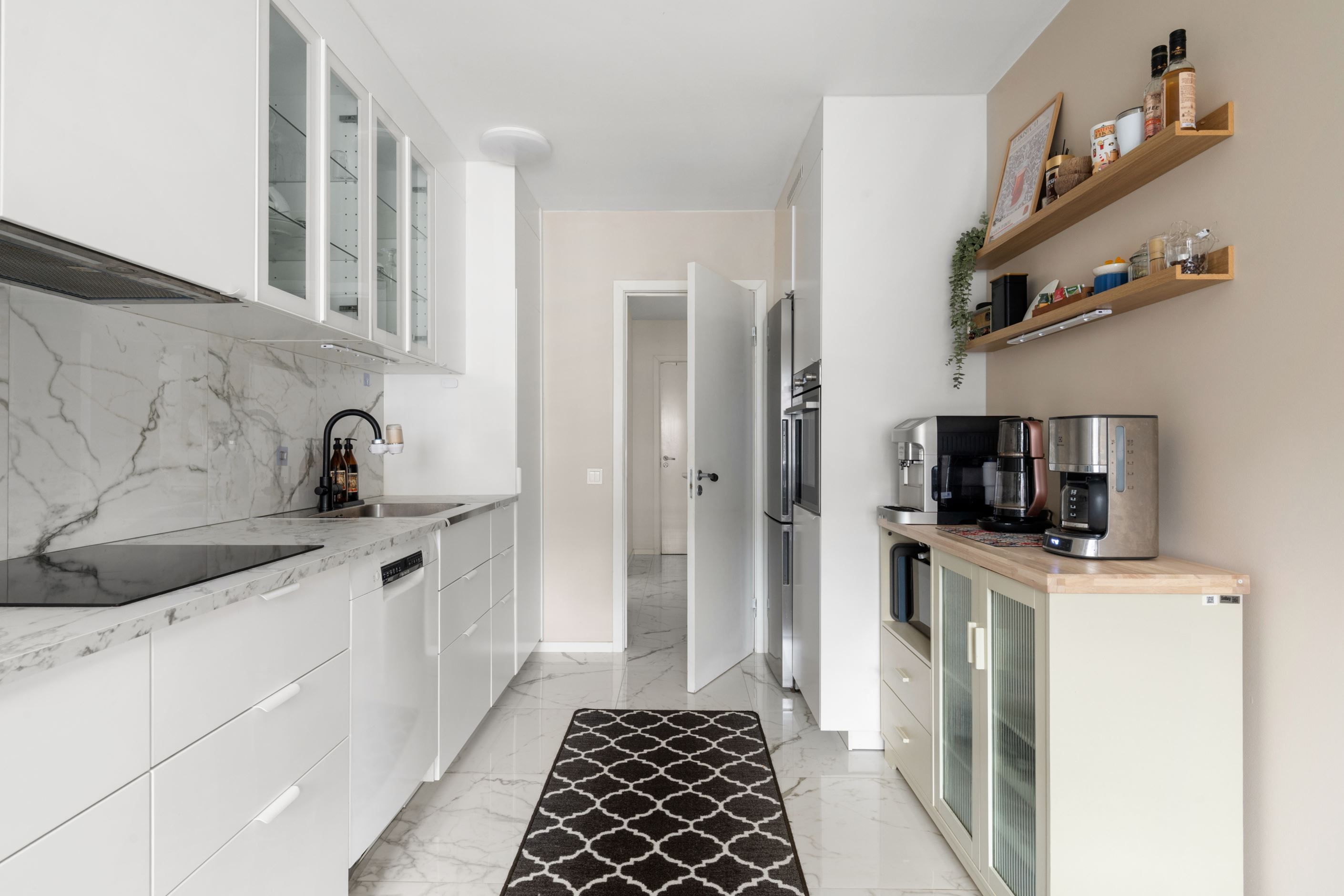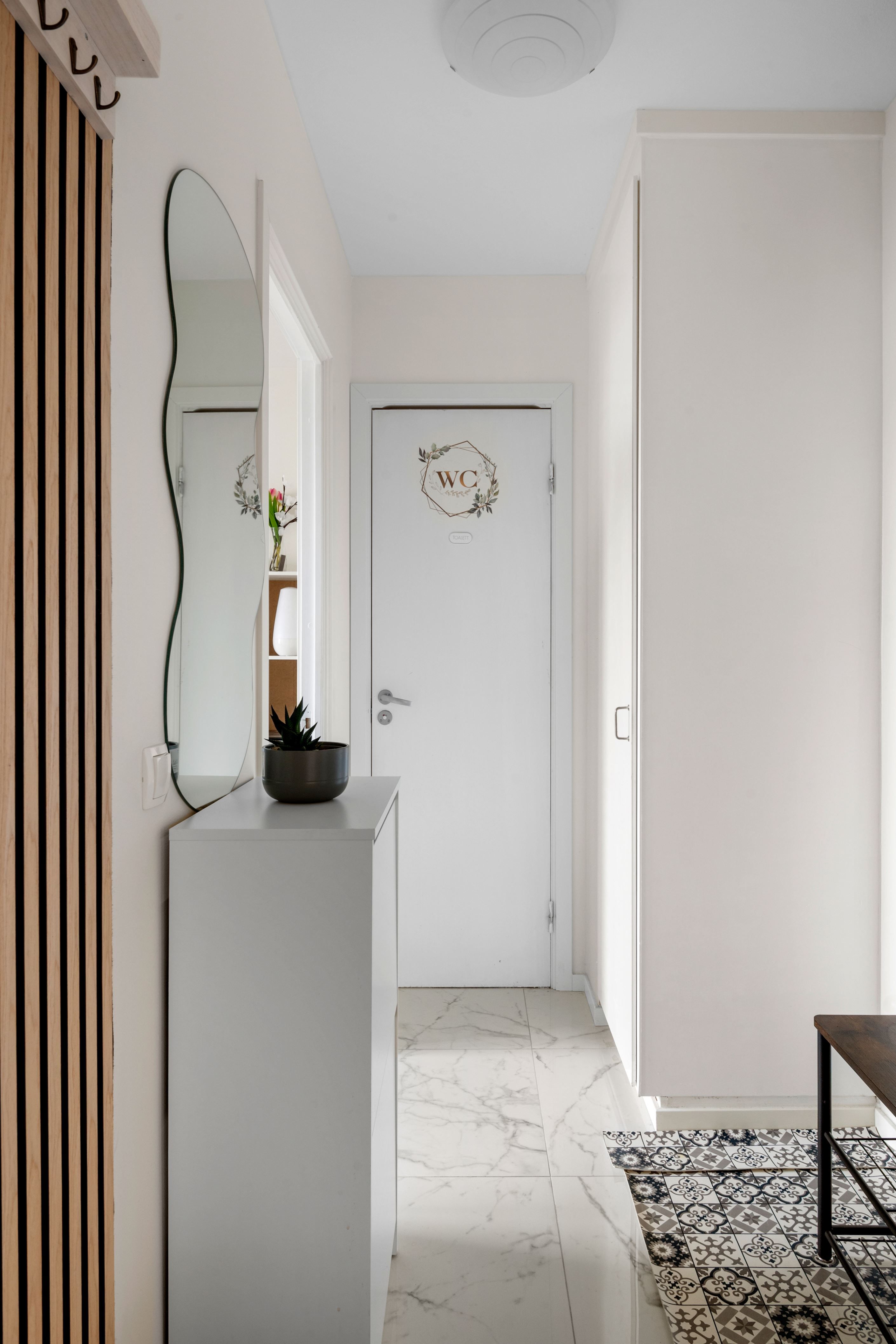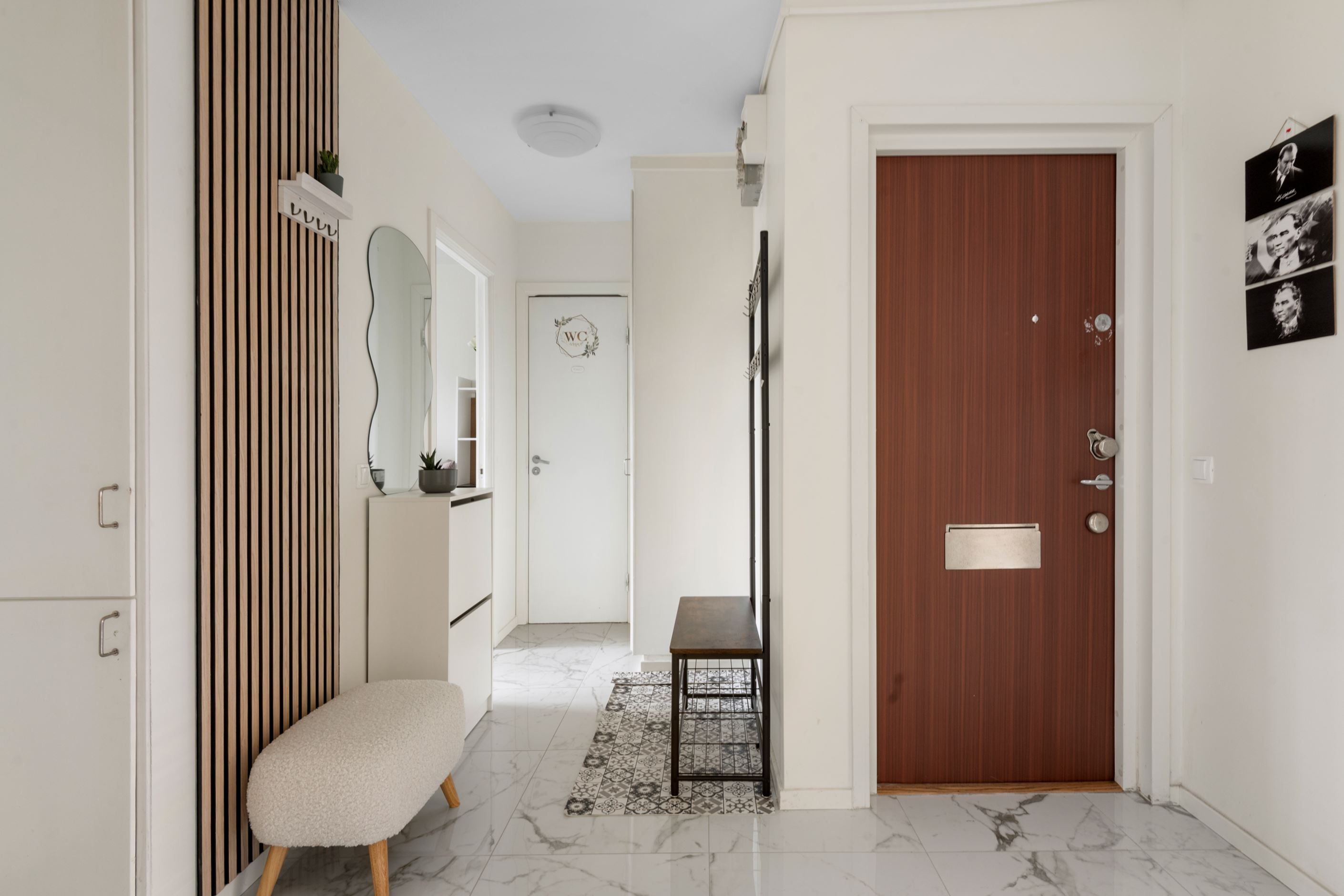 Bostaden välkomnar dig med en inbjudande och ljus hall som erbjuder goda avhängningsmöjligheter samt plats för förvaring. Vidare leds du in i det rymliga köket, här finns gott om skåpsförvaring, generösa arbetsytor och plats för en matgrupp, vilket gör det till en naturlig samlingspunkt för familj och vänner.