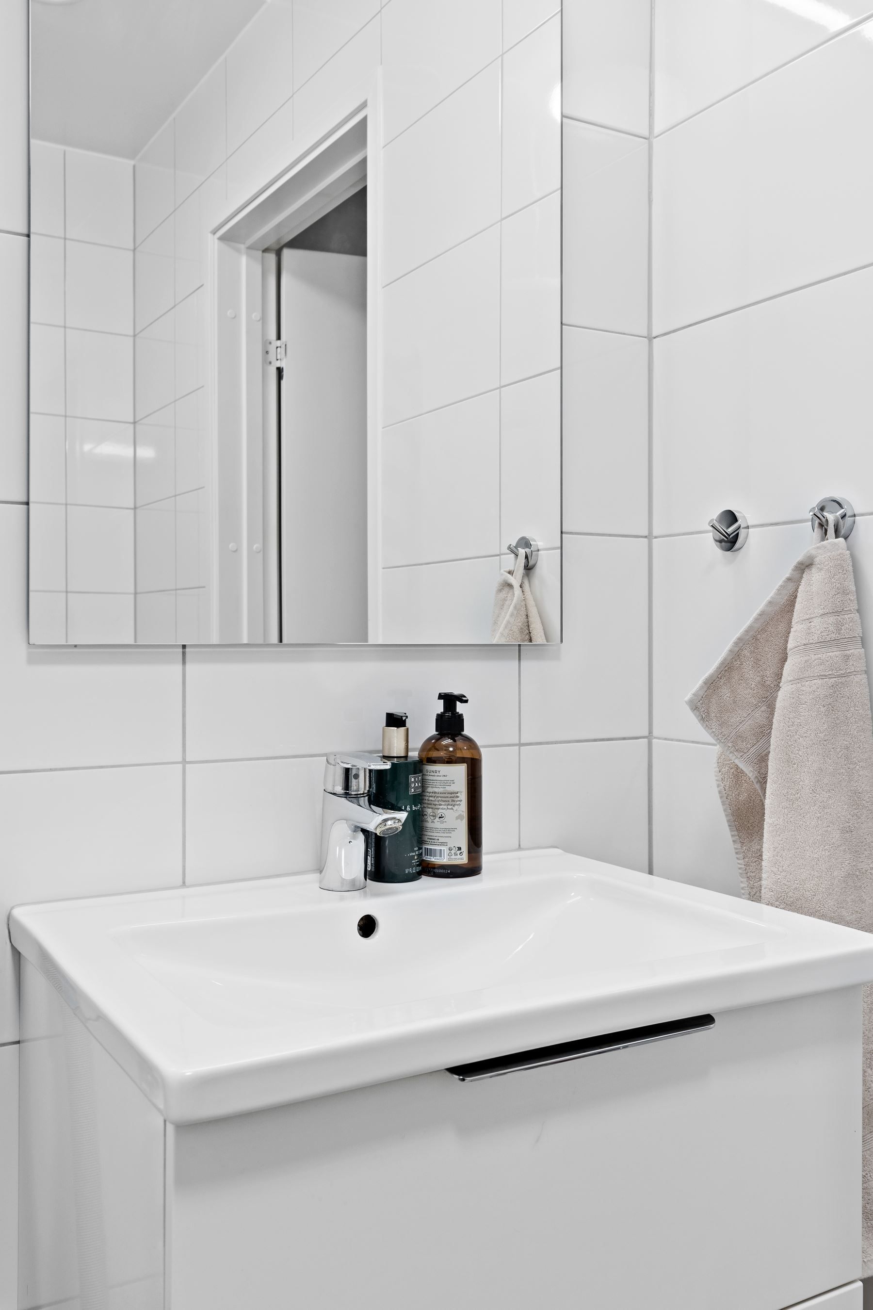 Den välkomnande hallen leder vidare till ett rymligt badrum med smarta förvaringslösningar och en kombinerad tvättmaskin/torktumlare. Det stilrena köket i modern grå kulör är fullutrustat med högkvalitativa vitvaror och har en öppen planlösning mot vardagsrummet. Här skapas en naturlig plats för sociala sammanhang och avkoppling, med gott om utrymme för både familj och vänner.