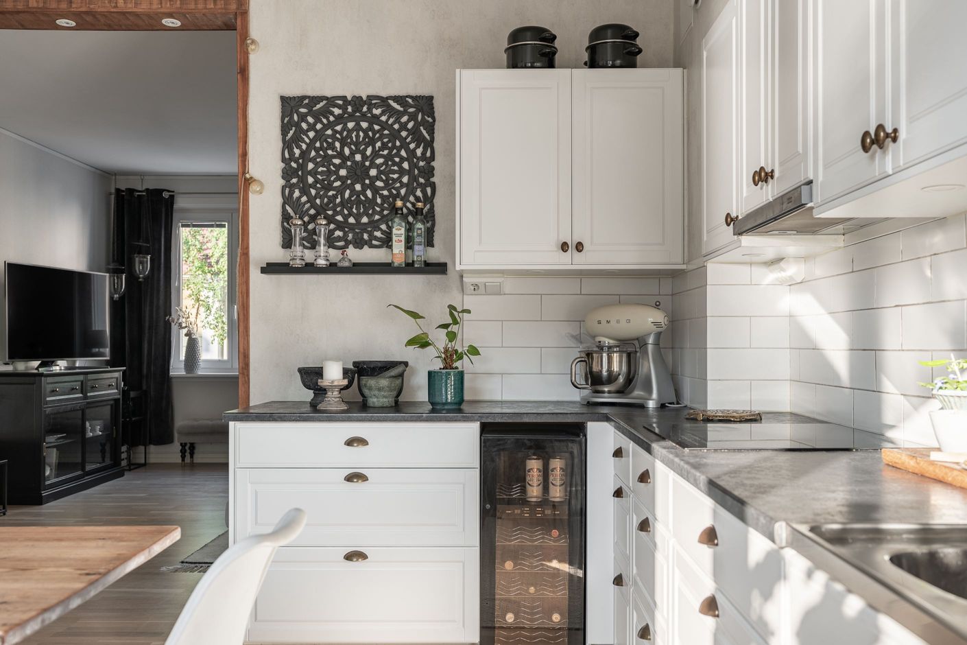 Köket är en verklig pärla, idealiskt för sociala sammankomster och matlagningsglädje. Det moderna köket, med komplett maskinpark, erbjuder gott om bänkyta och förvaringsmöjligheter. Stora fönster släpper in rikligt med förmiddagsljus och ger en rogivande utsikt mot den stillsamma innergården.