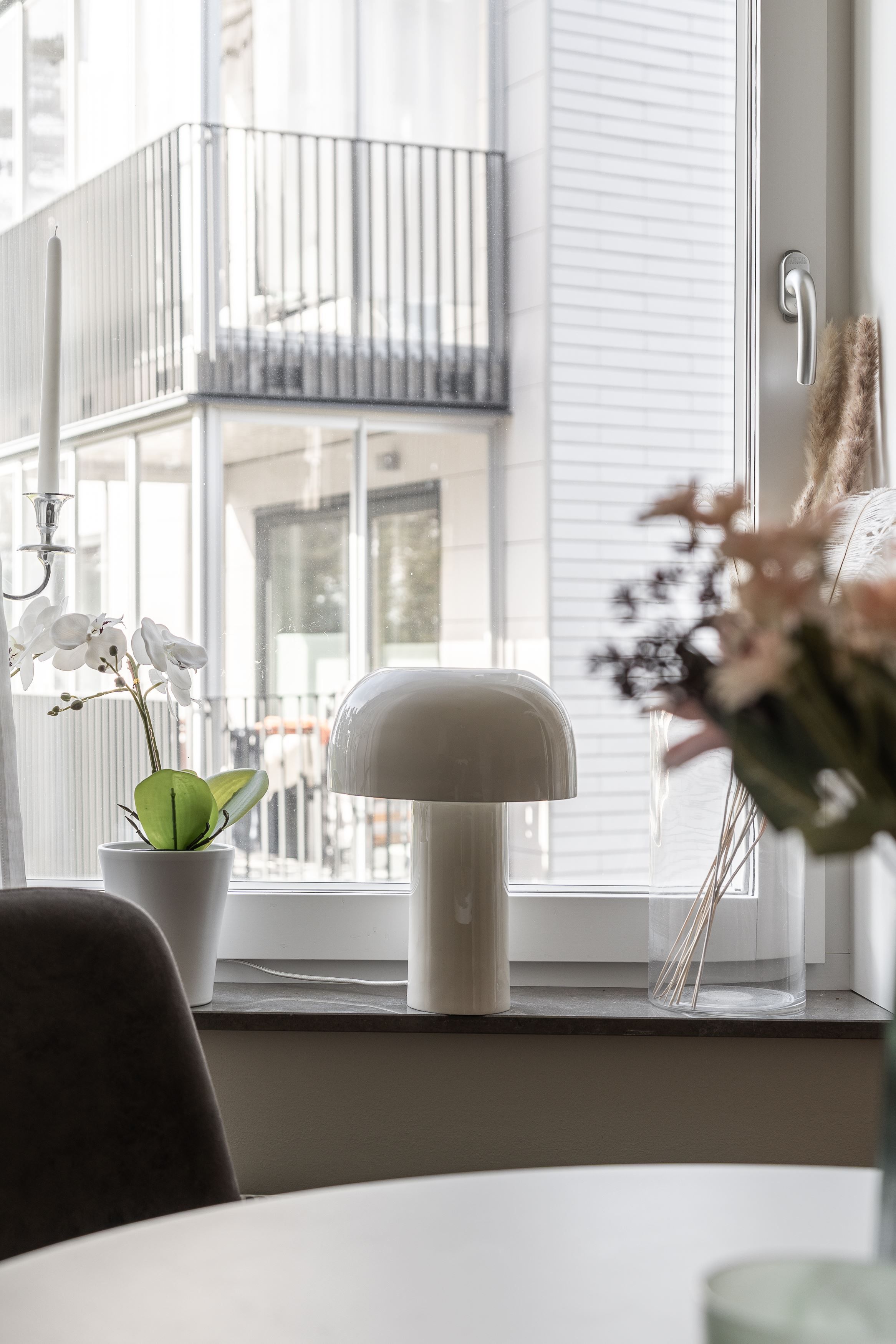 Från vardagsrummet nås lägenhetens fantastiska inglasade balkong, här kan du njuta från tidig vår till sen höst. Badrummet är smyckat med snygga kakel, klinker och en tvättmaskin/torktumlare med arbetsbänk ovanpå, som underlättar vardagslivet.