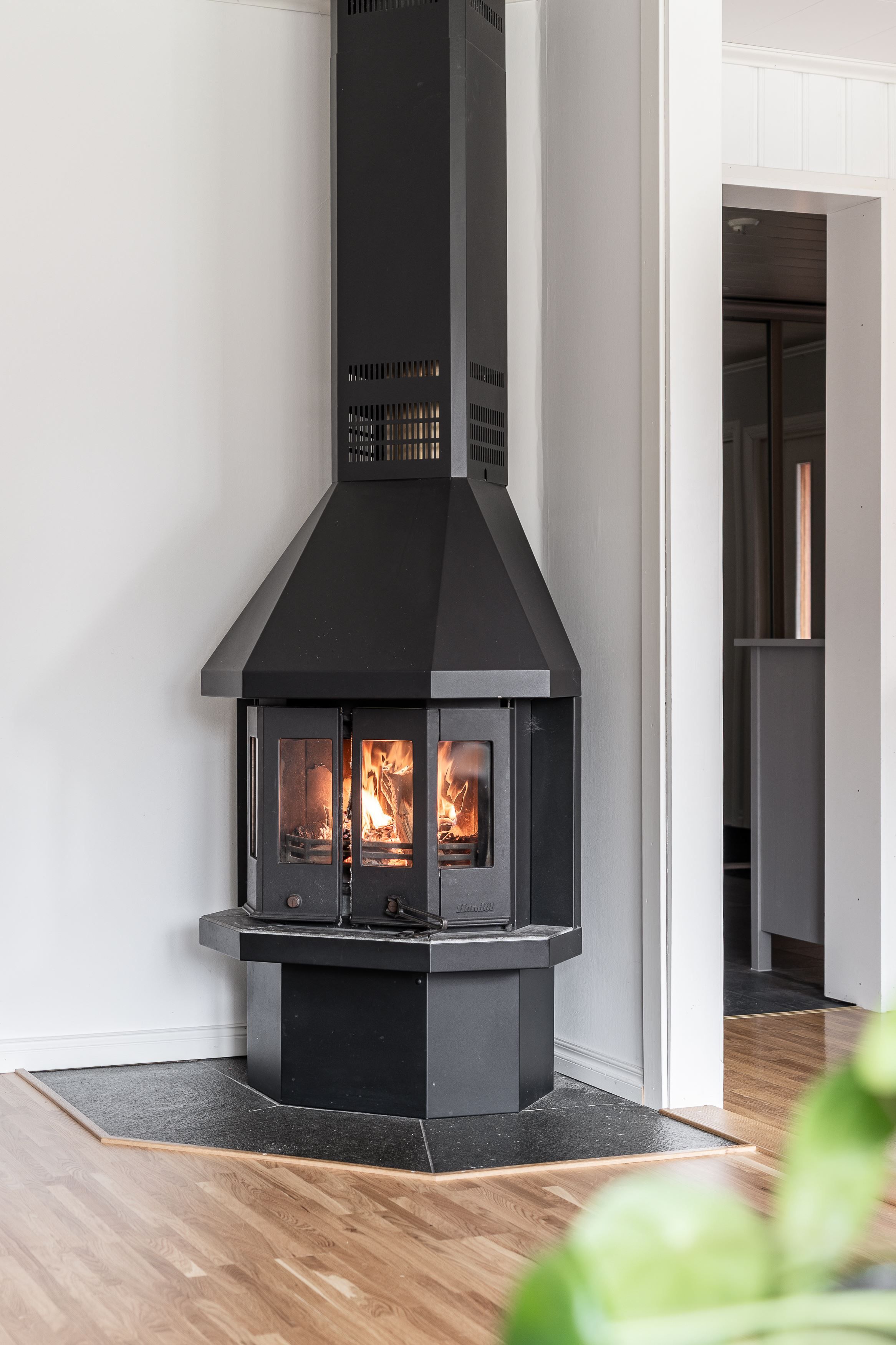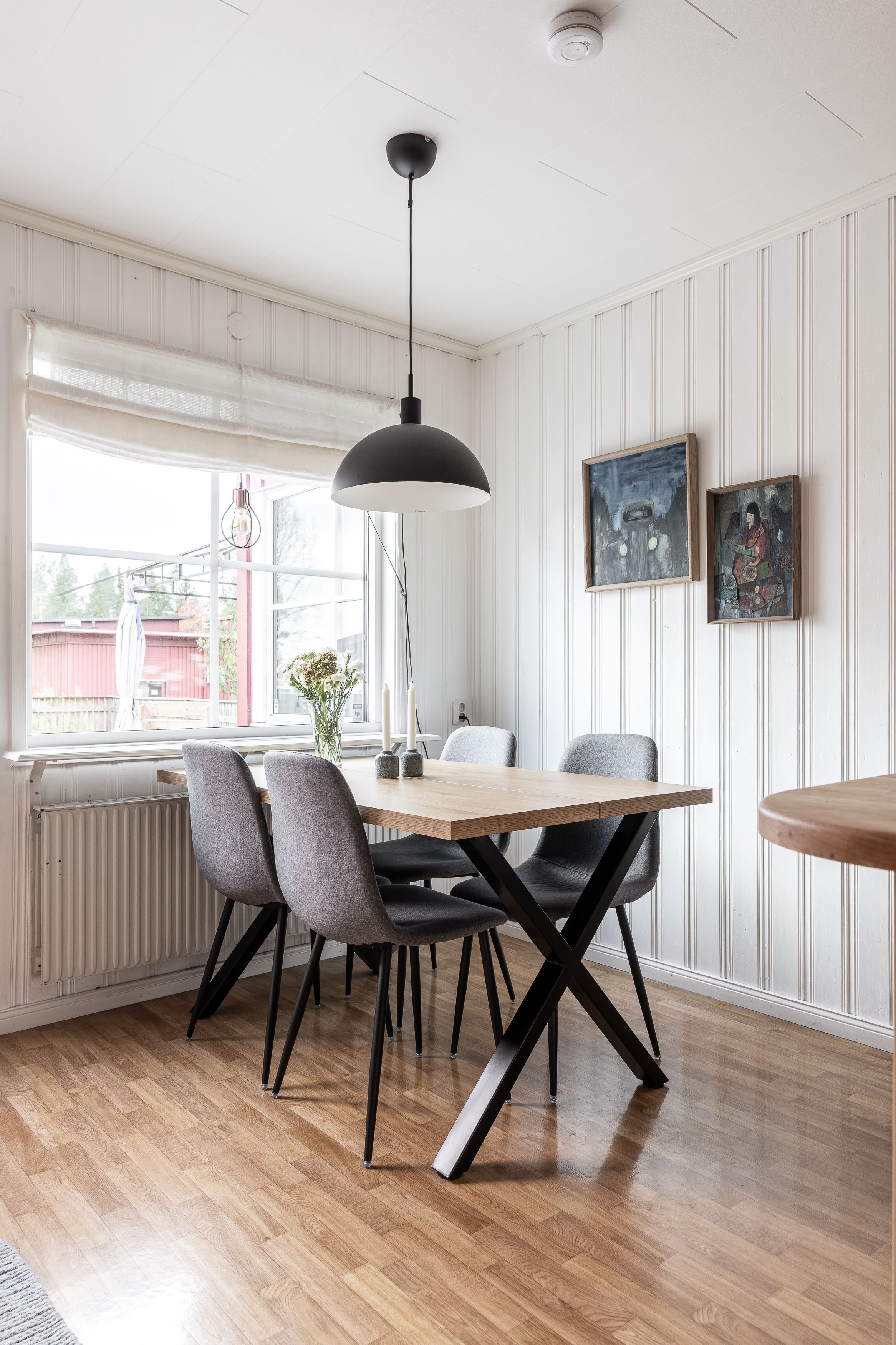 Det luftiga vardagsrummet ligger i öppen planlösning med köket och blir snabbt hemmets naturliga samlingspunkt med stämningsfull braskamin som sprider värme och mys under årets kallare månader. Här finns gott om plats för både en stor soffgrupp och en matplats där familj och vänner gärna samlas. Köket är välutrustat med bra arbetsytor och gott om förvaring – perfekt för både vardagsmatlagning och festliga middagar. Intill fönstret finns plats för ett matbord där morgonkaffet kan avnjutas i morgonsolen.