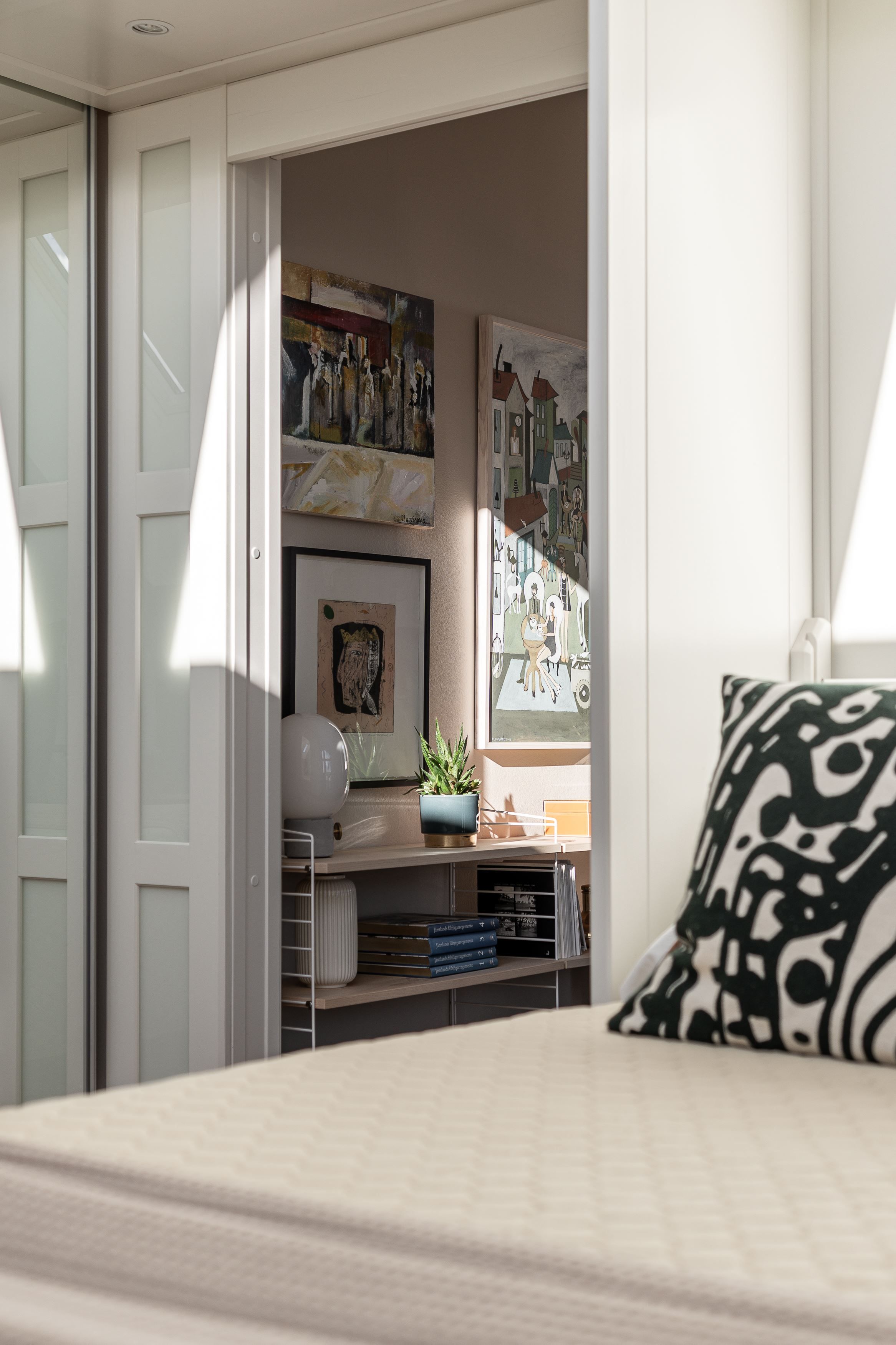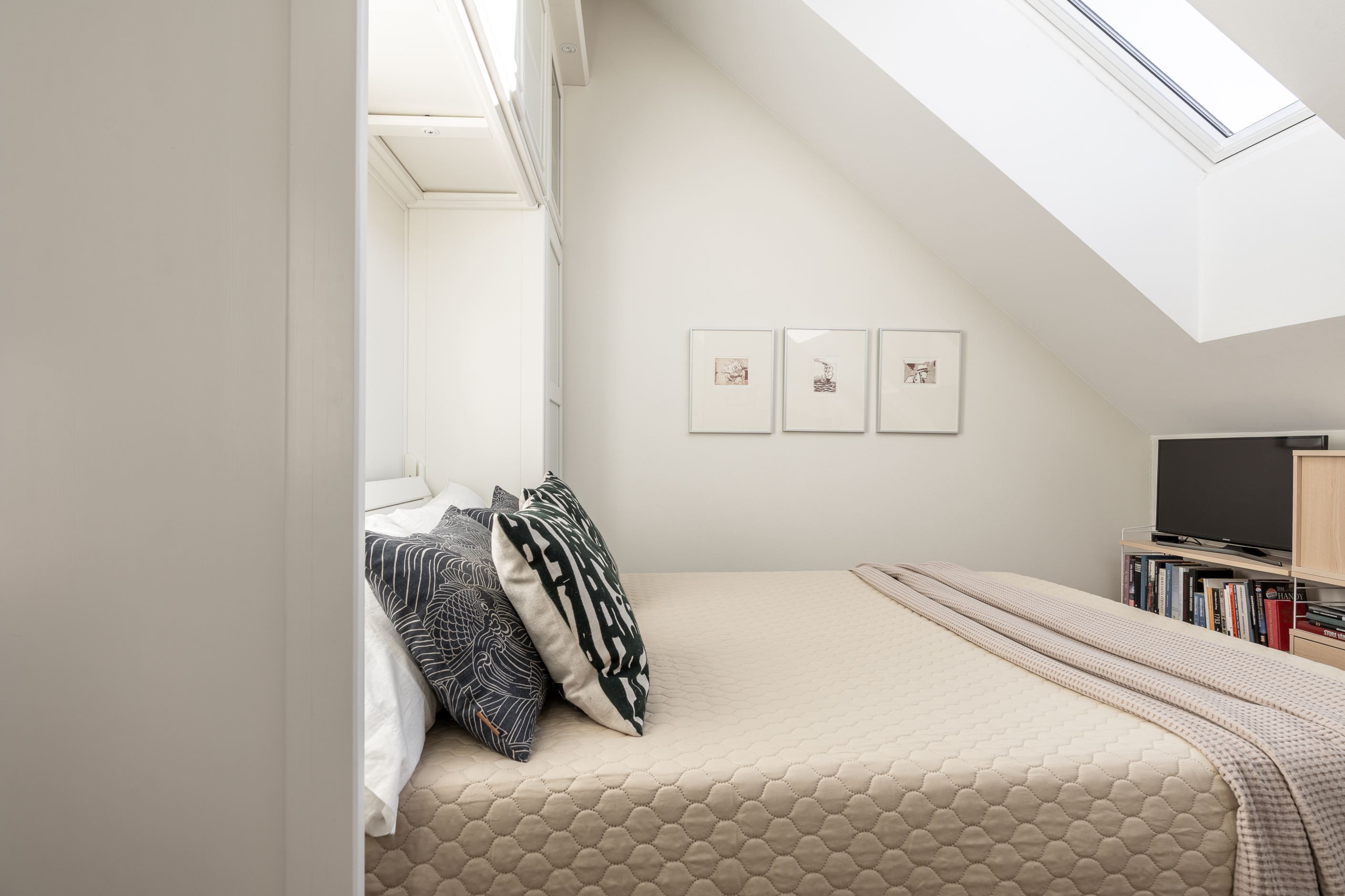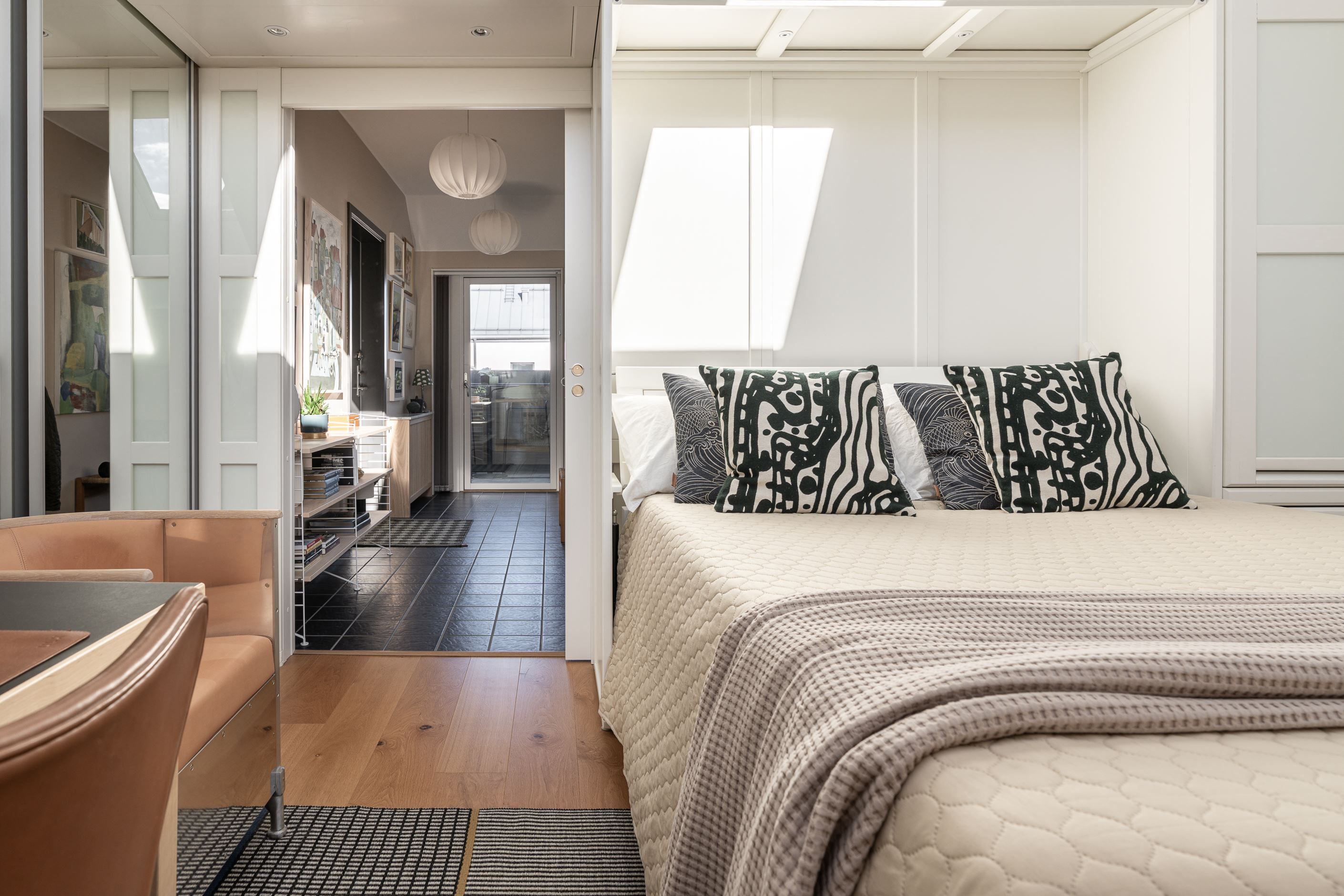 Sovrummet är rofyllt och placerat för maximal avskildhet. Med en platsbyggd förvaring och en fällbar säng kan man alternera rummet för hur den skall brukas.