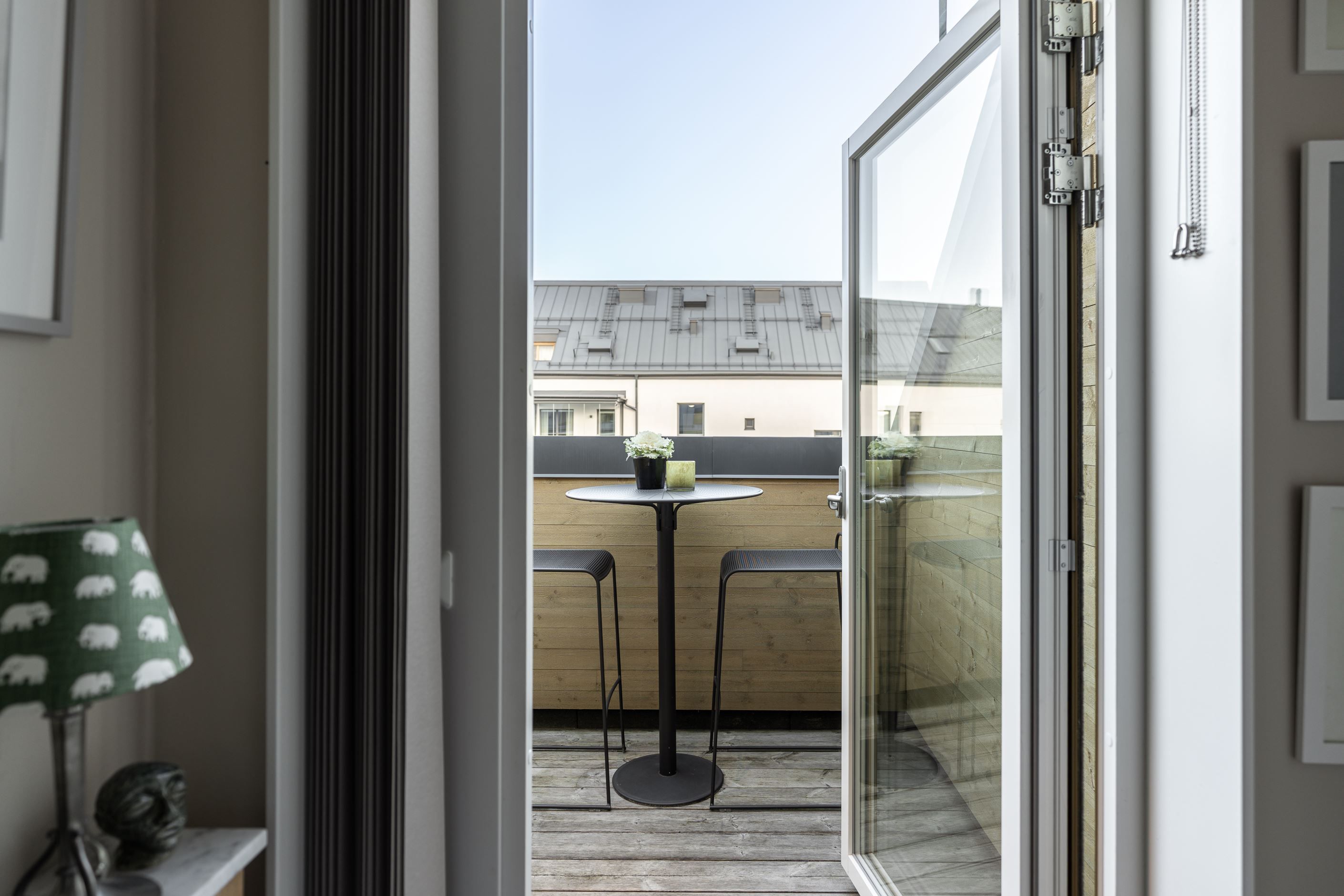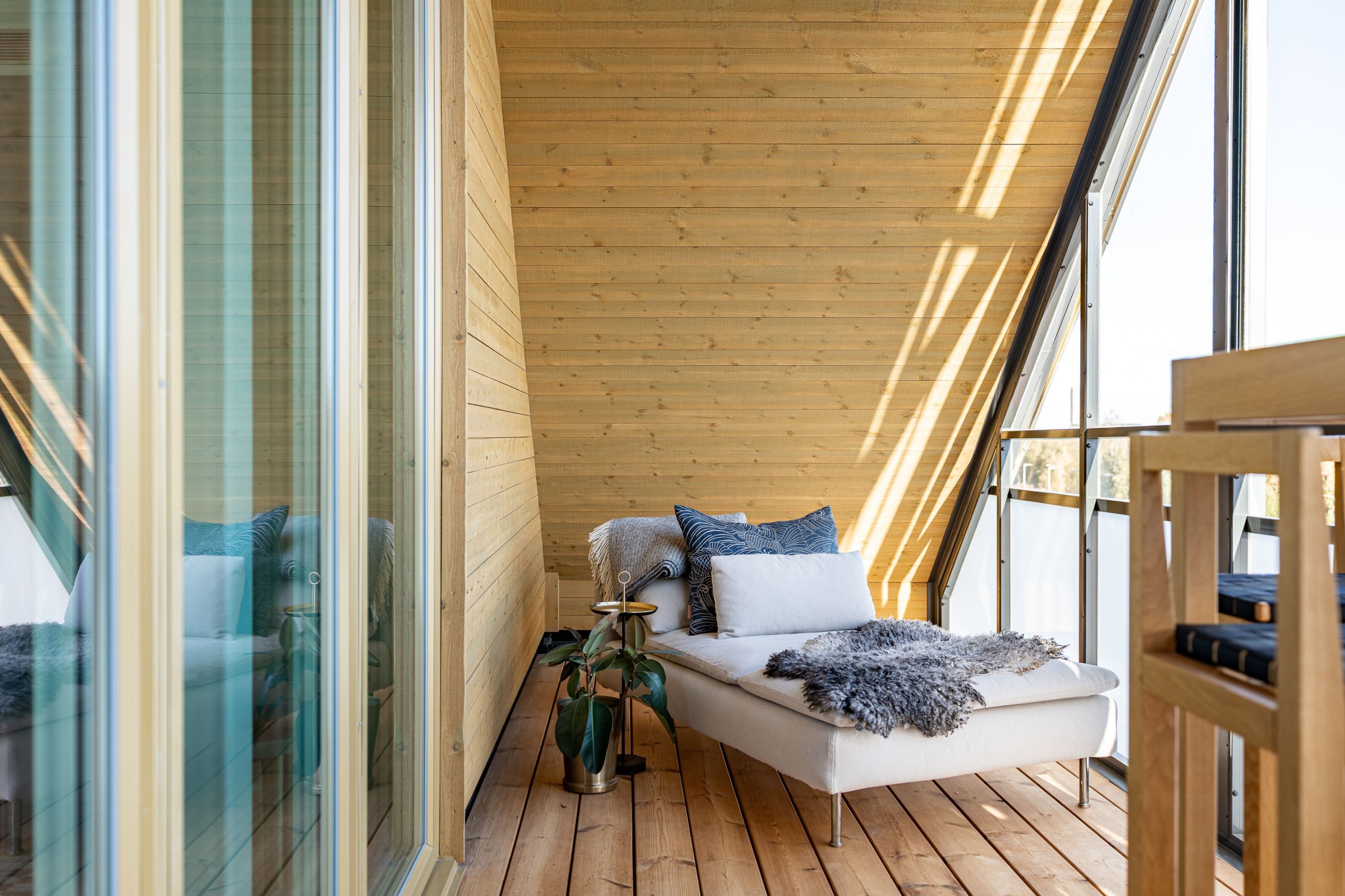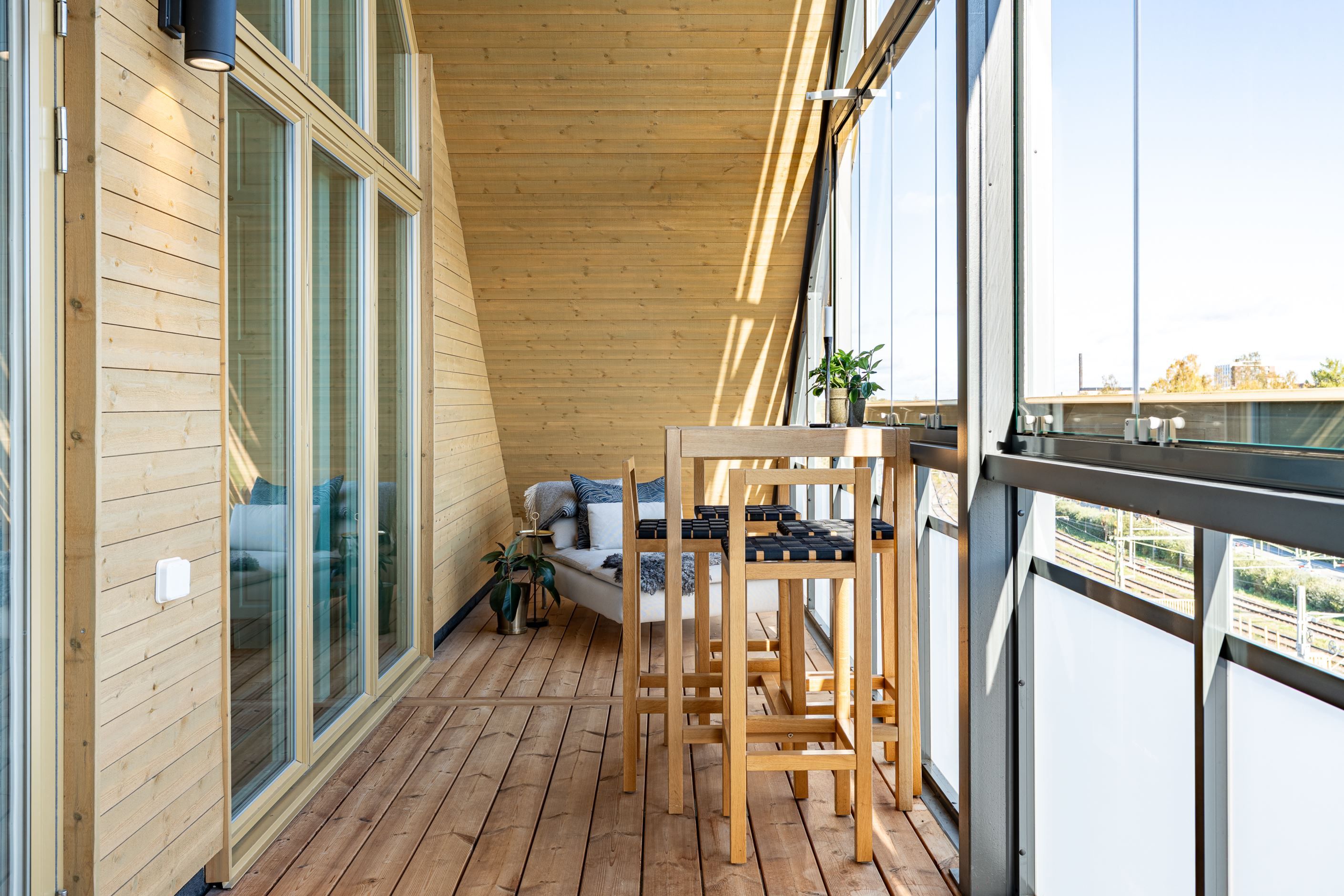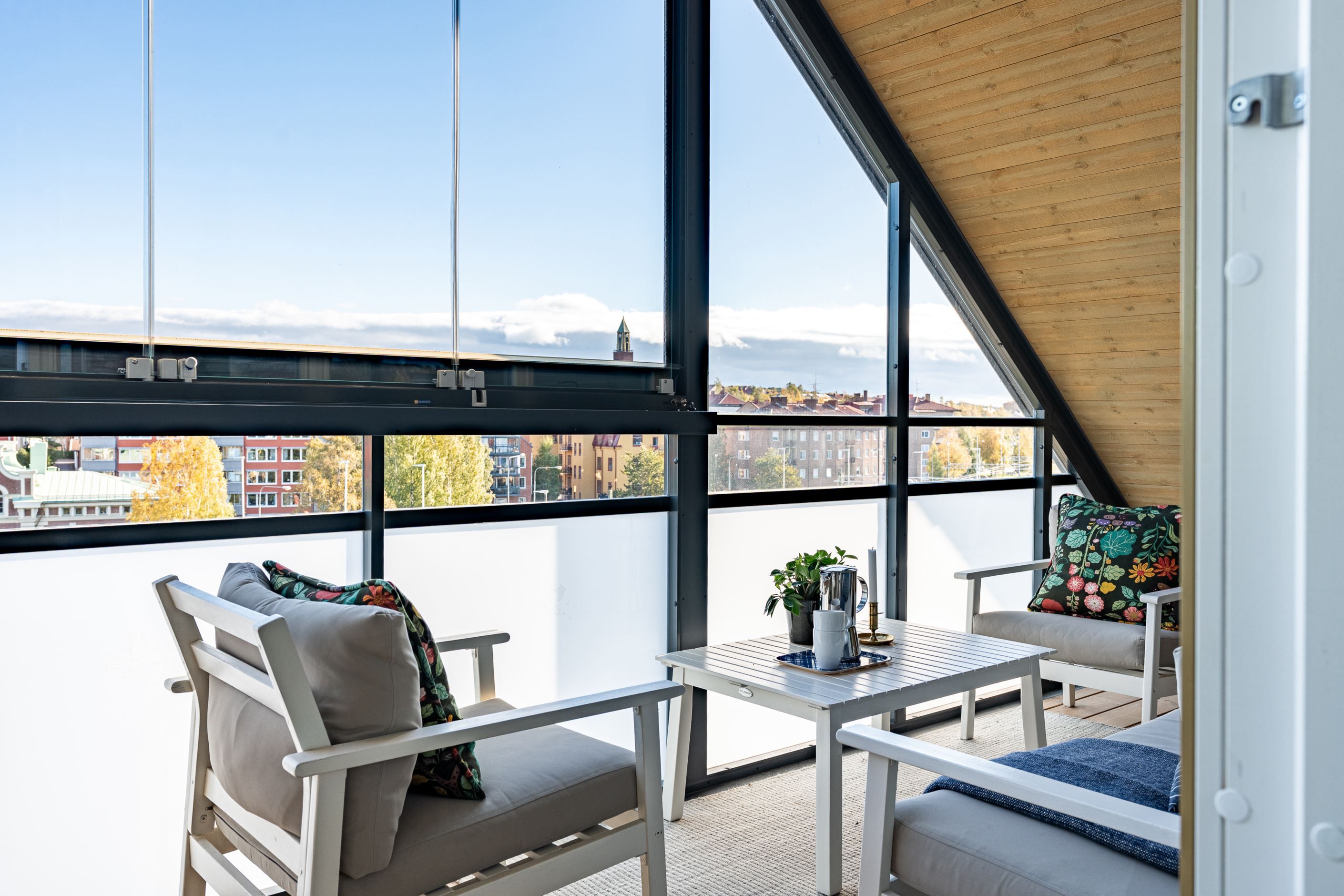 Den generösa inglasade balkongen blir en naturlig förlängning av vardagsrummet och fungerar lika bra året runt.