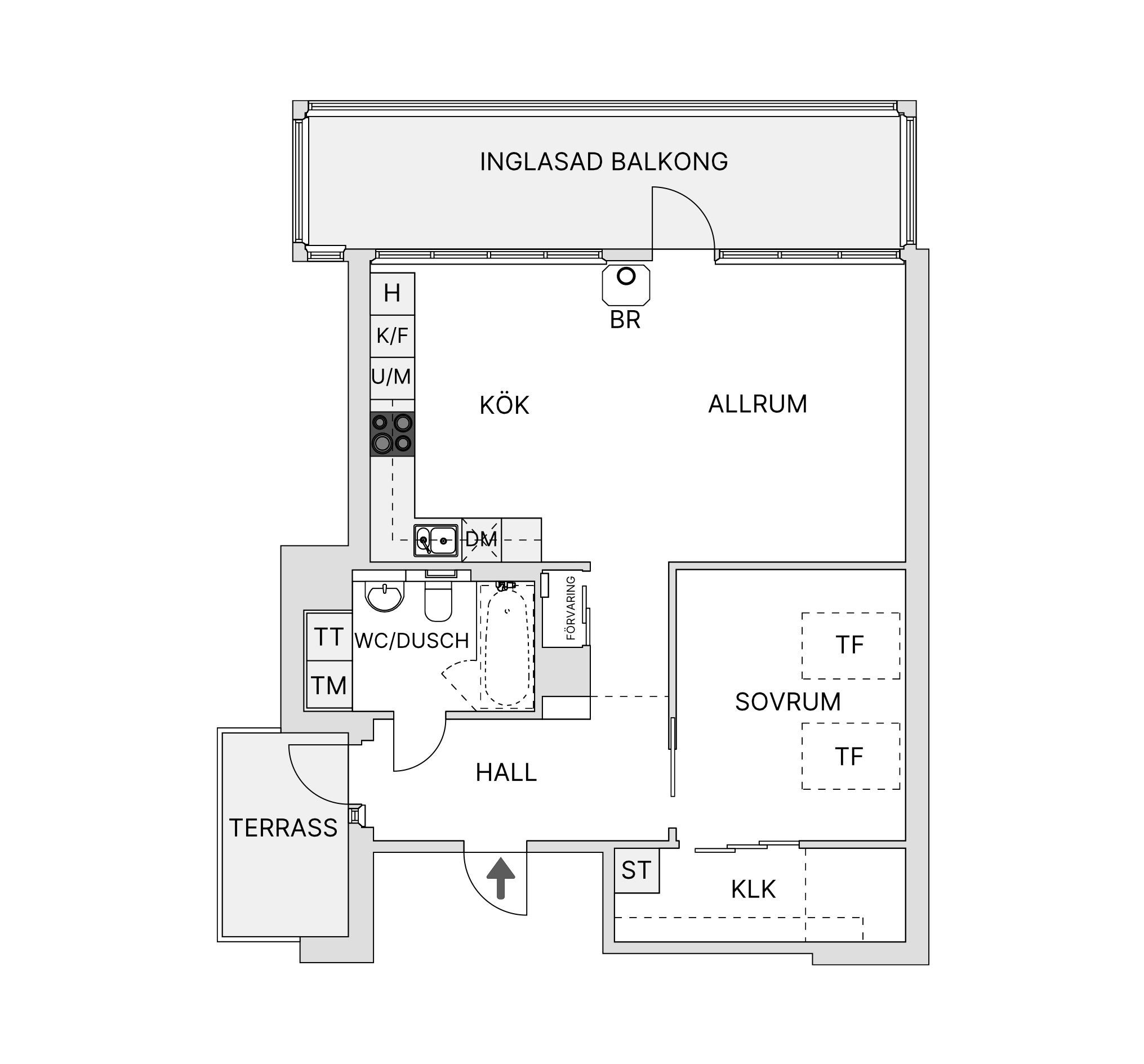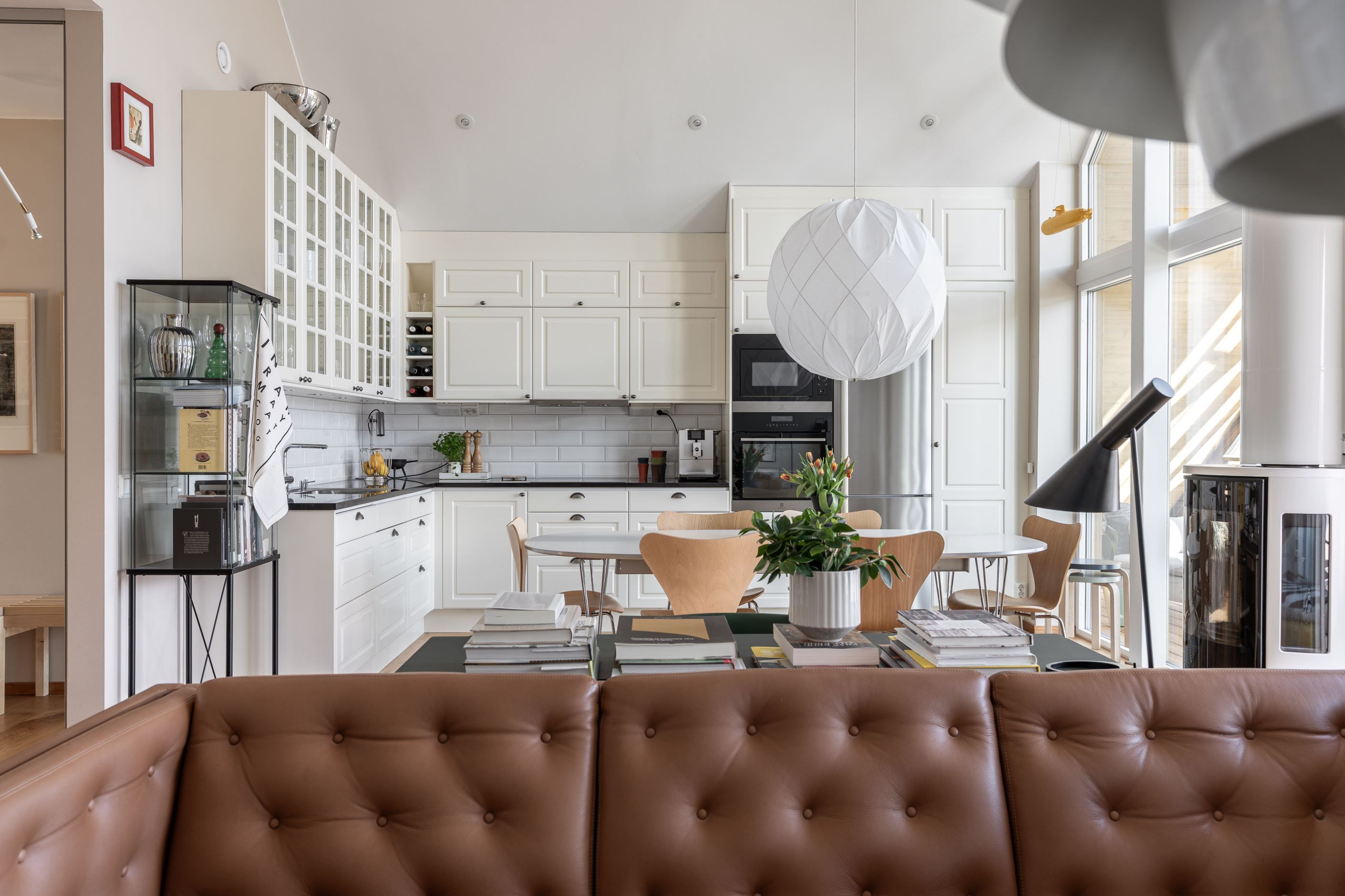 Bostadens planlösning är smart och stilfull och där varje kvadratmeter är väl utnyttjad. Köket bjuder in till sociala middagar medans vardagsrummet blir den självklara samlingsplatsen. Den öppna planlösningen mellan köket och vardagsrummet bjuder på en otrolig takhöjd med närmare 5 meter upp till nock, vilket skapar en öppen och luftig känsla som är svår att matcha. I mitten av rummet återfinns en ståtlig kamin som förgyller de mörkaste och kallaste kvällarna och ger er maximal trivsel.