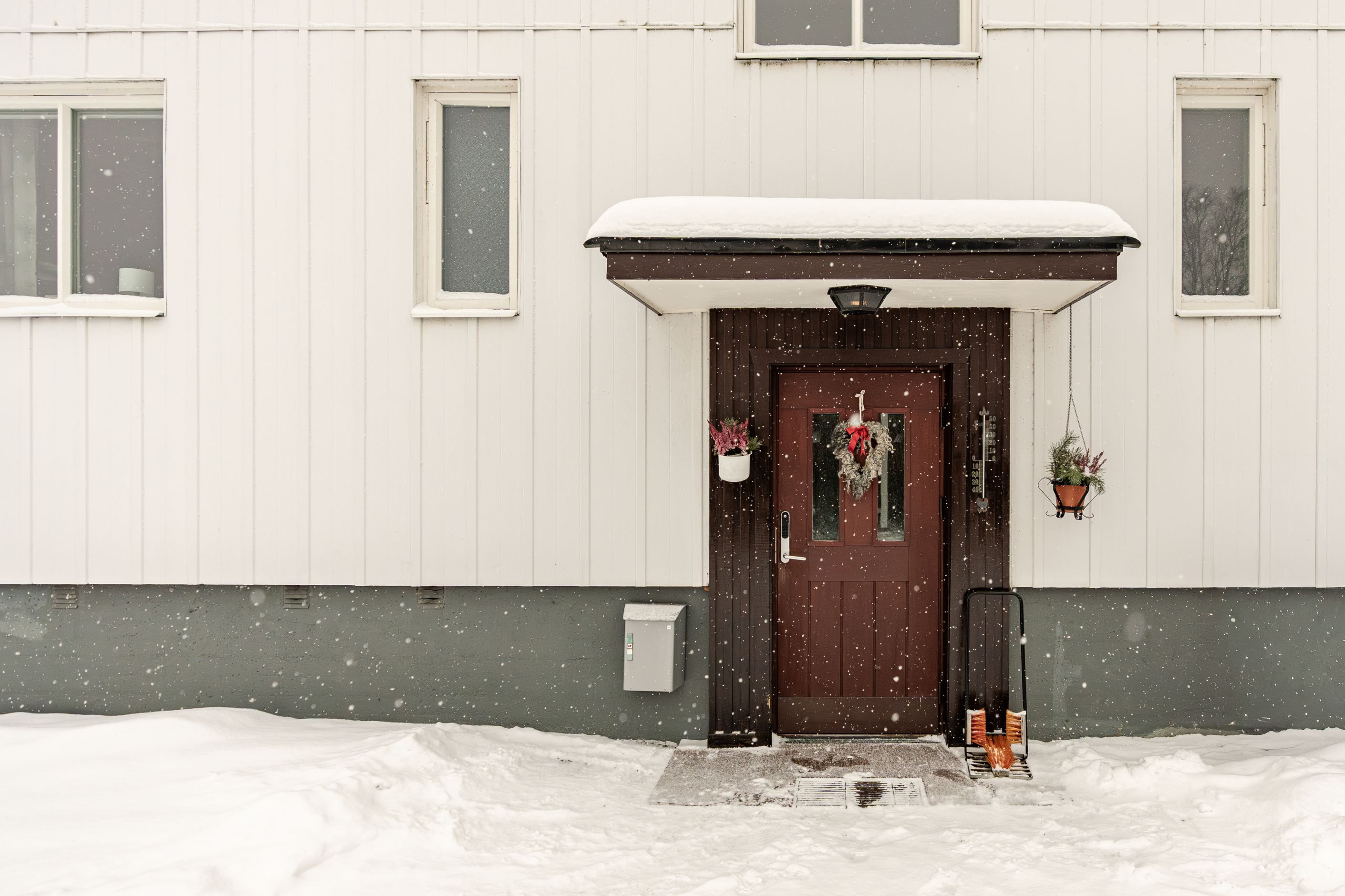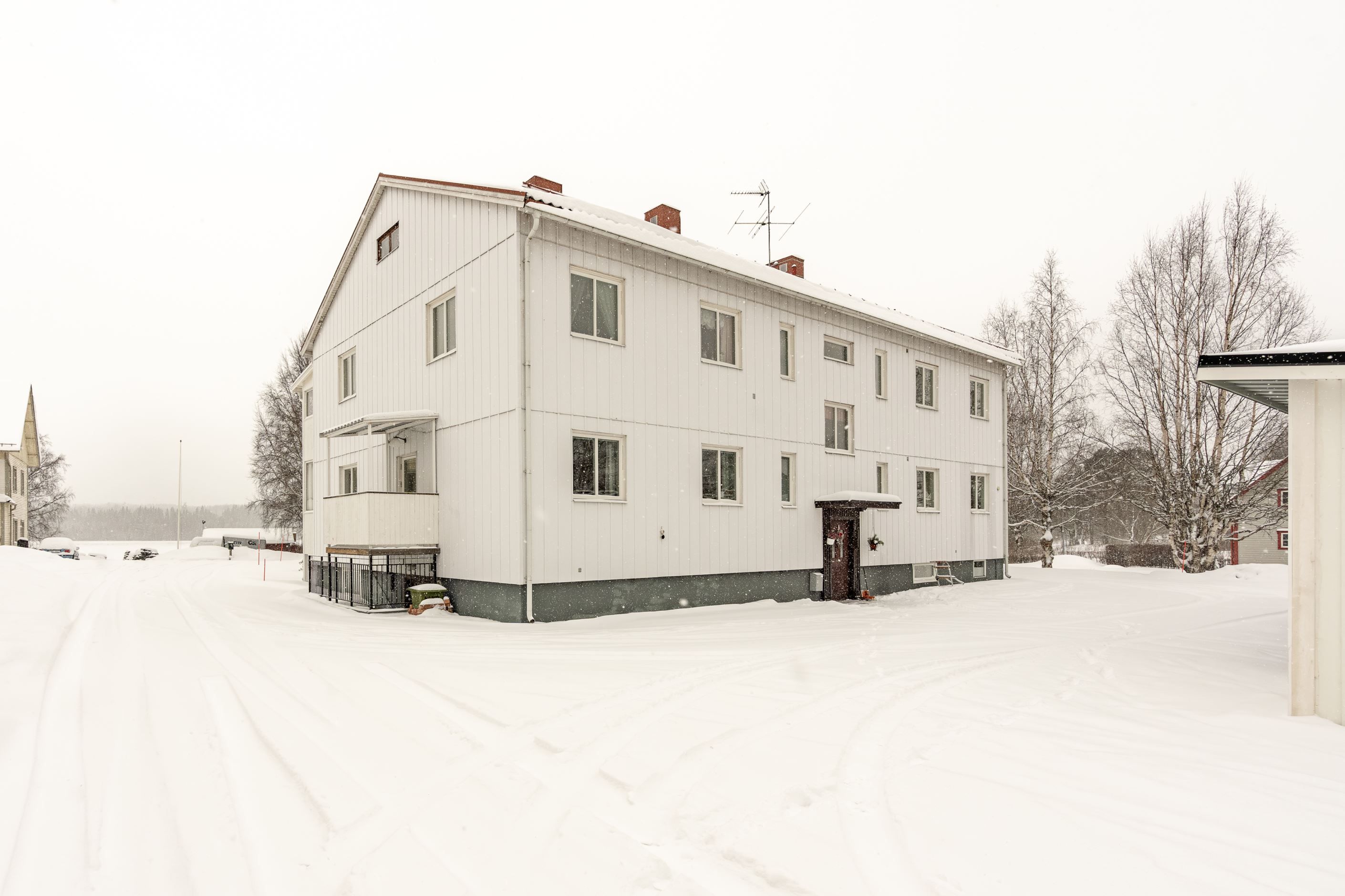 Till lägenheten hör ett stort vindsförråd och ett praktiskt matkällarförråd. Carport finns utanför fastigheten och ingår till bostaden. I källaren finns dessutom hobbyrum och tvättstuga.