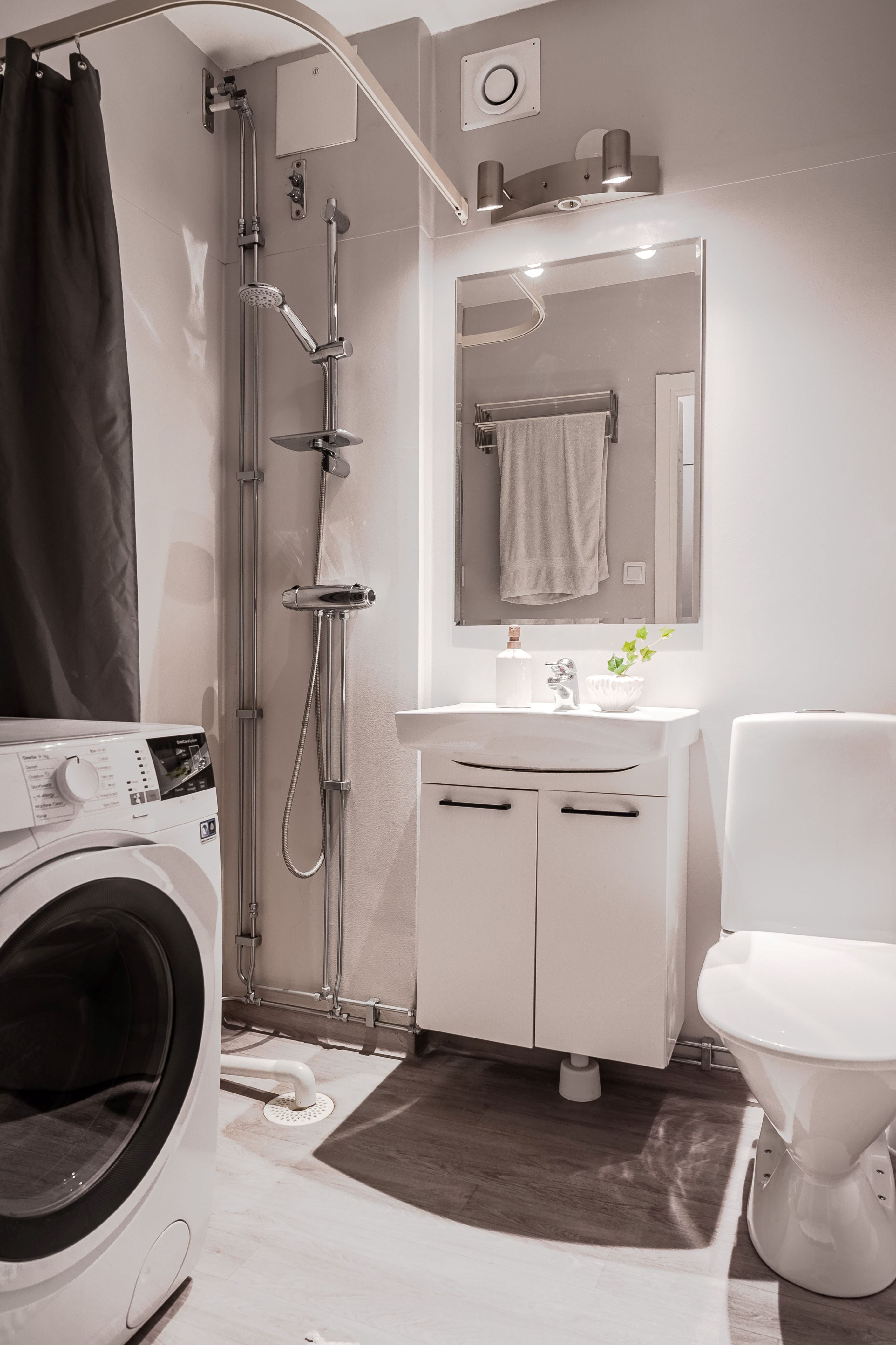 Till vänster om entrén finner du ingången till ett modernt och nyligt renoverat badrum med ljust grå väggar och en snygg grå våtrumsmatta. Här finner du en vit kommod perfekt för småförvaring och en tillhörande spegel ovanför. Vore inte detta nog så har du också din alldeles egna tvättmaskin installerad så du slipper känna stressen över att följa tiderna i tvättstugan om du inte vill.
