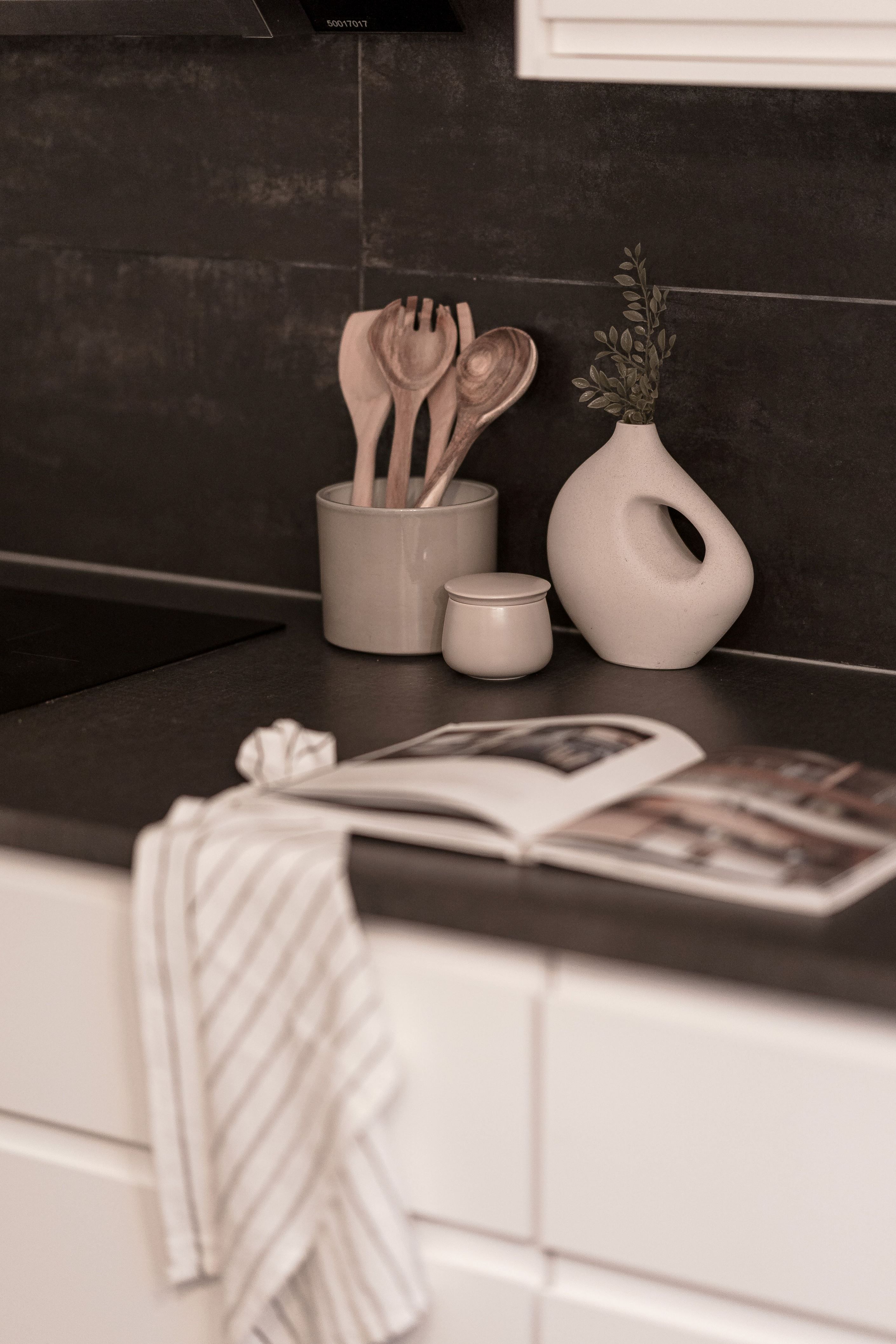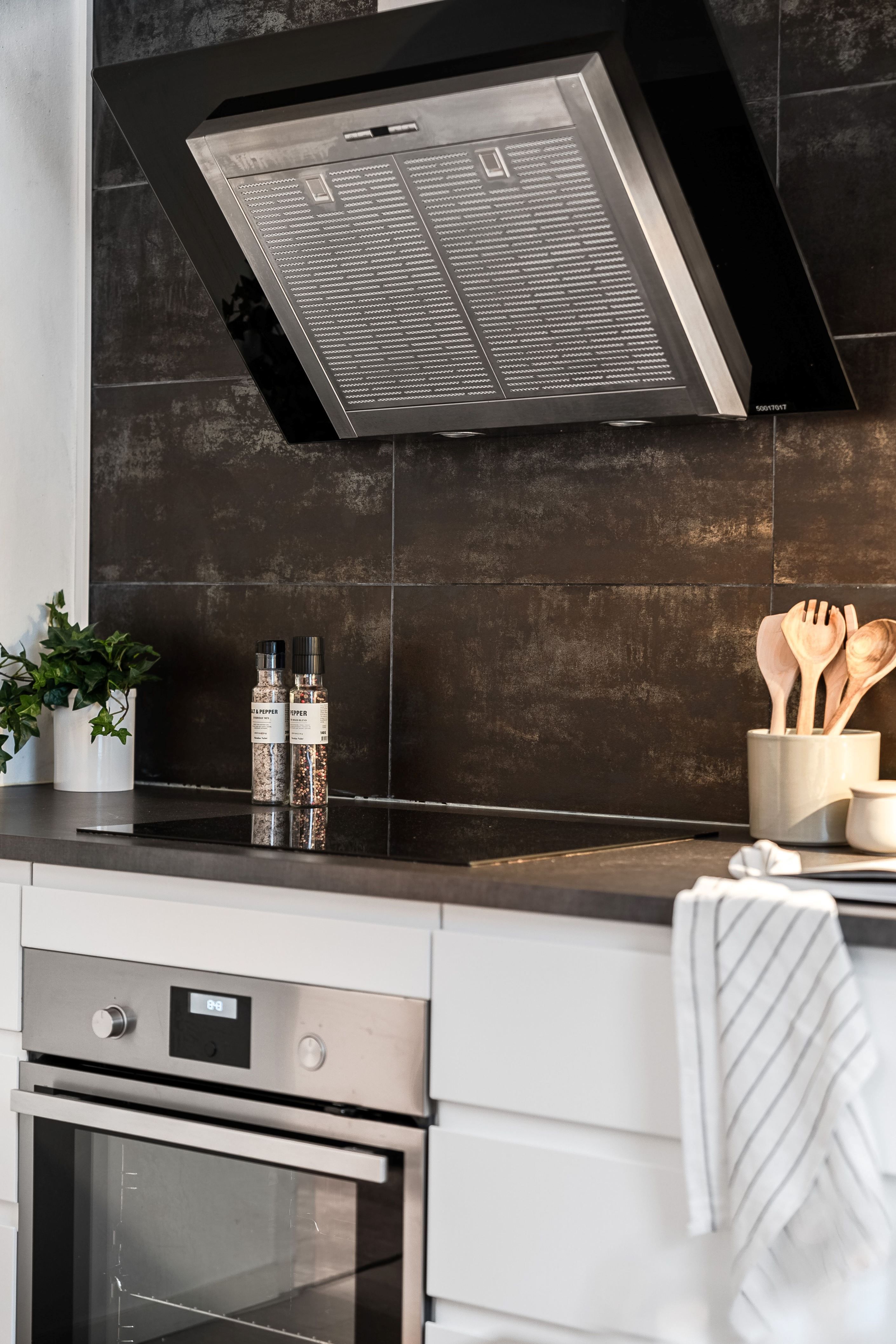 Rakt fram så ligger sedan lägenhetens smakfulla kök. Köksskåpen är släta och vita samt utan beslag vilket bidrar till en stilren och estetiskt tilltalande look. Maskinparken är i rostfritt stål och bänkskivan är i en mörkare grå nyans. Här finns gott om plats för porslin och stora bänkytor för den som uppskattar att laga goda måltider. Köksbord ryms utan problem invid stort fönsterparti och på golvet ligger ett ljust laminatgolv som löper genom hela bostaden sömlöst bortsett från badrum och vardagsrum.
