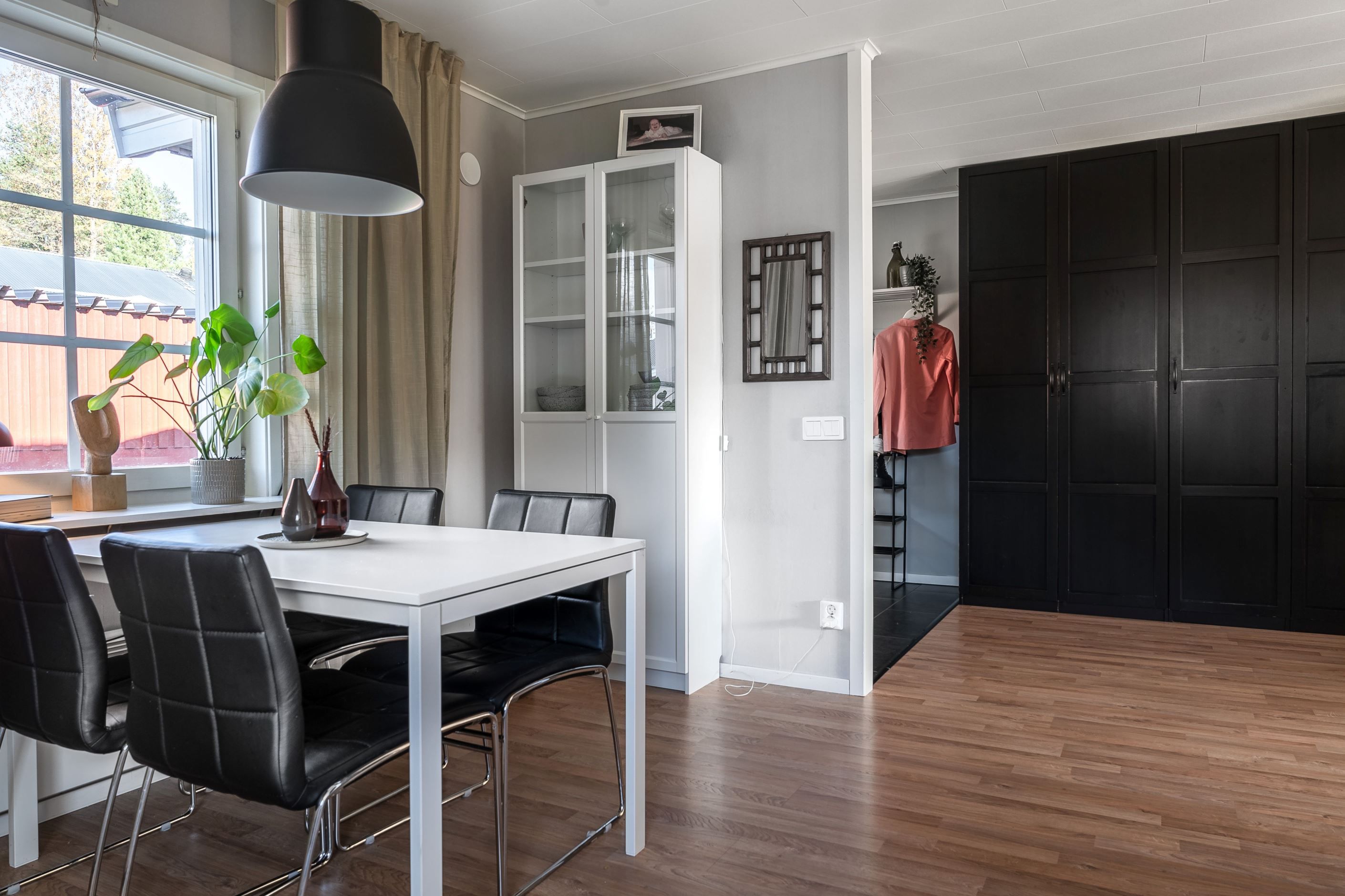 I och med placering på gavel så får du här ljusinsläpp från både väst och norr och skapar därför ett otroligt härligt utrymme att vistas i. Intill ett större fönsterparti finns plats för matplats.