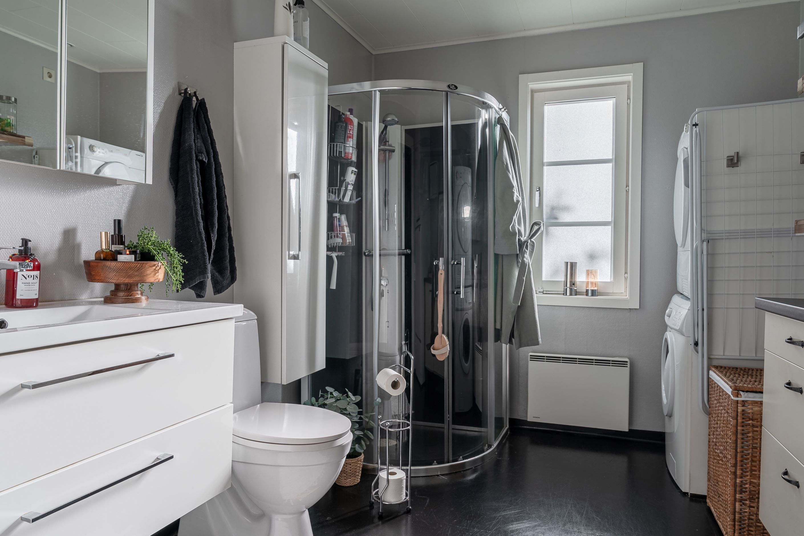 Badrummet är fräscht och praktiskt utrustat, och bostaden erbjuder dessutom bra förvaring i både garderober och övriga utrymmen.
