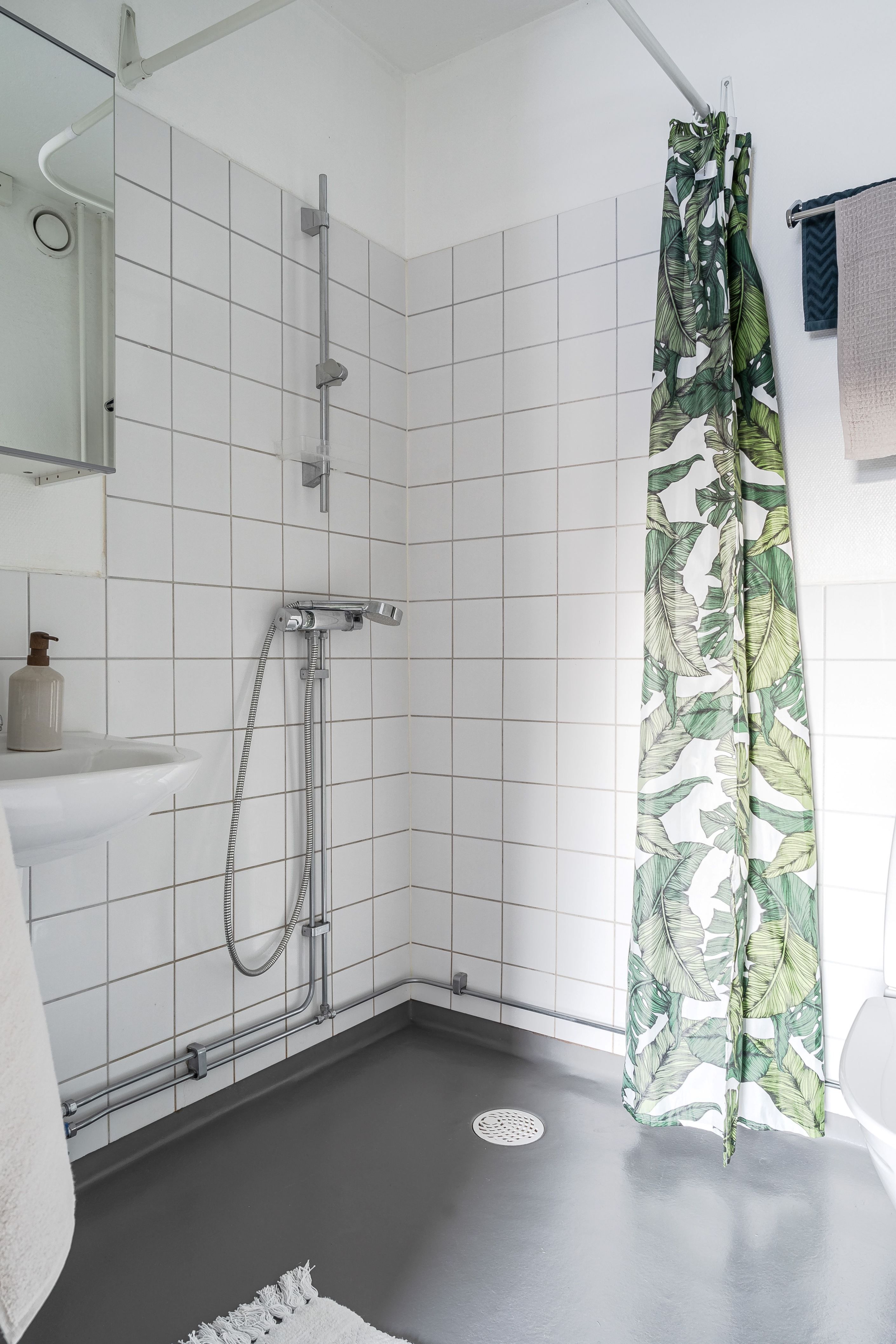 På golvet ligger en våtrumsmatta som är målad i grått och väggarna är halvt kaklade i vitt med en vitmålad väv ovanför.